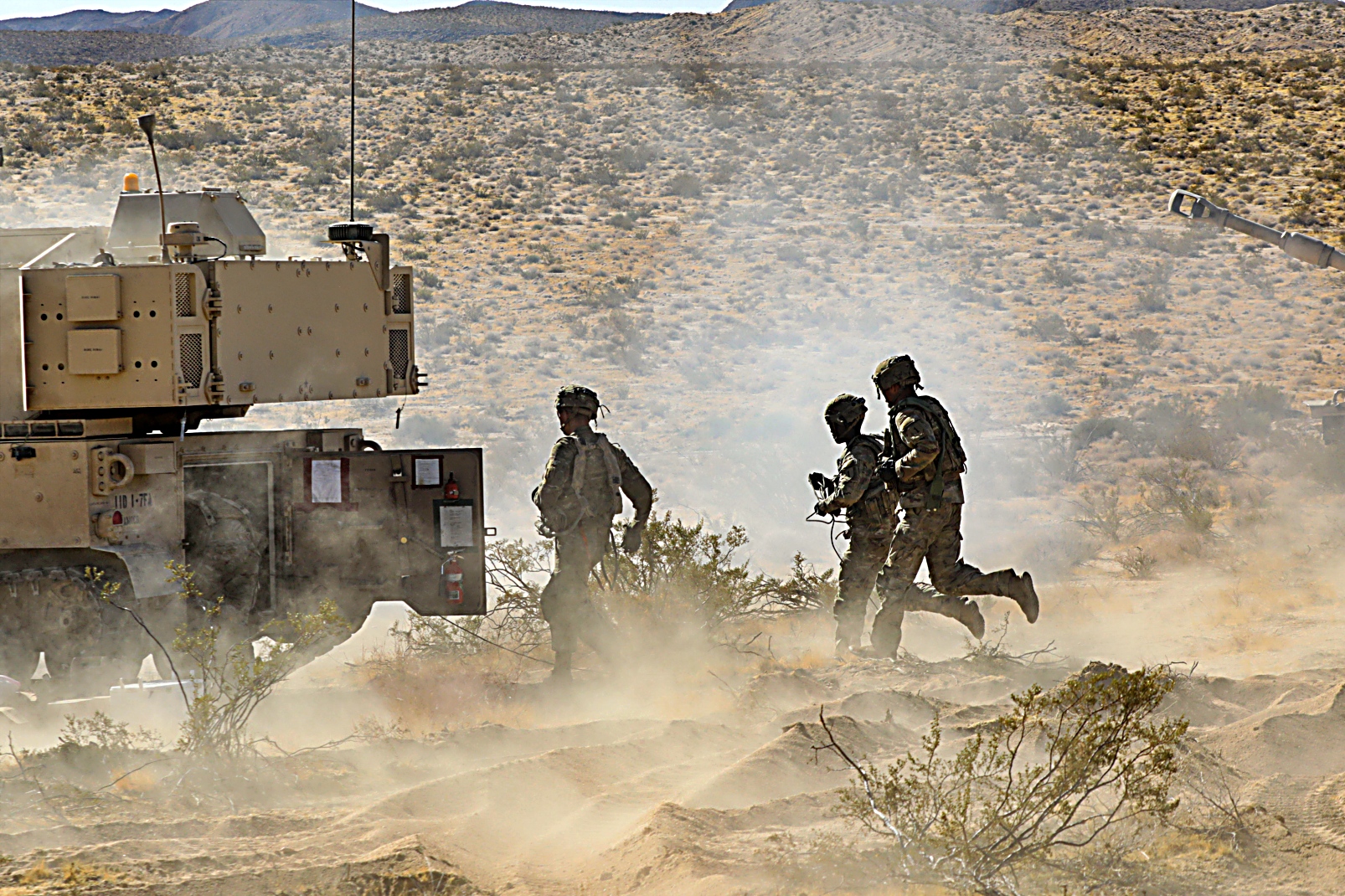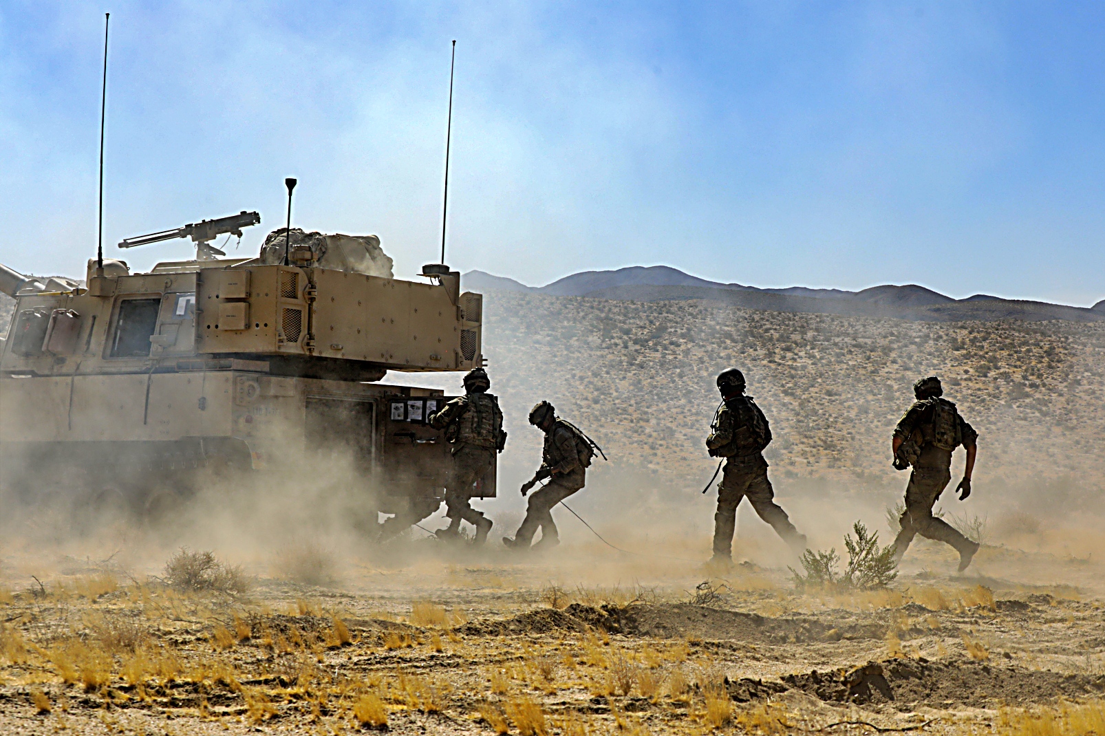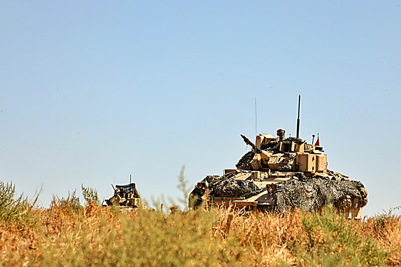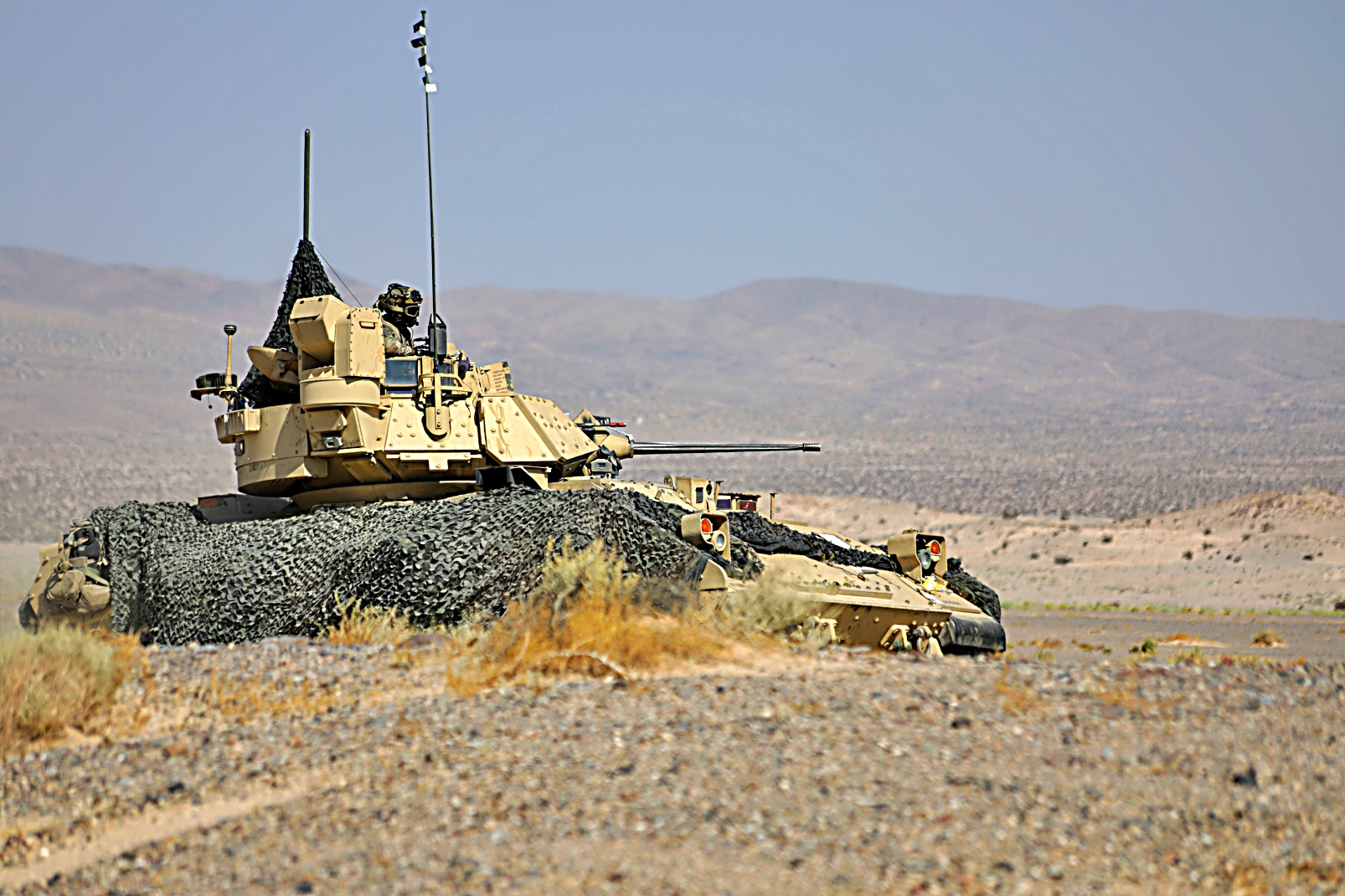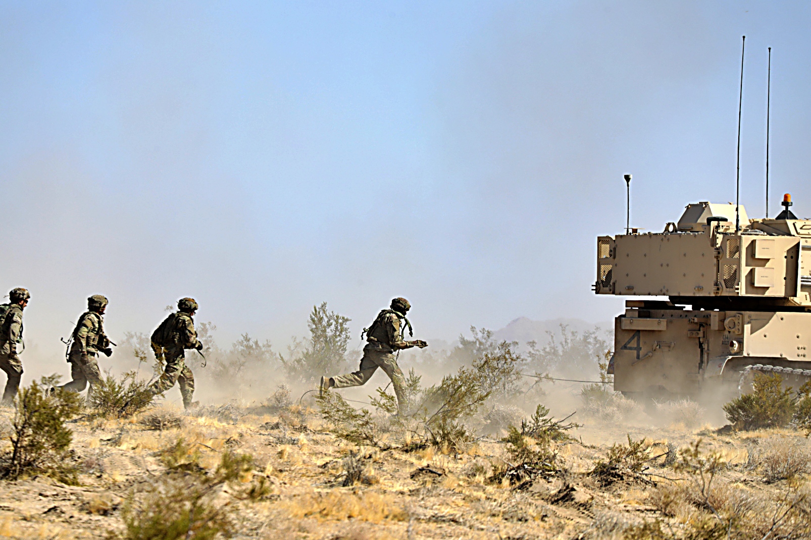 2024년 9월 12일부터 26일사이, 캘리포니아주 Fort Irwin 소재 국립훈련센터에서 진행된 Rotation 24-11 훈련 중, 미 육군 제1보병사단 제2기갑여단전투팀 제70기갑연대 제2대대 소속 Bradley 전투장갑차와 M1A2 전차가 기동하며 훈련중이다.