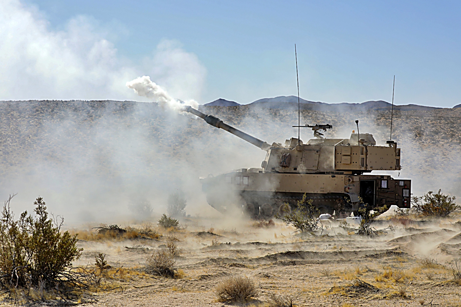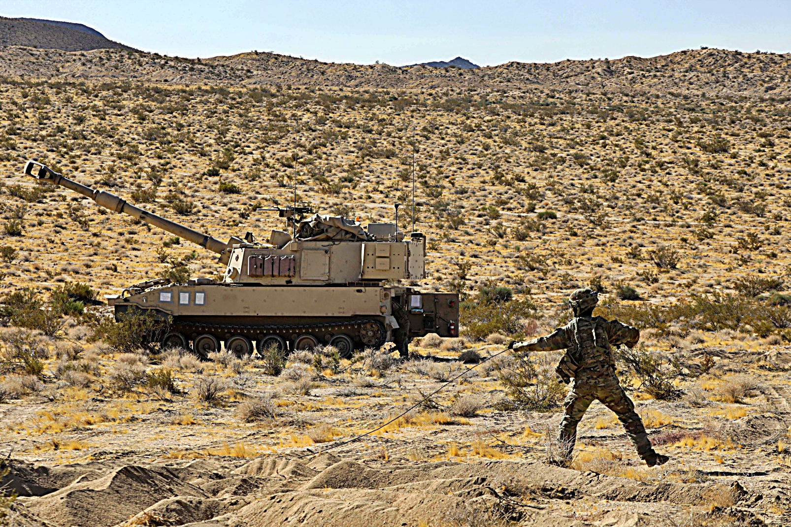 2024년 9월 12일, Rotation 24-11 훈련 중, 제1보병사단 제2기갑여단 전투팀 제7야전포병연대 제1대대 소속 Paladin 자주포가 사격훈련을 실시하고 있다.
