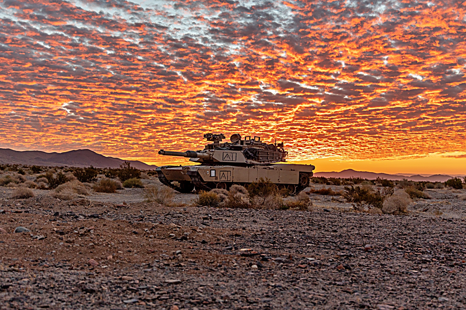 2024년 9월 19일, Rotation 24-11 훈련 중, 제1보병사단 제2기갑여단 전투팀 제63기갑연대 제1대대 M1 Abrams 전차가 석양아래 방어 자세를 취하고 있다.