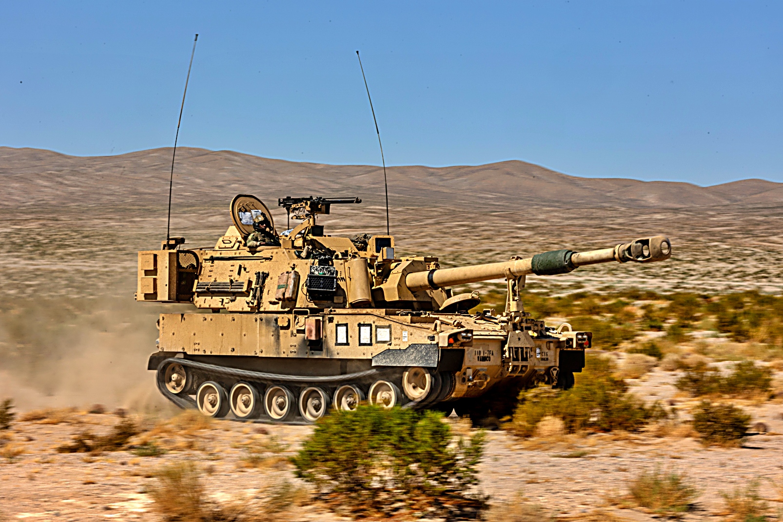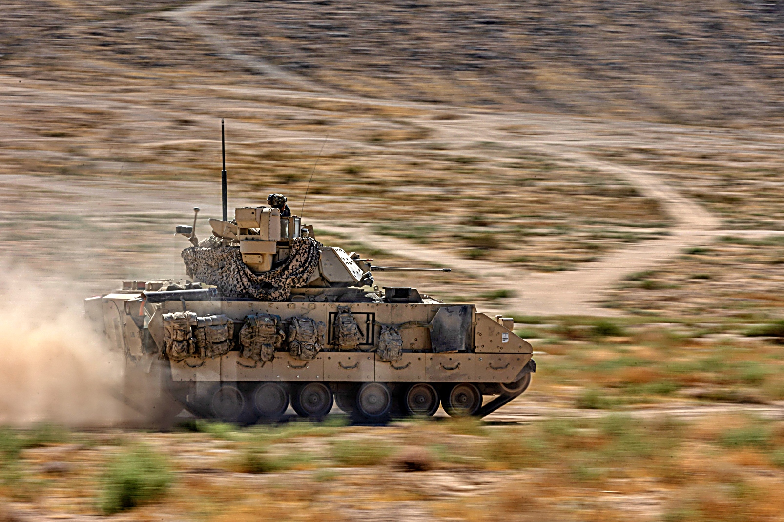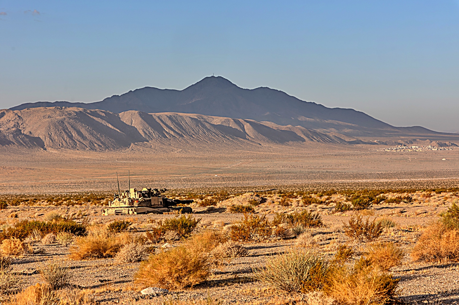 2024년 9월 20일부터 26일사이, 캘리포니아주 Fort Irwin 소재 국립훈련센터에서 진행된 Rotation 24-11 훈련 중, 미 육군 제1보병사단 제2기갑여단전투팀 제70기갑연대 제2대대 소속 Bradley 전투장갑차와 M1A2 전차 , 제4기갑연대 5대대 M1A2 전차, 제63기갑연대 1대대 M2A3 Bradley 보병전투장갑차 및 제 7야전포병연대 1대대 소속 M109A6 Paladin 자주포 및 M922 포탄공급 장갑차가 기동하며 훈련중이다.