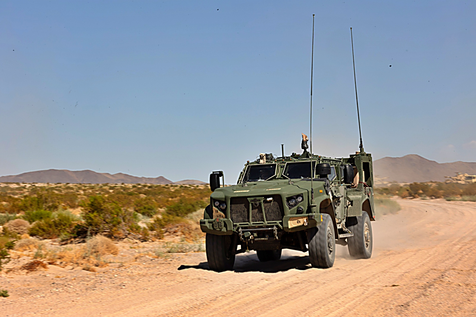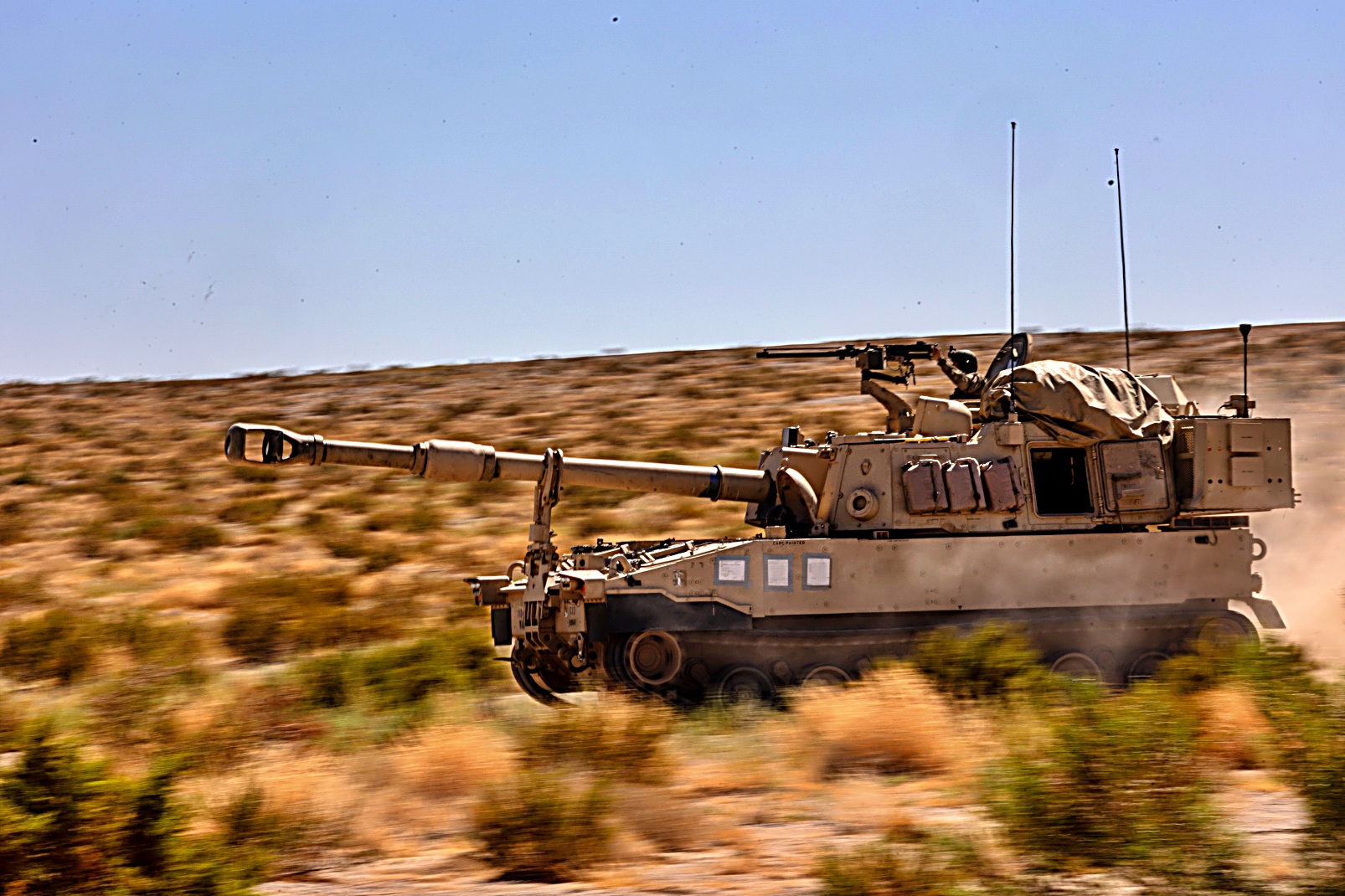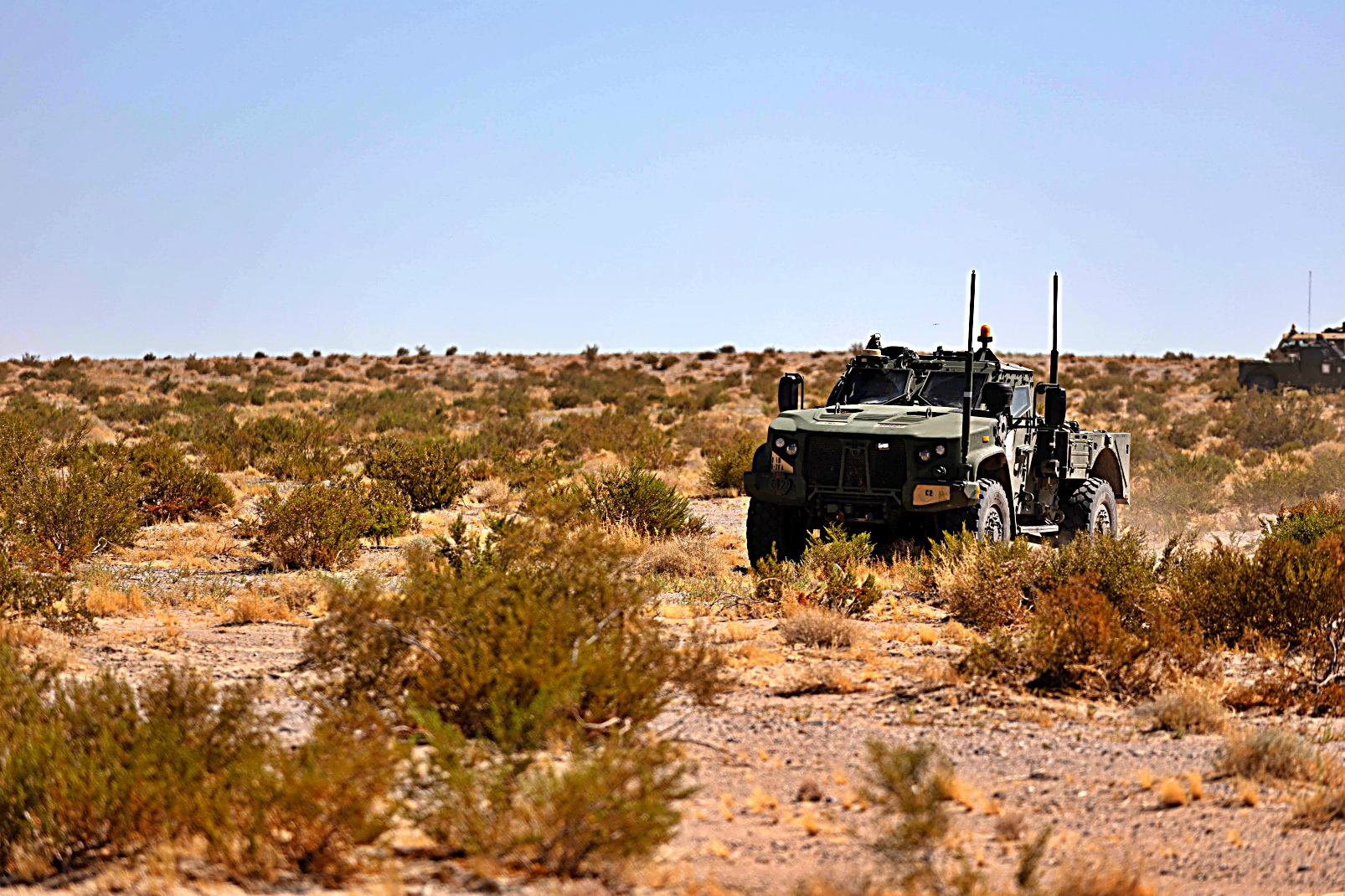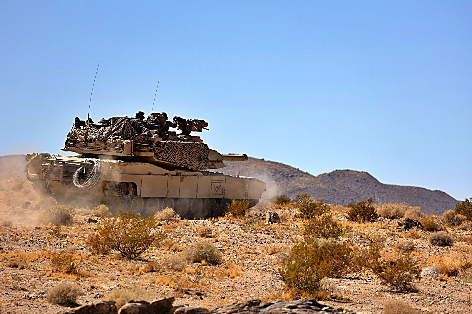 2024년 9월 20일부터 26일사이, 캘리포니아주 Fort Irwin 소재 국립훈련센터에서 진행된 Rotation 24-11 훈련 중, 미 육군 제1보병사단 제2기갑여단전투팀 제70기갑연대 제2대대 소속 Bradley 전투장갑차와 M1A2 전차 , 제4기갑연대 5대대 M1A2 전차, 제63기갑연대 1대대 M2A3 Bradley 보병전투장갑차 및 제 7야전포병연대 1대대 소속 M109A6 Paladin 자주포 및 M922 포탄공급 장갑차가 기동하며 훈련중이다.