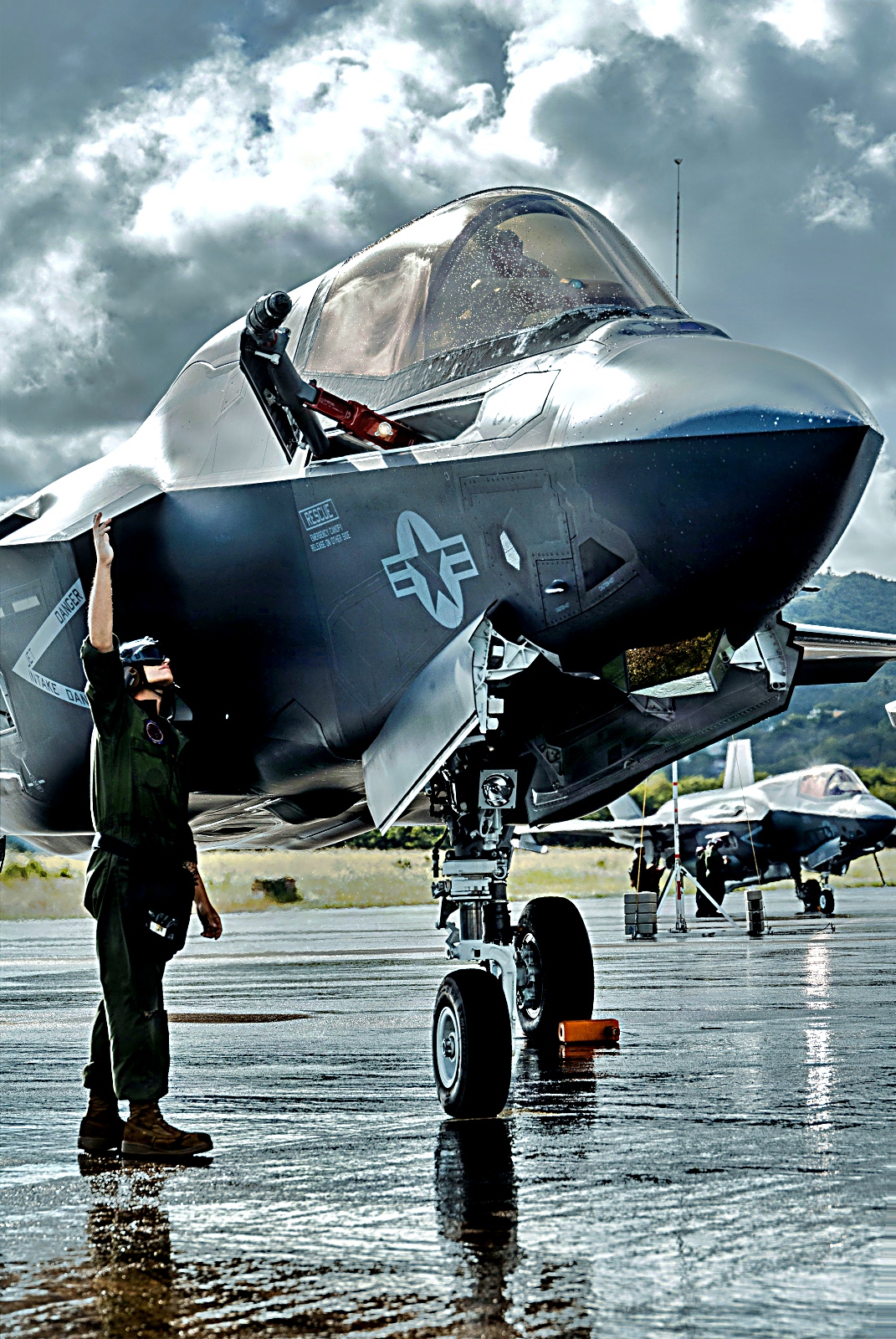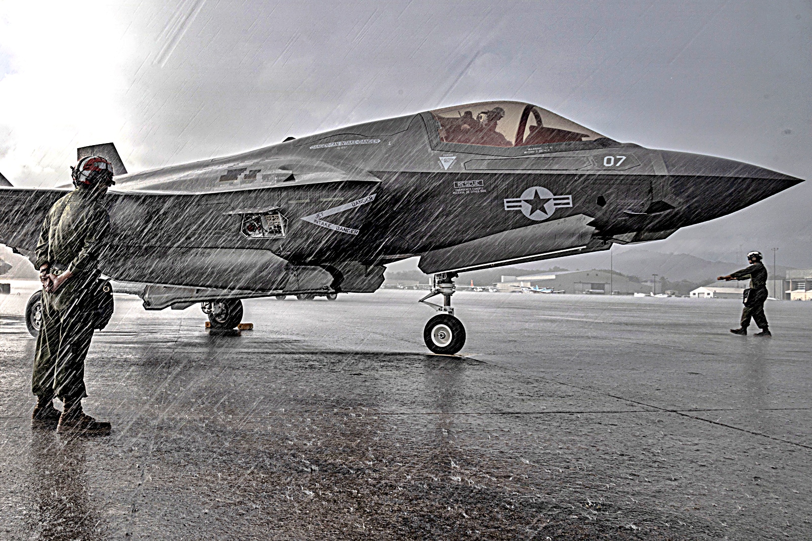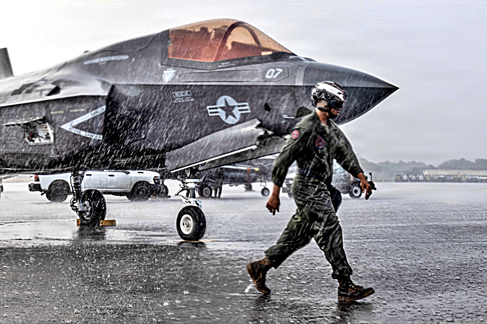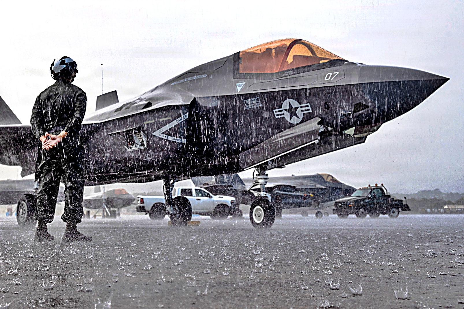 미국 해병대 남부군사령부 소속 VMFA-225 해병대 전투공격대대 소속 해병대원들이 2025년 11월 26일 푸에르토리코 Ceiba의 Jose Aponte de la Torre 공항에서 F-35B Lightning II 공격기들이 폭우속에서 임무 비행을 준비하고 있다.