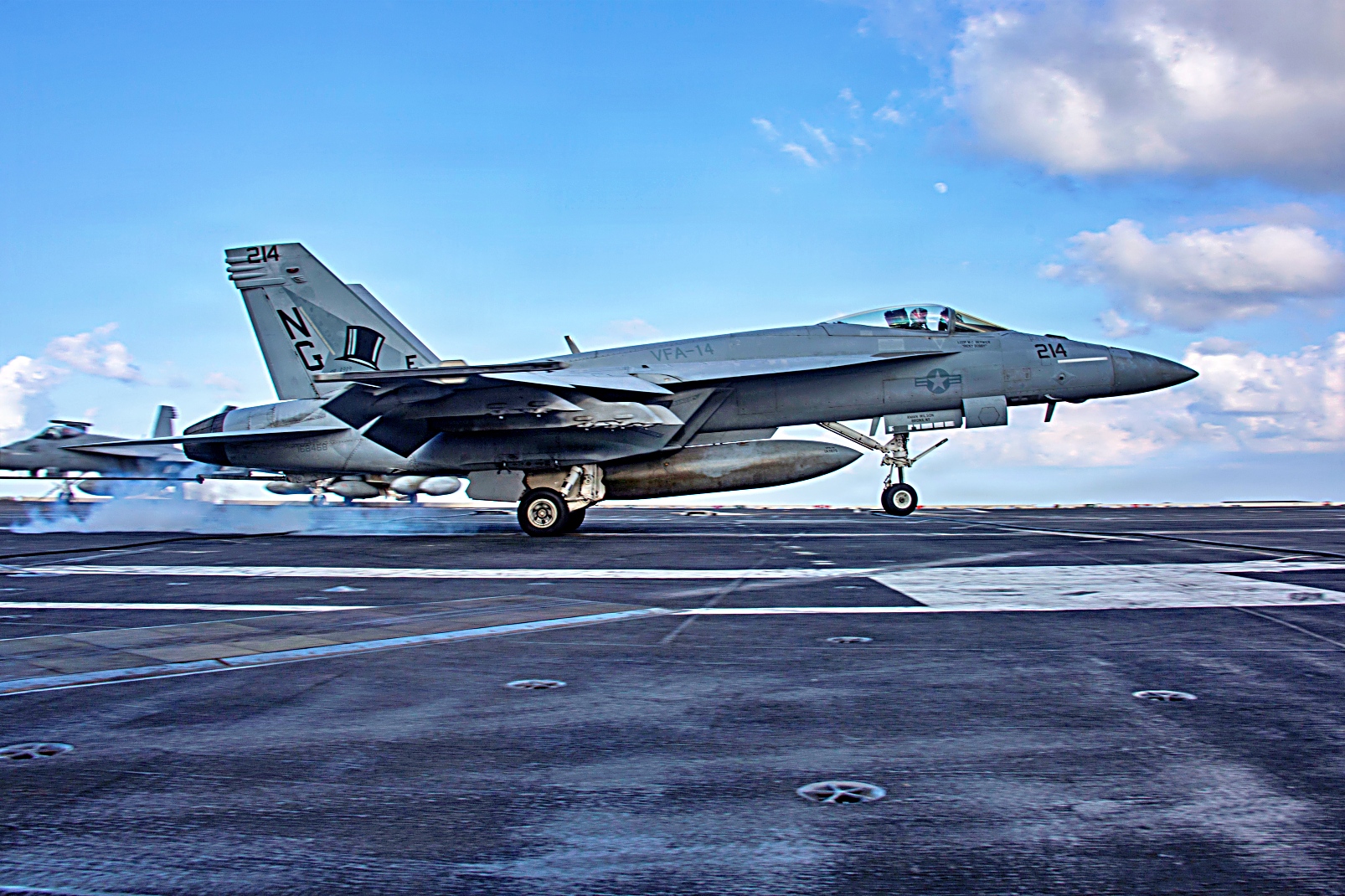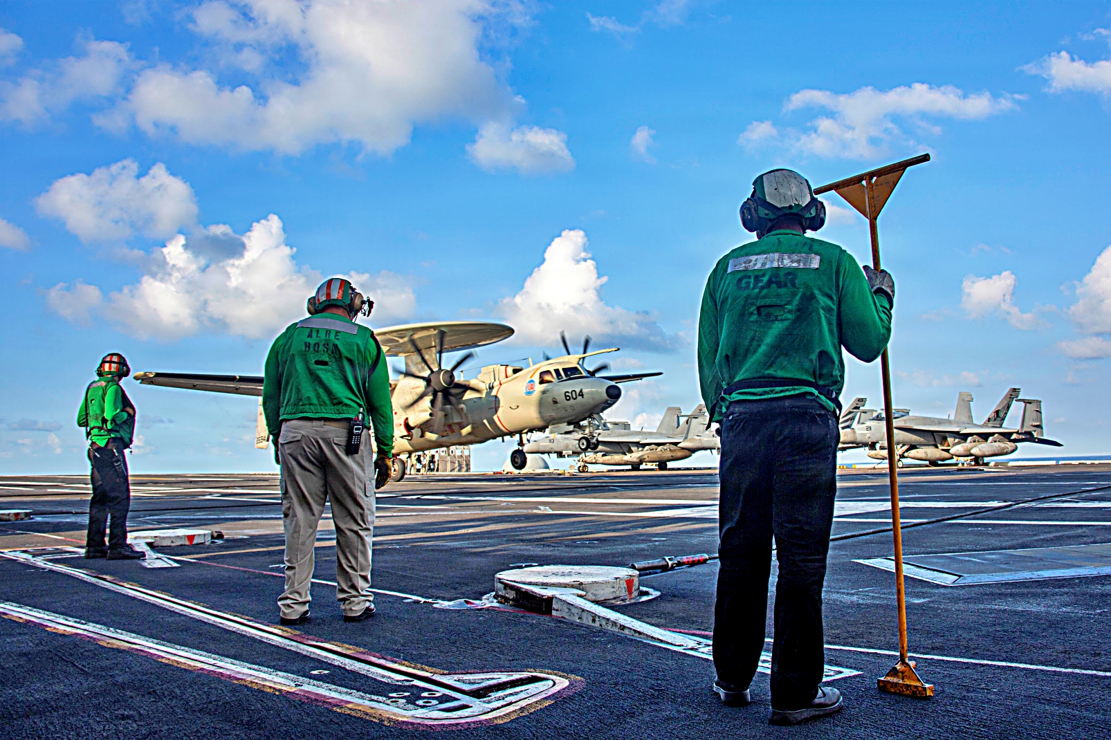 2025년 12월 1일, 미 해군 Nimitz급 항공모함 USS Abraham Lincoln (CVN 72)함의 비행 갑판에서 F/A-18E Super Hornet 전투기와 E-2D 조기경보기등이 비행작전을 수행하고 있다.