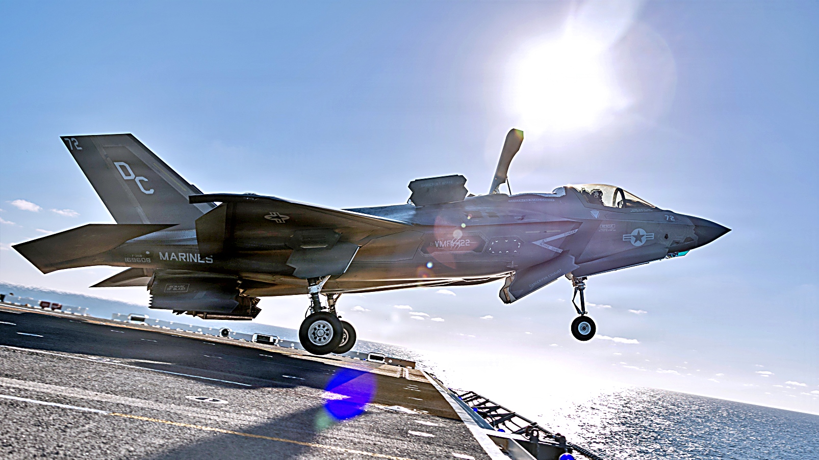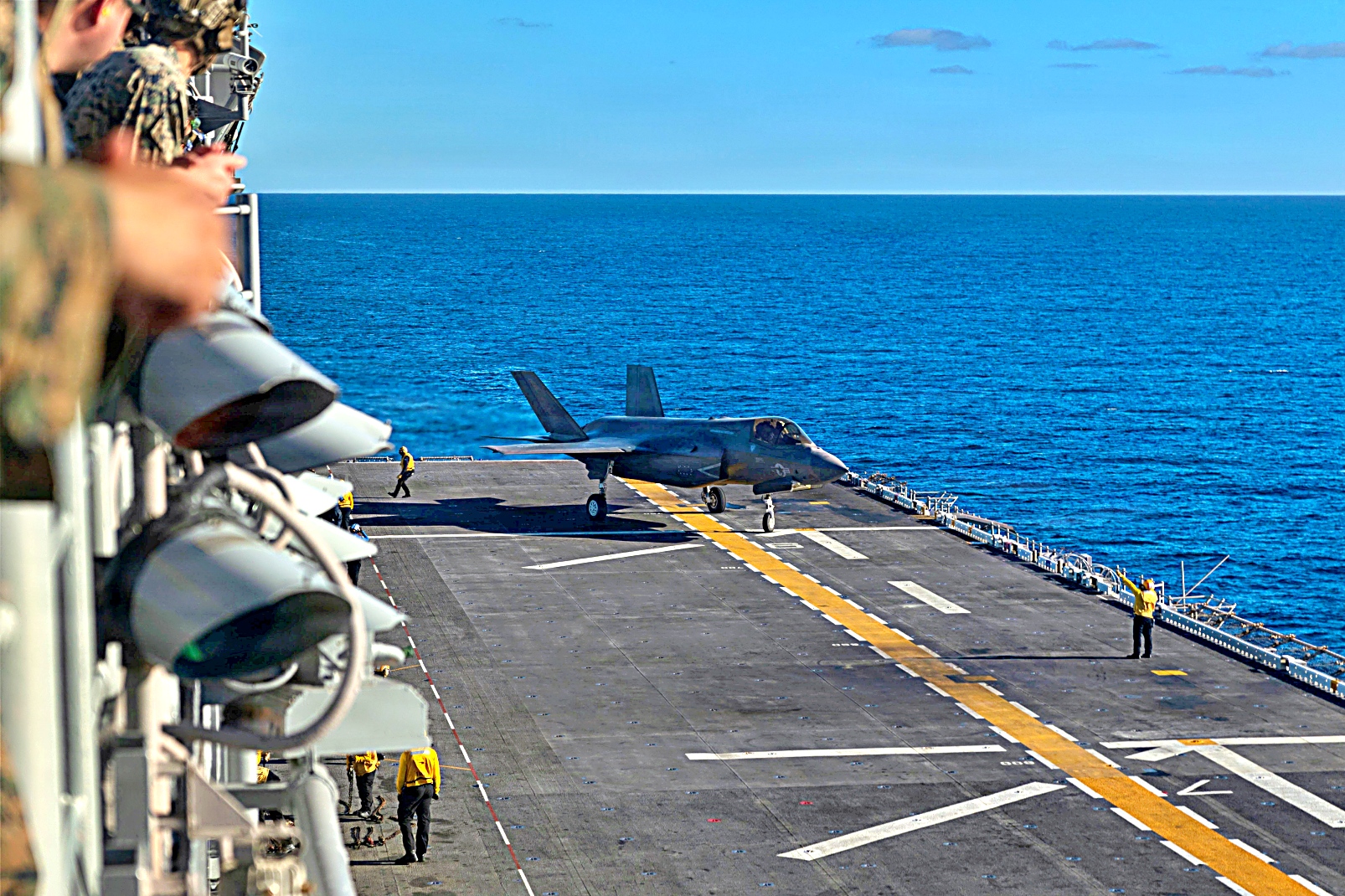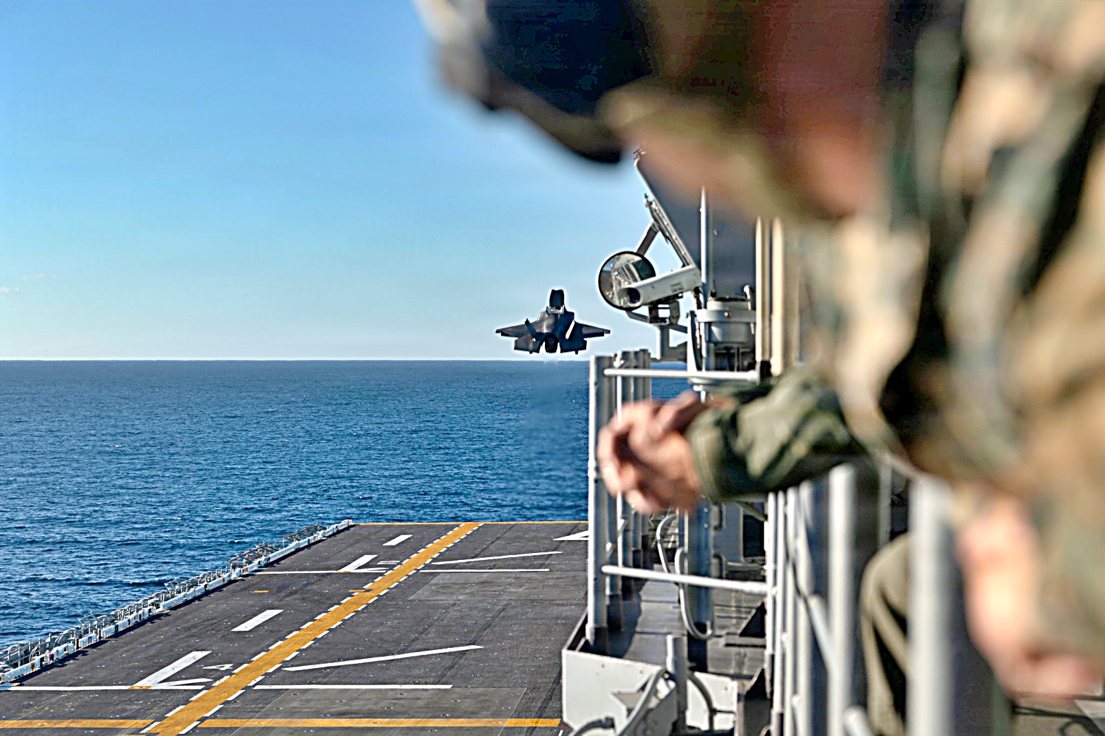 2025년 12월 5일, 태평양 해상에서 미 해병대 제11해병원정군에배속된 VMFA-122 해병전투기대대의 F-35B Lightning II 공격기가 Wasp급 상륙함 USS Boxer (LHD 4)의 비행갑판 상공에서 호버링 (공중정지)과 이착함등 다양한 비행작전을 수행했다.