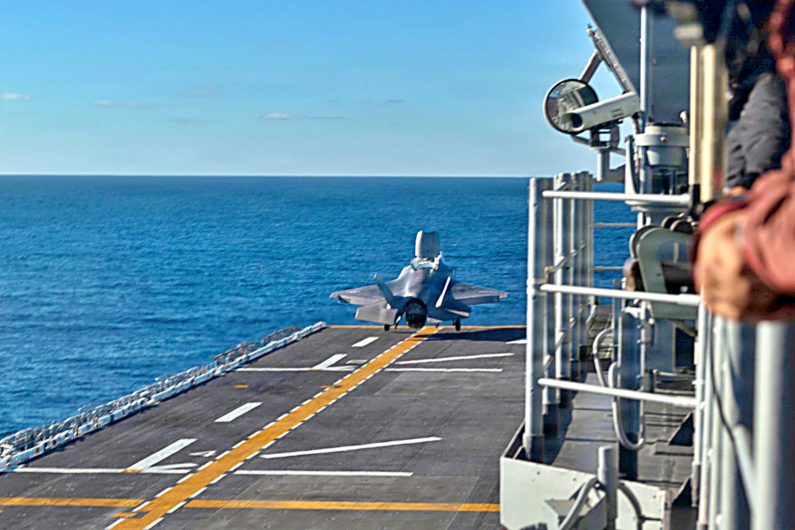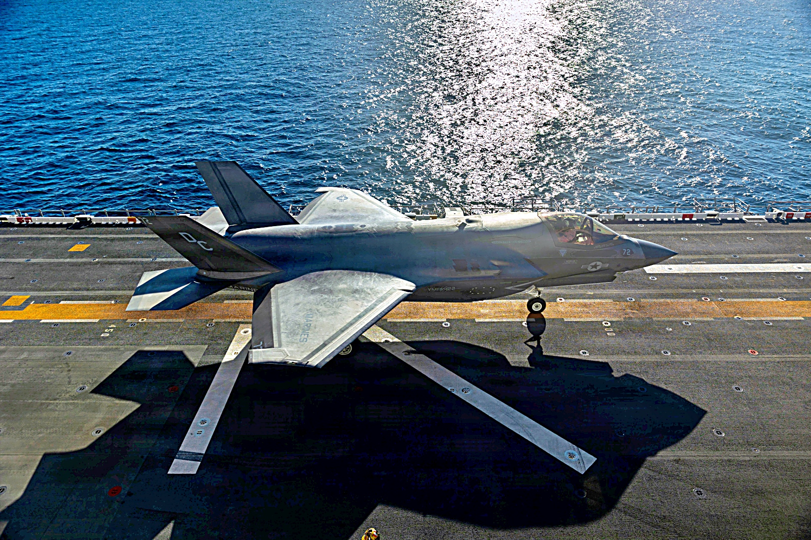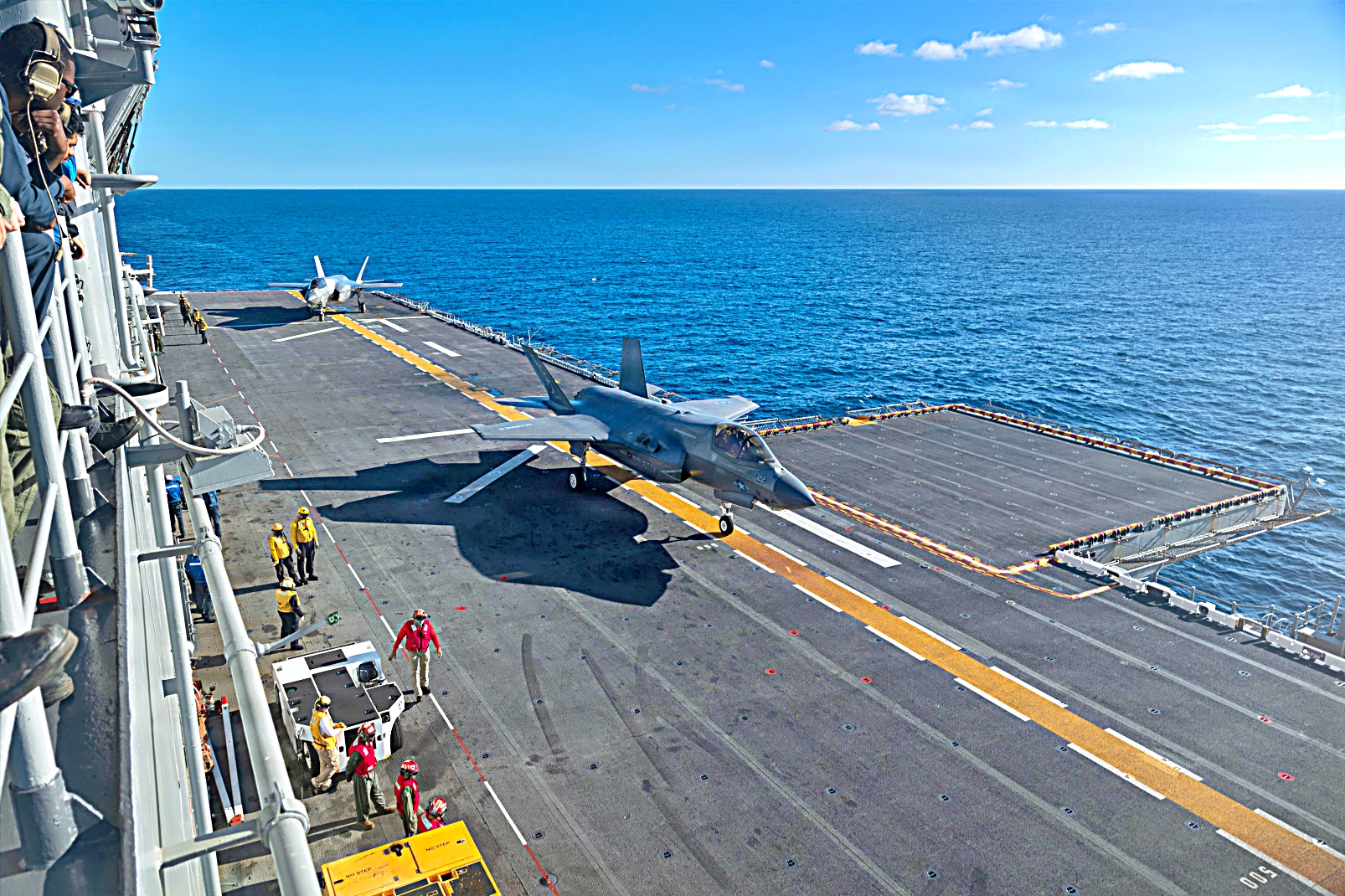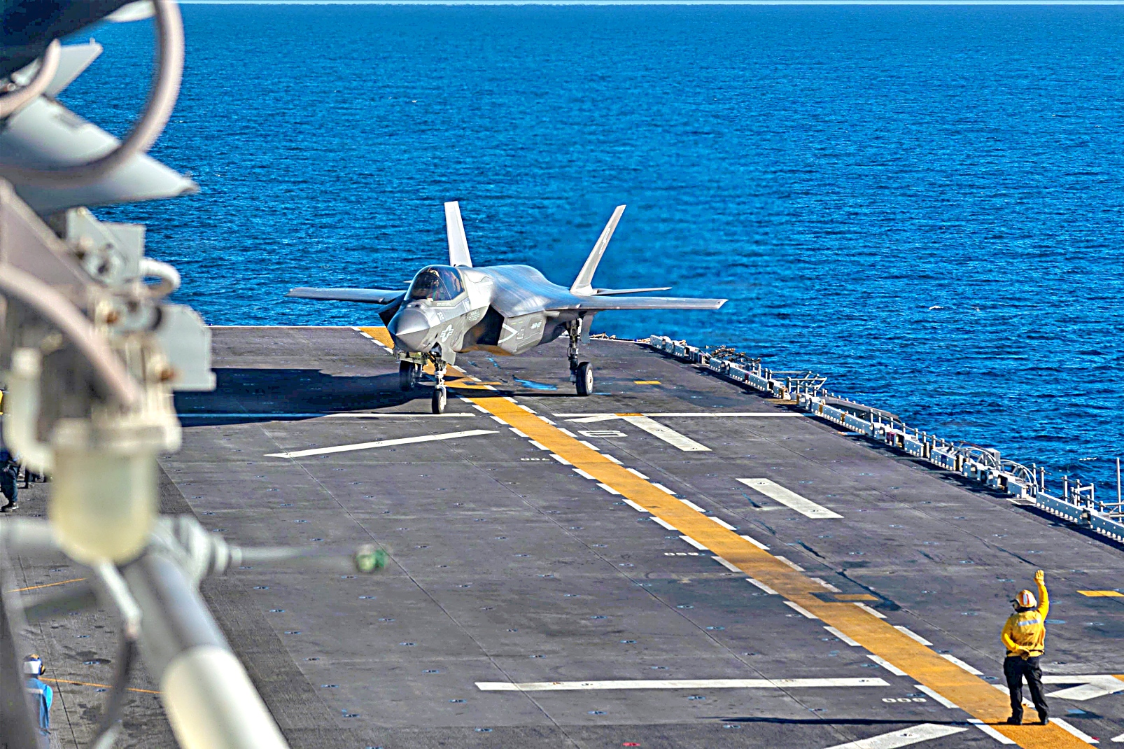 2025년 12월 5일, 태평양 해상에서 미 해병대 제11해병원정군에배속된 VMFA-122 해병전투기대대의 F-35B Lightning II 공격기가 Wasp급 상륙함 USS Boxer (LHD 4)의 비행갑판 상공에서 호버링 (공중정지)과 이착함등 다양한 비행작전을 수행했다.