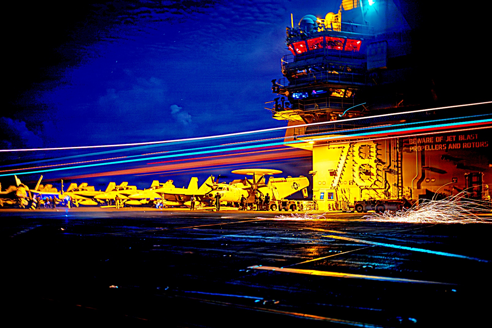 2025년 11월 29일부터 30일 사이 카리브해에 배치된 세계 최대 항공모함인 Ford급 항공모함 USS Gerald R. Ford (CVN 78)의 비행 갑판에서 함재기들이 주야간 비행작전을 수행하며 베네수엘라로 진격 명령을 기다리고 있다.