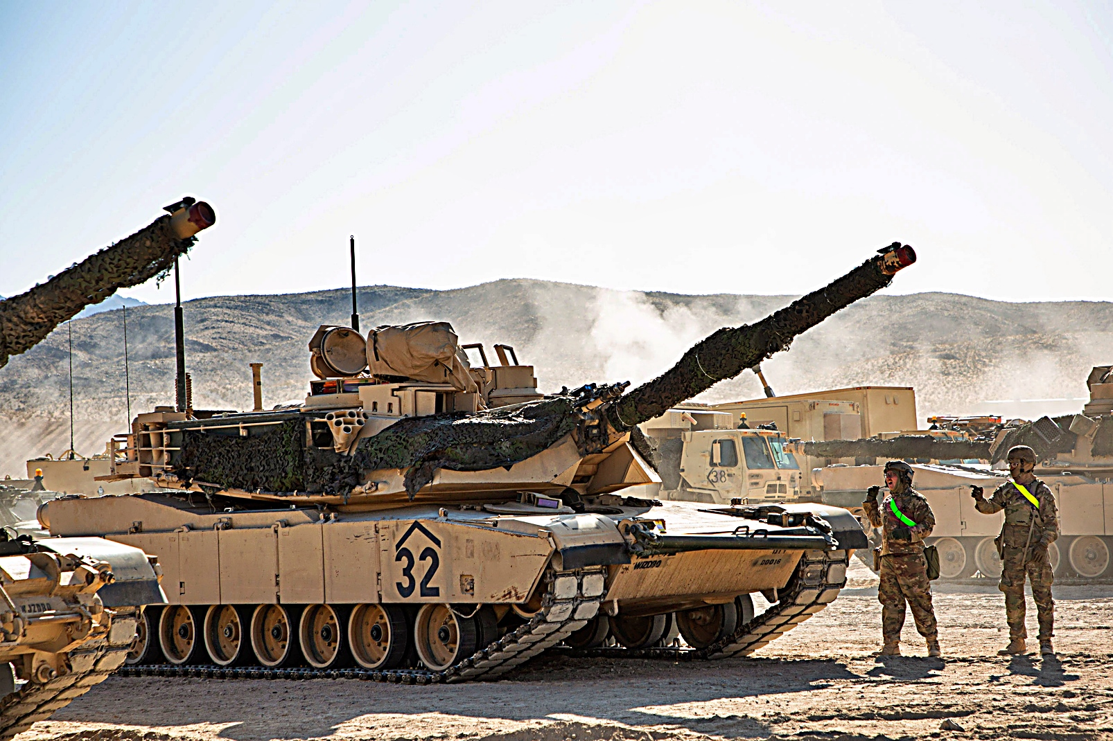 2025년 4월 22일부터 24일 사이 캘리포니아주 Fort Irwin 소재 국립훈련센터에서 진행된 Rotation 25-07 훈련 중, 제2기갑여단전투팀 제1기병연대 제1기병대대 소속 Bradley 장갑차와 M1 Abrams 전차를 이동시키고 Joint Assault Bridge을 준비하여 험지를 돌파할 수 있도록 준비하고 있다.