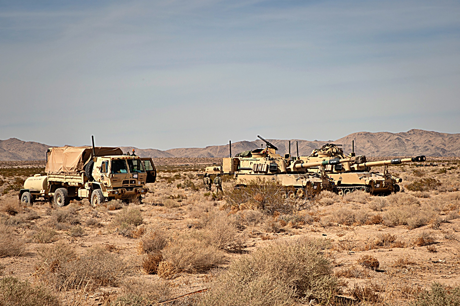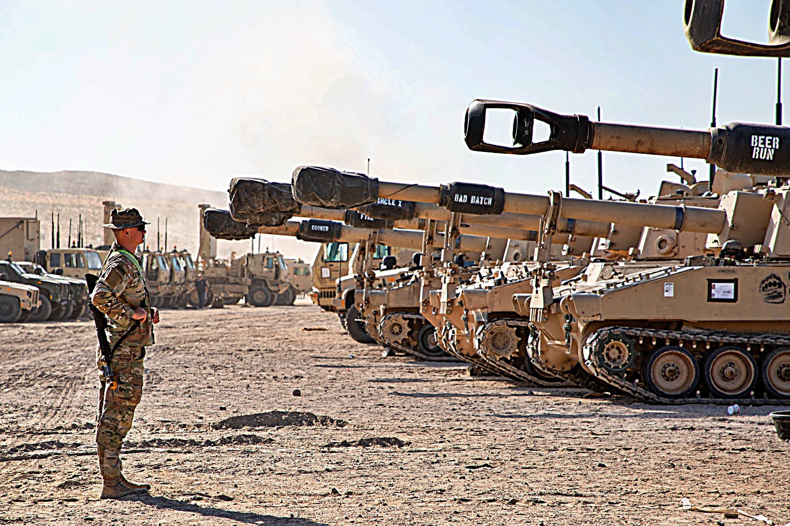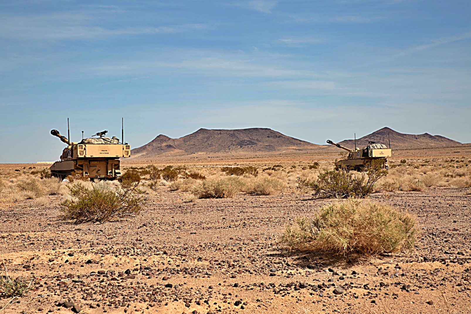 2024년 6월 12일, 캘리포니아주 Fort Irwin 소재 미 육군 National Training Center에서 진행된 24-08 순환훈련 중, 제1기갑사단 제3기갑여단전투단 제1야전포병연대 제4대대 소속 M109 자주포가 사격을 펼쳤다.