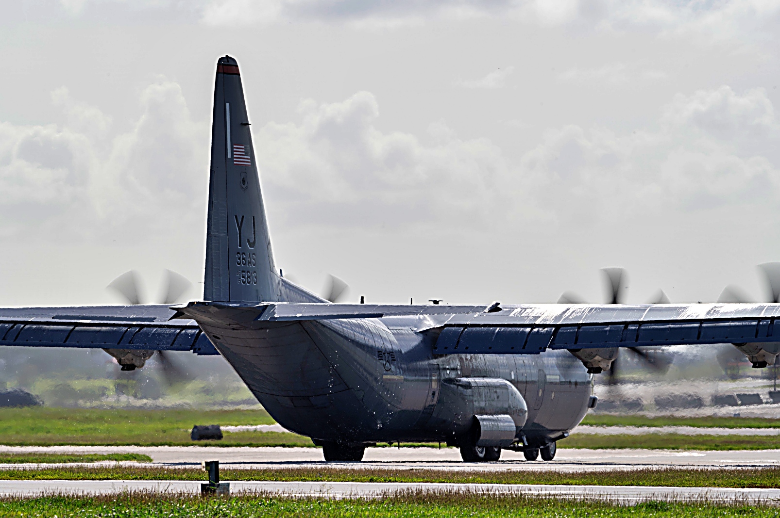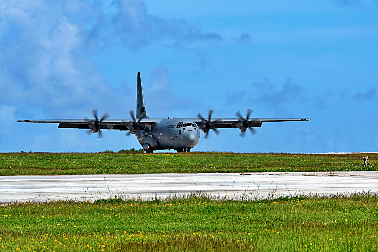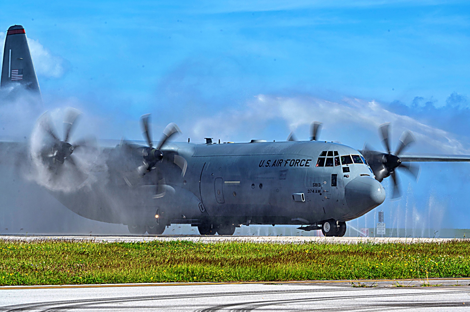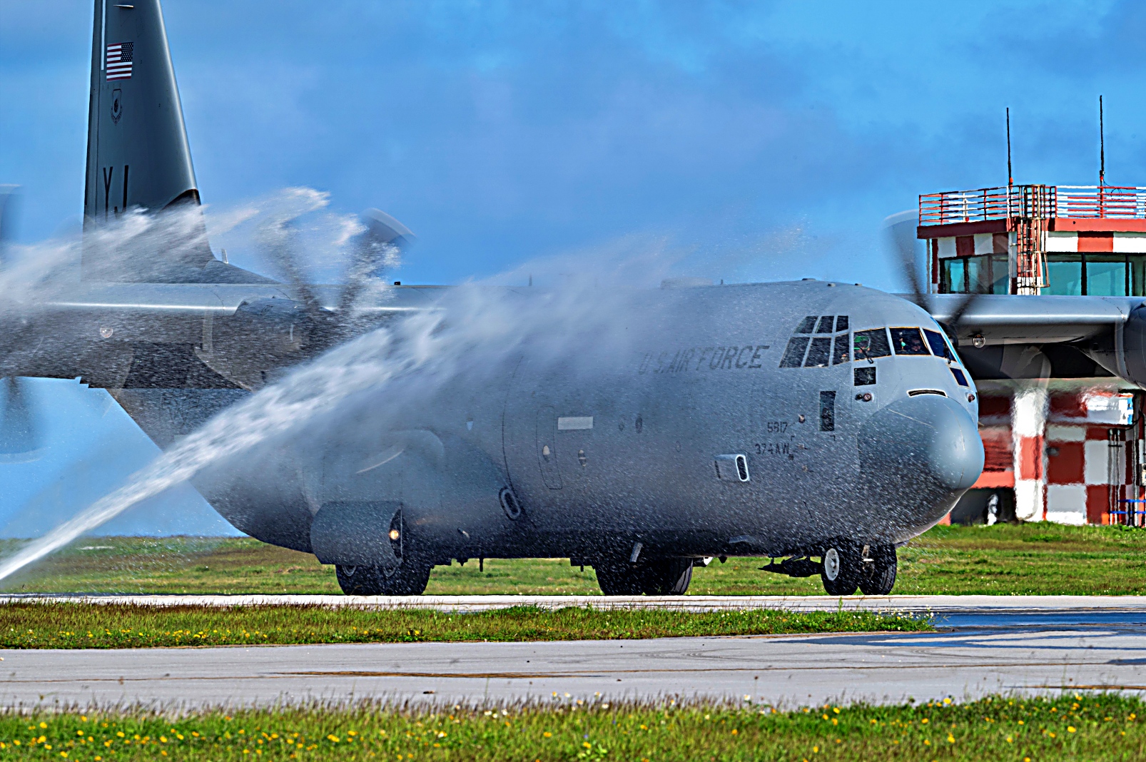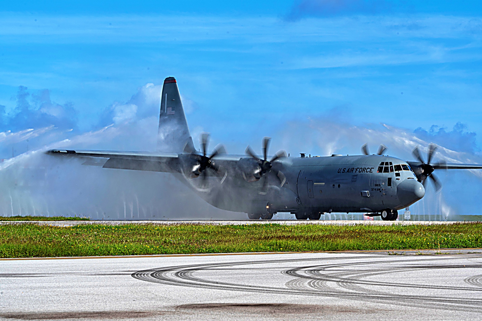 2025년 12월 9일, 괌 앤더슨 공군기지에서 진행된 ‘크리스마스 드롭 작전 2025(Operation Christmas Drop 2025)’을 수행한 주일미공군 요코타 공군기지의 374공군원정비행단 소속 미 공군 C-130J Super Hercules 수송기가 임무 비행을 마치고 착륙 후 새 목욕장(bird bath station)을 통과하며 활주로를 이동후 하고 있다. 이 새로운 항공기 린싱 시설은 염수 상공에서 비행으로 인한 부식을 최소화하기 위해 개발됐다. 해당 항공기, 승무원 및 지원 인력은 OCD25 작전 비행을 통해 인도-태평양 지역의 56,000명 이상의 외딴 태평양 섬 주민들이 인도적 지원 물품을 받을 수 있도록 보장한다.