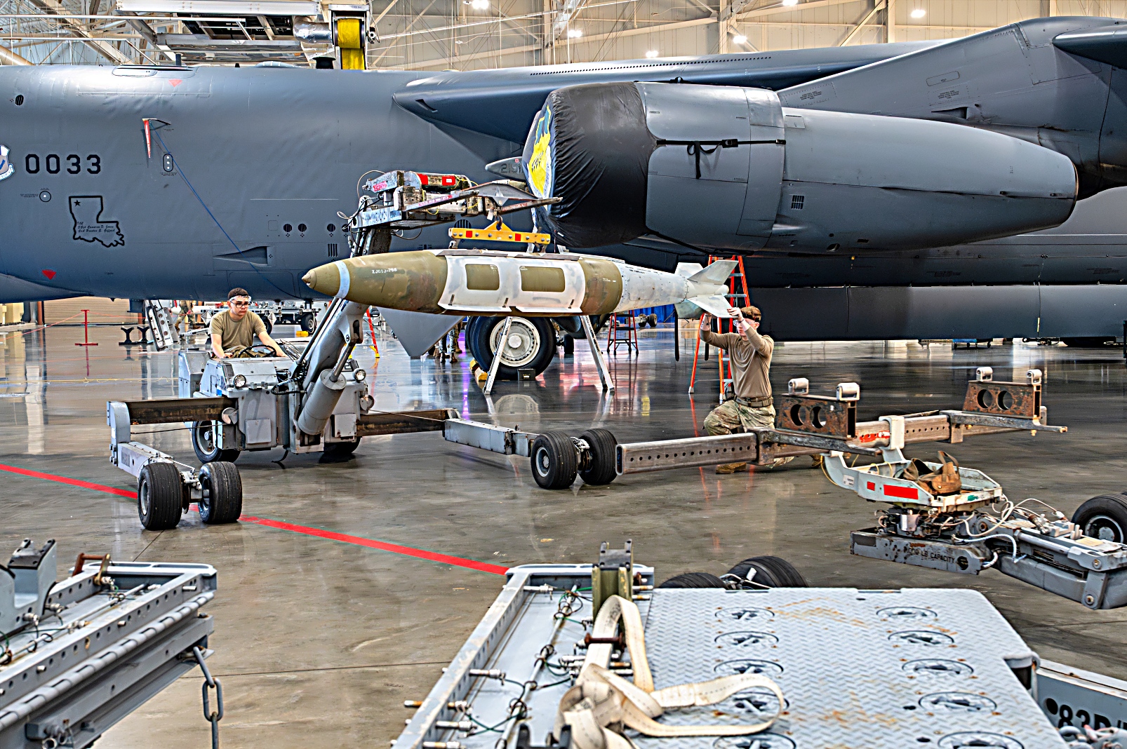 2025년 12월 5일, 루이지애나 주 Barksdale 공군기지에서 열린 무장 장착 경연대회에서 제20폭격기일반대대와 제96폭격일반대대 소속 미 공군 병사들이 B-52H Stratofortress 전략폭격기에 JDAM을 장착하며 무장 장착 전문성과 숙련도를 겨뤘다.