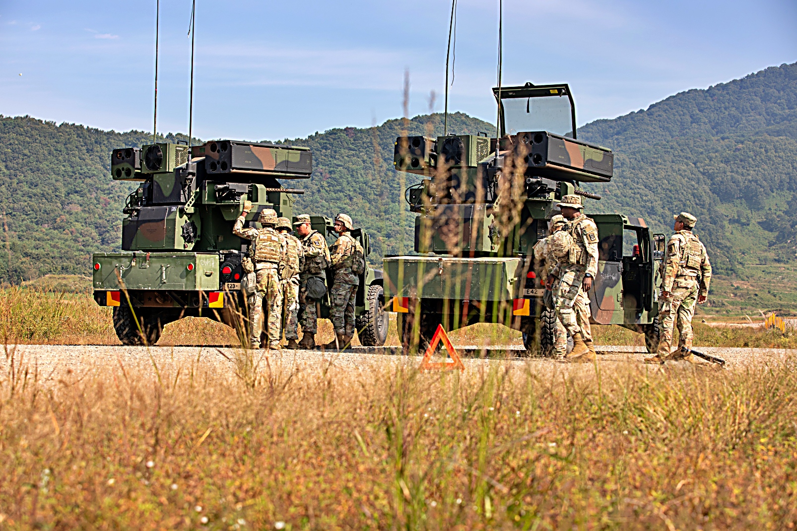 주한 미 육군 제35방공포병대대 6-52 Avenger 사격반 소속 병사들이 AN/TWO-1 Avenger Air Defense Systems을 이용하여 2025년 10월 2일, 포천의 Rodriguez 실사격장에서 훈련 중 배치 및 발사 준비를 마친 후 .50구경 기관총을 사격하고 있다. Avenger 시스템은 회전익 항공기, 고정익 항공기 및 무인 항공 체계에 대한 기동식 단거리 대공 방어 능력을 제공한다.