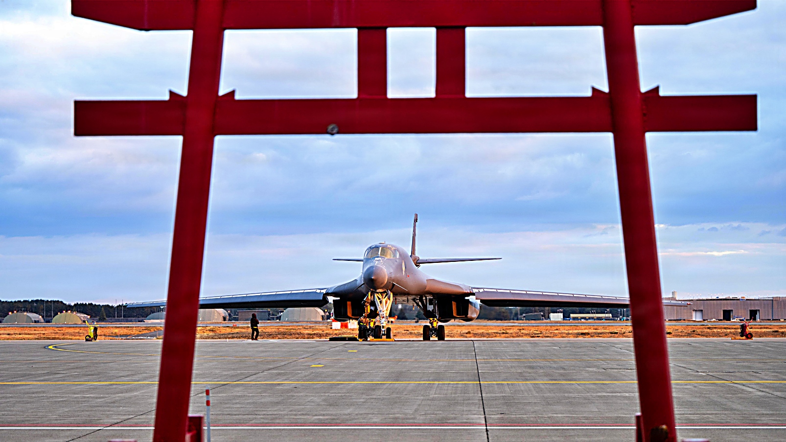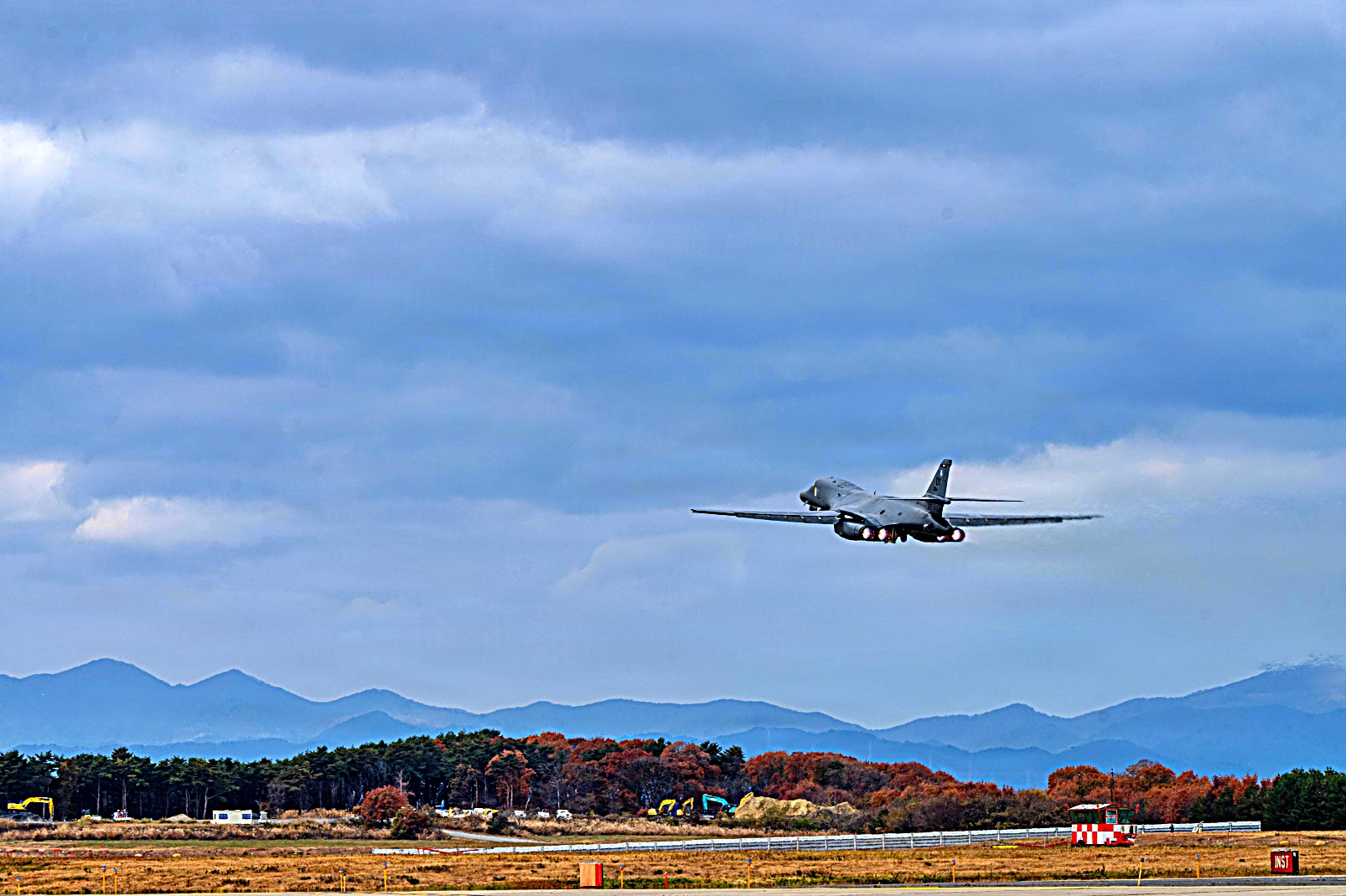 2025년 11월 17일, 일본 미사와 공군기지에서 미국 공군 9원정폭격비행대 소속 B-1B Lancer 폭격기가 Bomber Task Force 배치를 마치고 텍사스주 Dyess 공군기지로 귀환하기 위해 이륙하고 있다. 일본에 Bomber