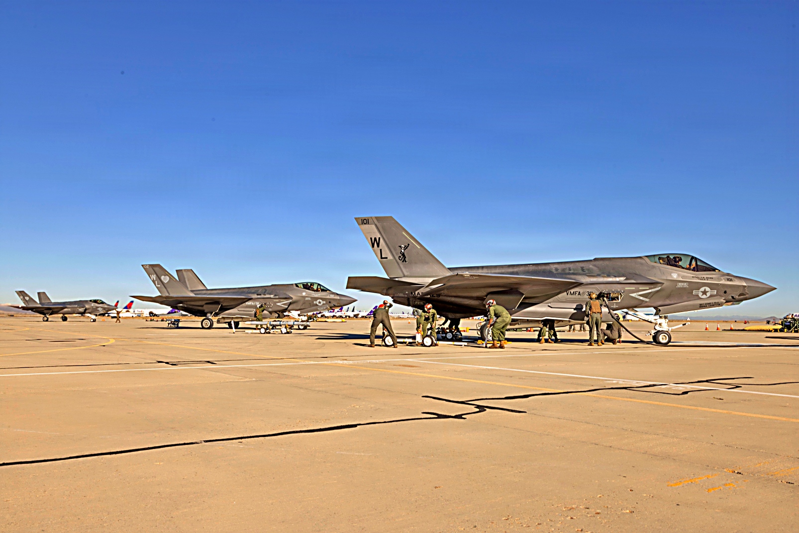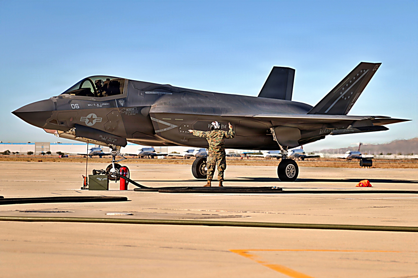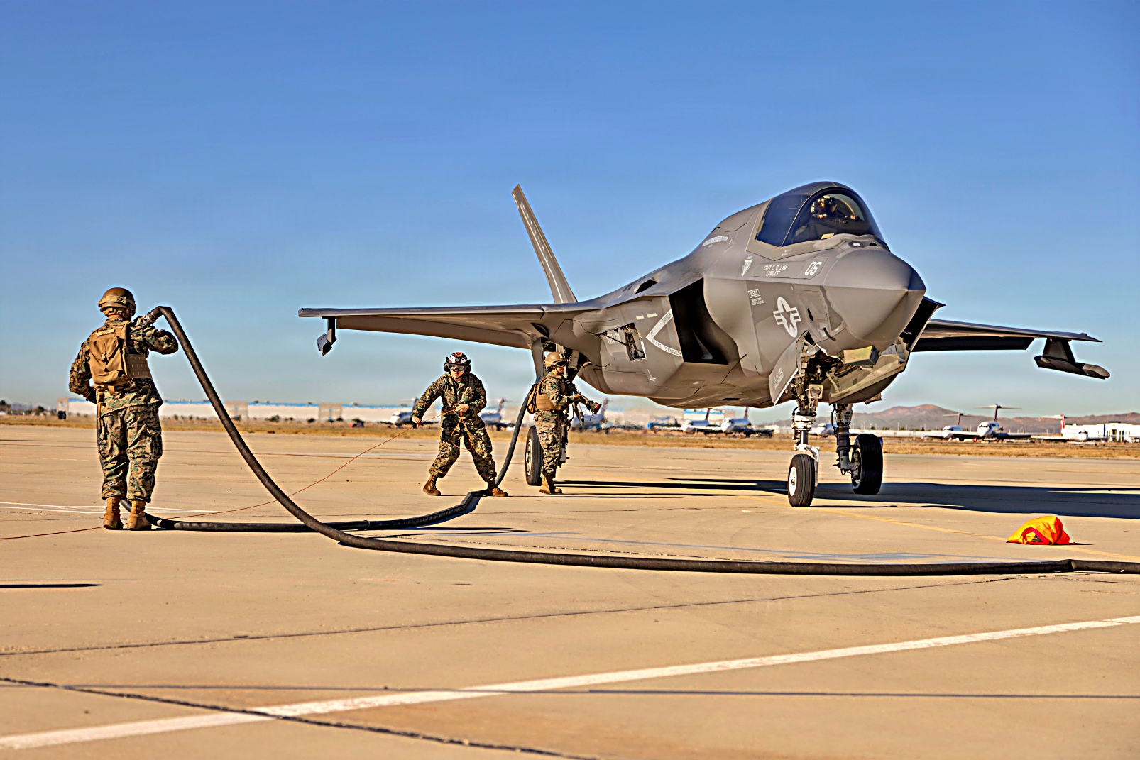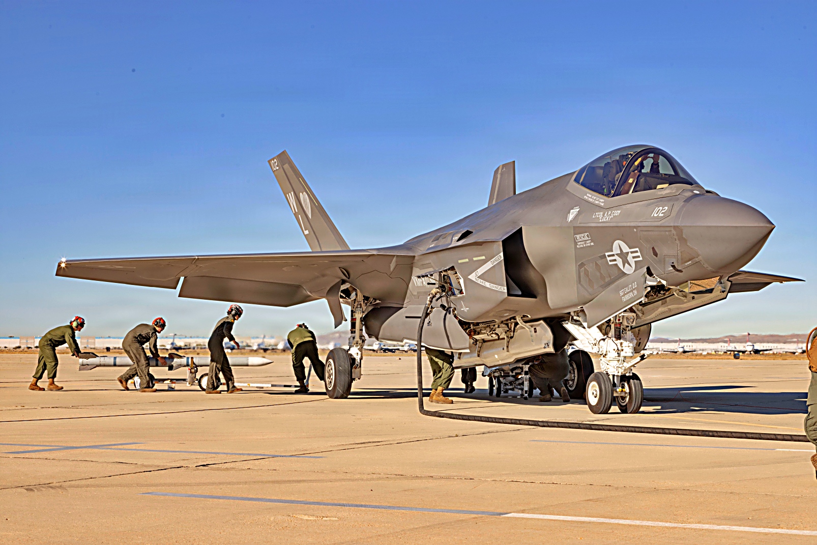 2025년 12월 10일, 캘리포니아 남부 캘리포니아 Victorville 병참지원공항에서 실시된 Steel Knight 25 훈련 중, 미 해병대 제3해병항공단 제11해병항공군 예하 VMFA-311 소속 F-35C Lightning II 공격기에 AIM-120C AMRAAM 공대공 미사일을 탑재하고 이륙을 준비하고 있다. Victorville 훈련장은 신속한 재무장 및 공중급유에 필요한 기반 시설을 제공하여 제3해병항공단 항공기가 모의 현대적 분쟁 환경에서 치명적인 공격력과 신속한 대응 능력을 유지할 수 있도록 지원했다. Steel Knight는 해군-해병 합동팀의 전방 대응 능력, 영역 간 통합 능력, 그리고 해병공지기동임무군(MAGTF)의 준비태세를 강화하기 위한 연례 훈련이다.