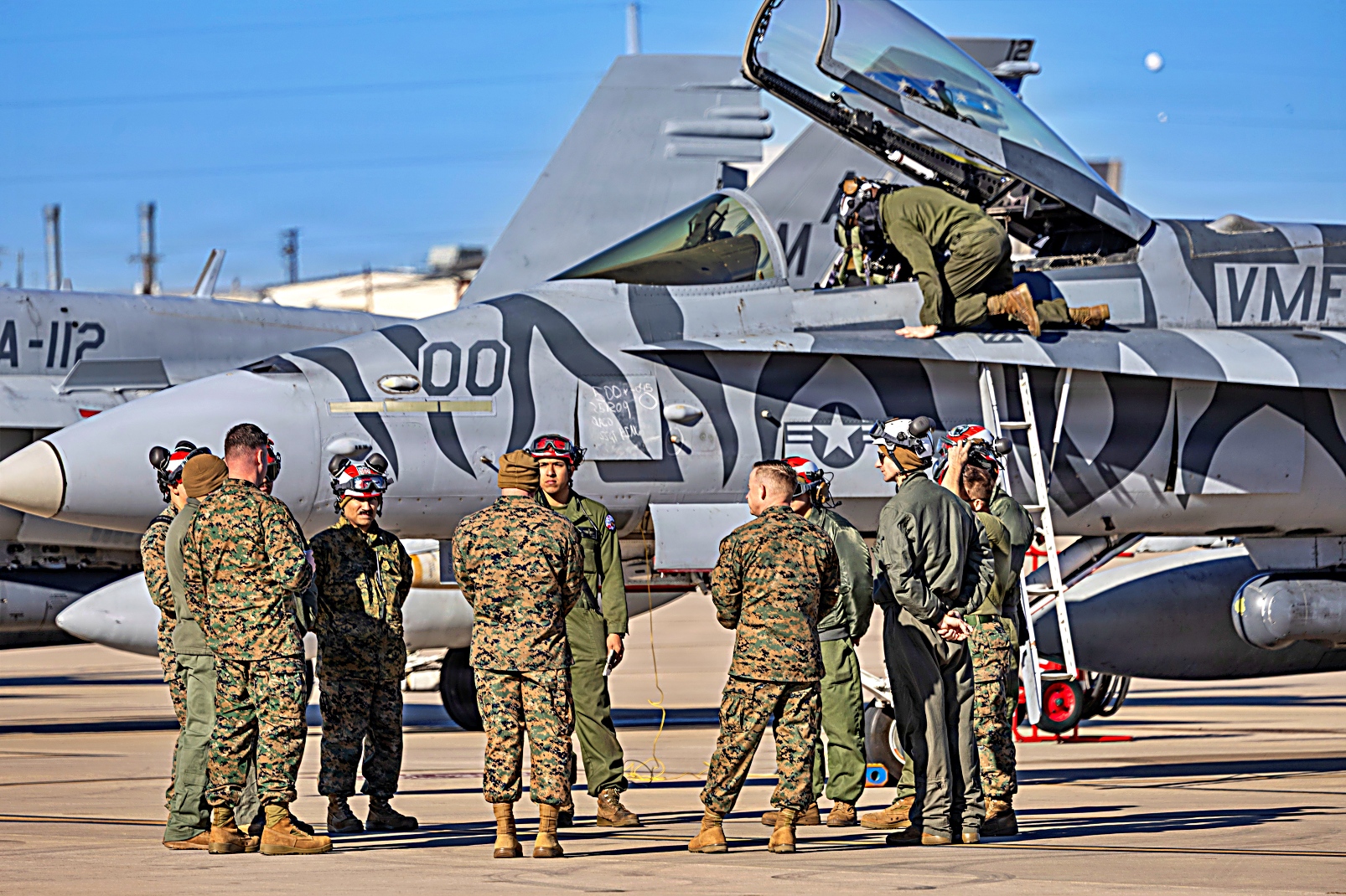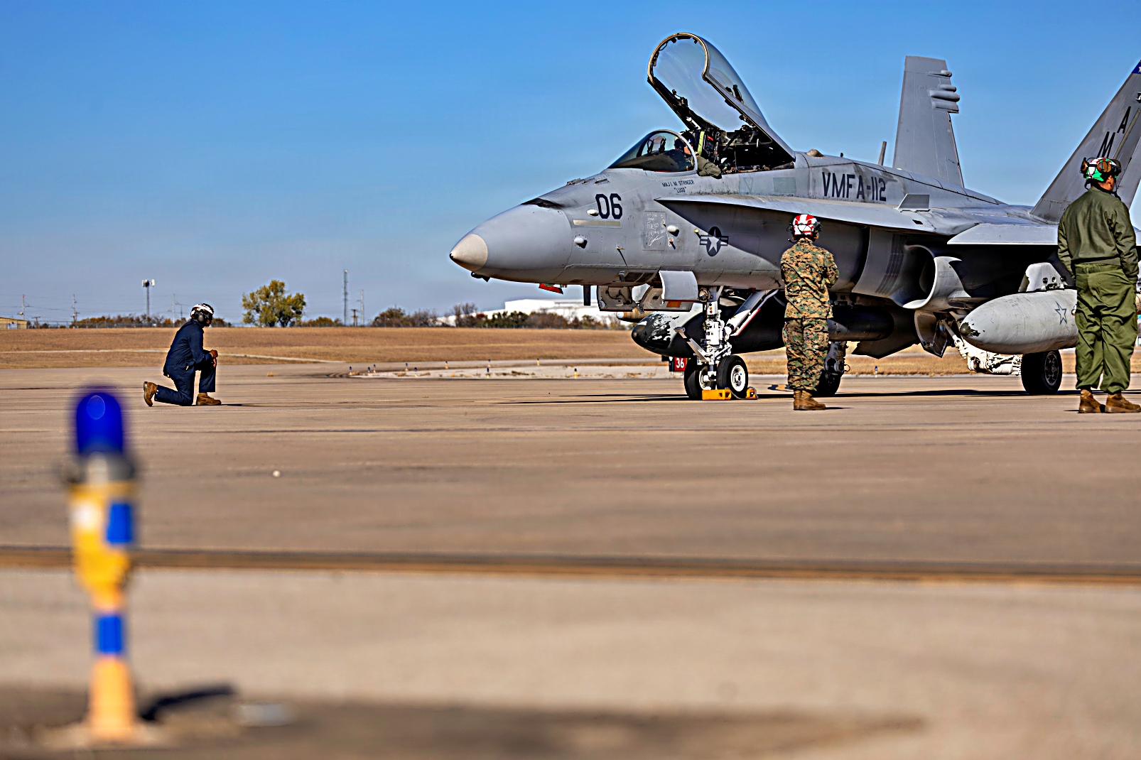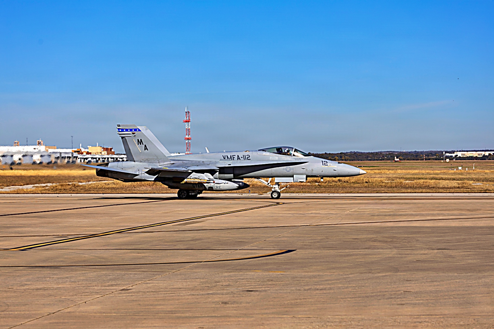 2025년 12월 9일, 텍사스주 Fort Worth 해군 합동예비항공기지에서 미 해병대 제4해병항공단 제41항공군 VMFA-112 전투공격비행대대 소속 F/A-18C Hornet 전투기가 근접항공지원 훈련을 위해 재급유를 받고 있다. 이 훈련은 기량 향상, 무기 취급 절차 검증, 그리고 합동 화력지원 부대 지원을 목적으로 한다.