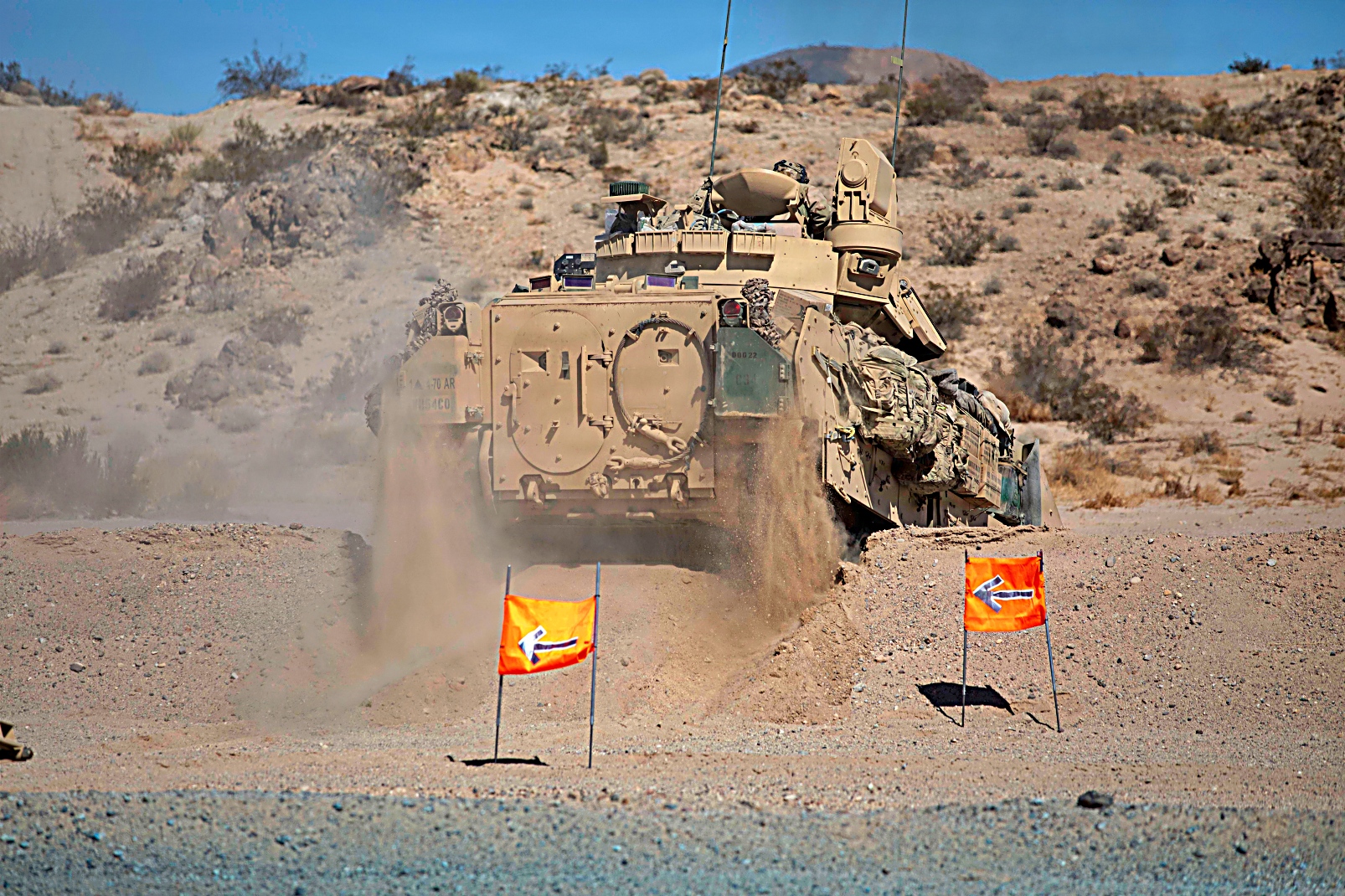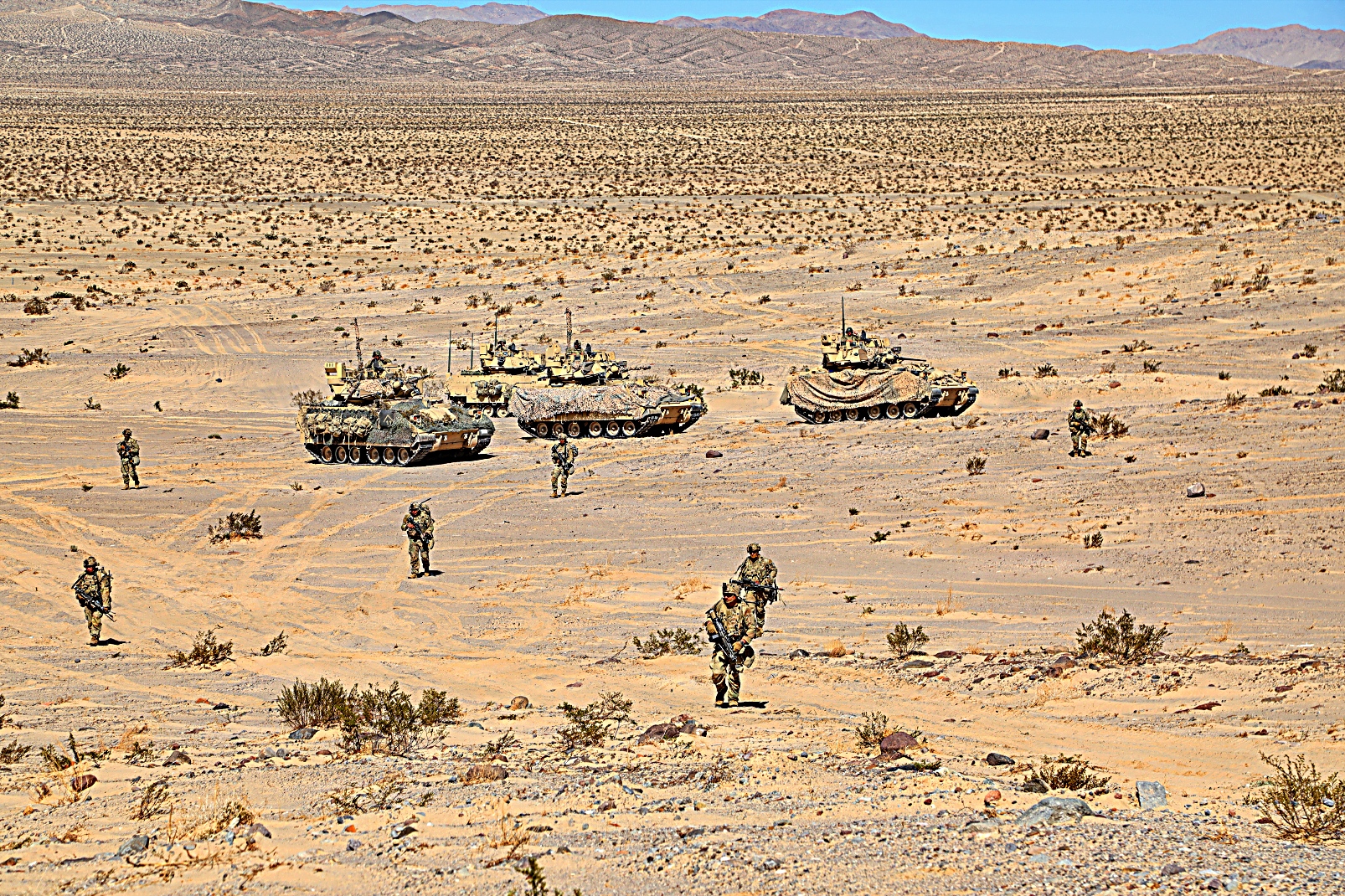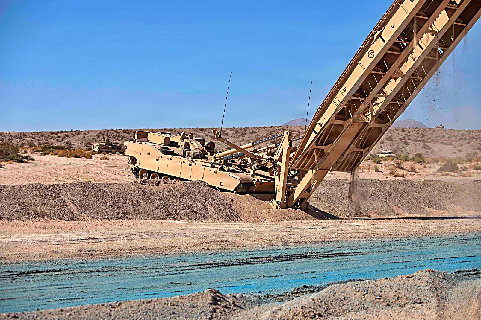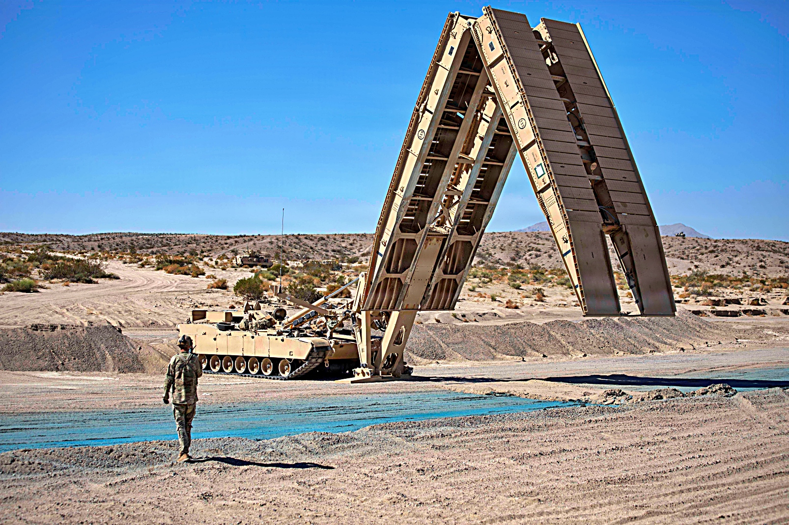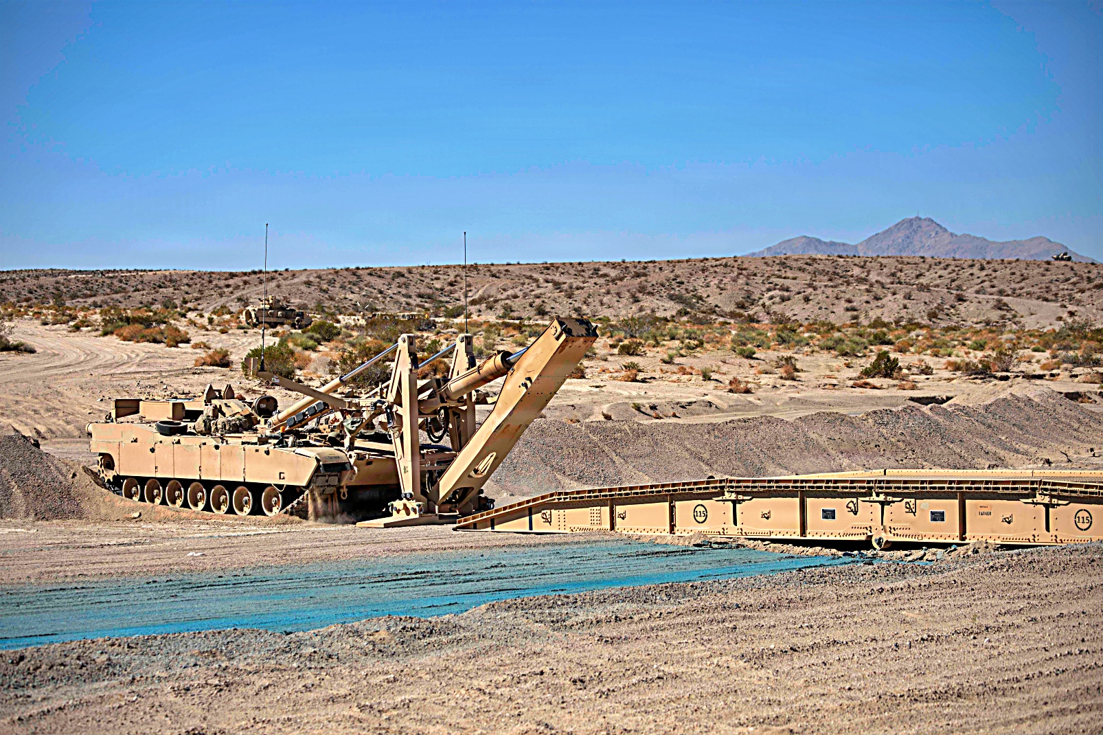 2025년 10월 4일과 5일, 캘리포니아주 Fort Irwin 국립훈련센터에서 열린 Rotation 26-01훈련 중, 제1기갑사단 제1기갑여단전투팀 제4대대 70기갑연대 소속 M1 Abrams 전차가 방어 진지를 구축하고 제1기갑여단전투팀 제16공병대대 소속 Bradley 장갑차가 둑을 돌파하고 합동강습교 (Joint Assault Bridge)를 이용하여 습지 도하 훈련을 실시하고 있다.
