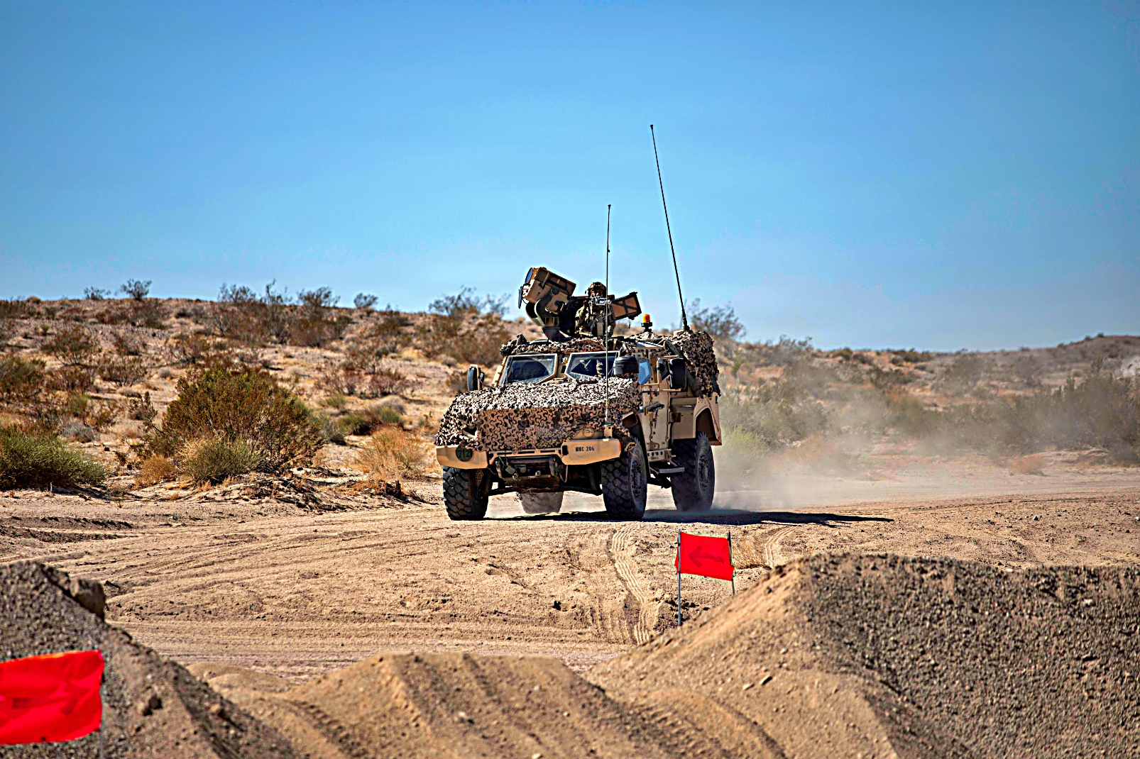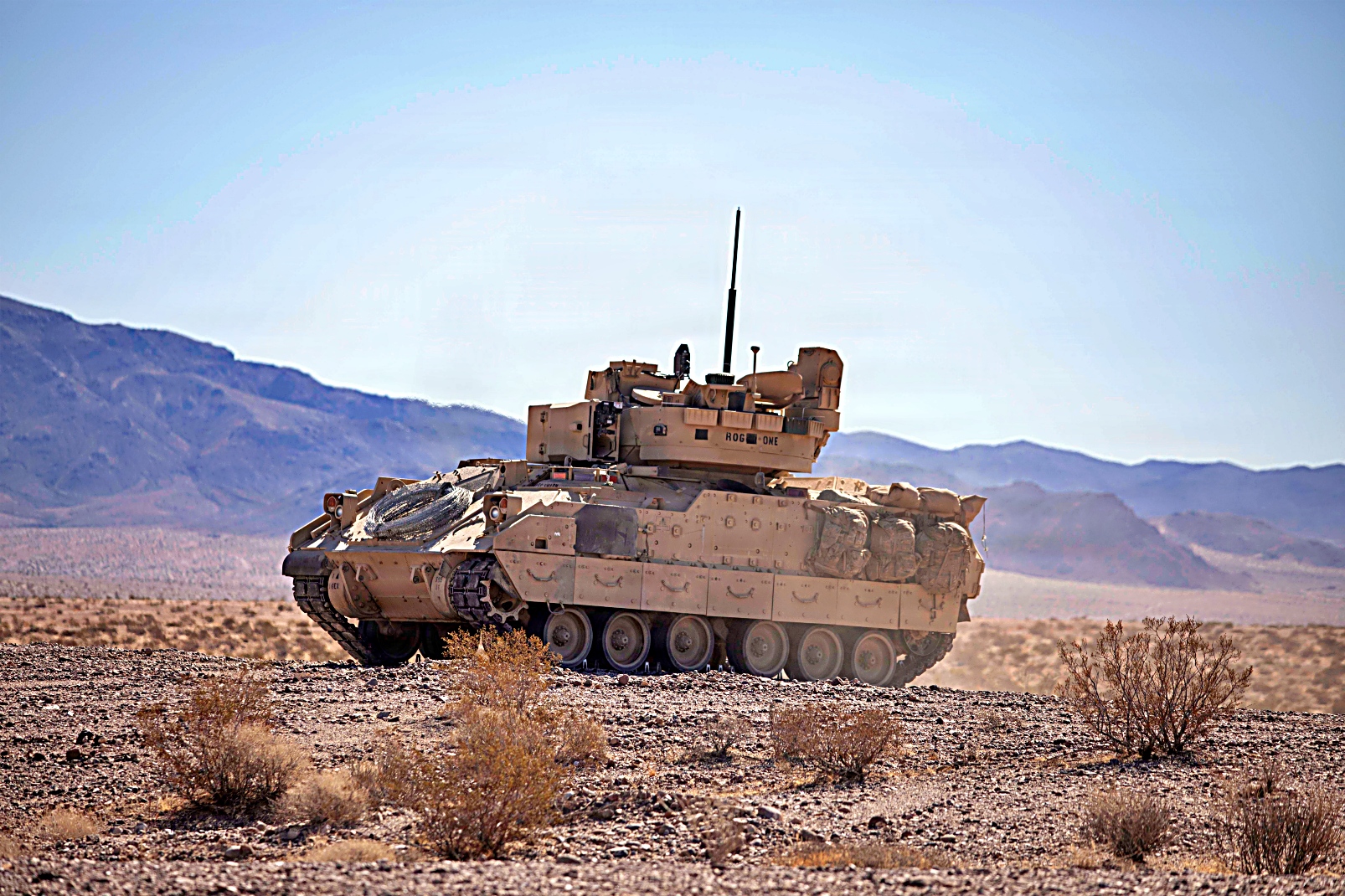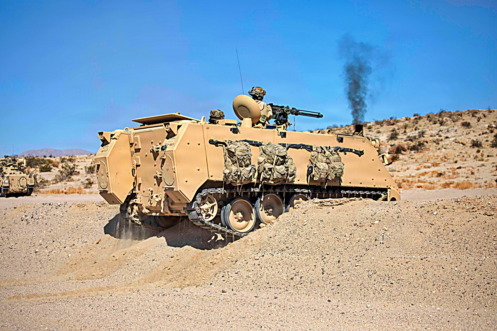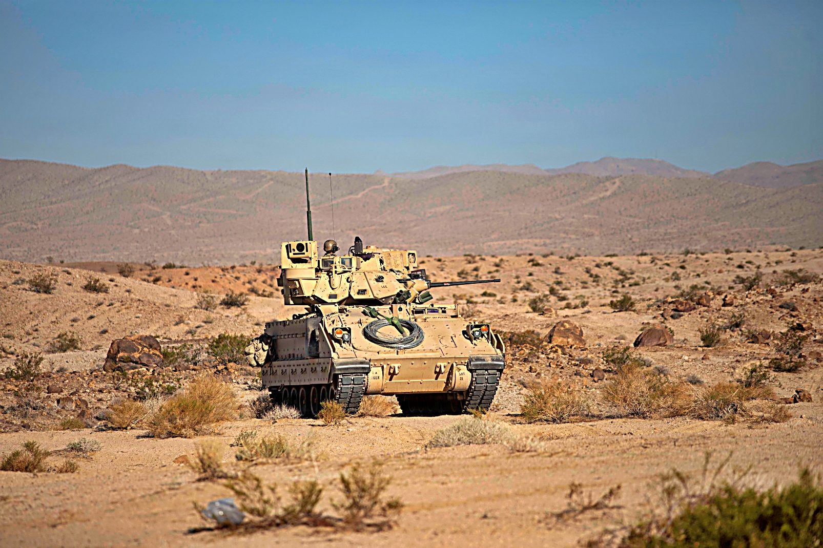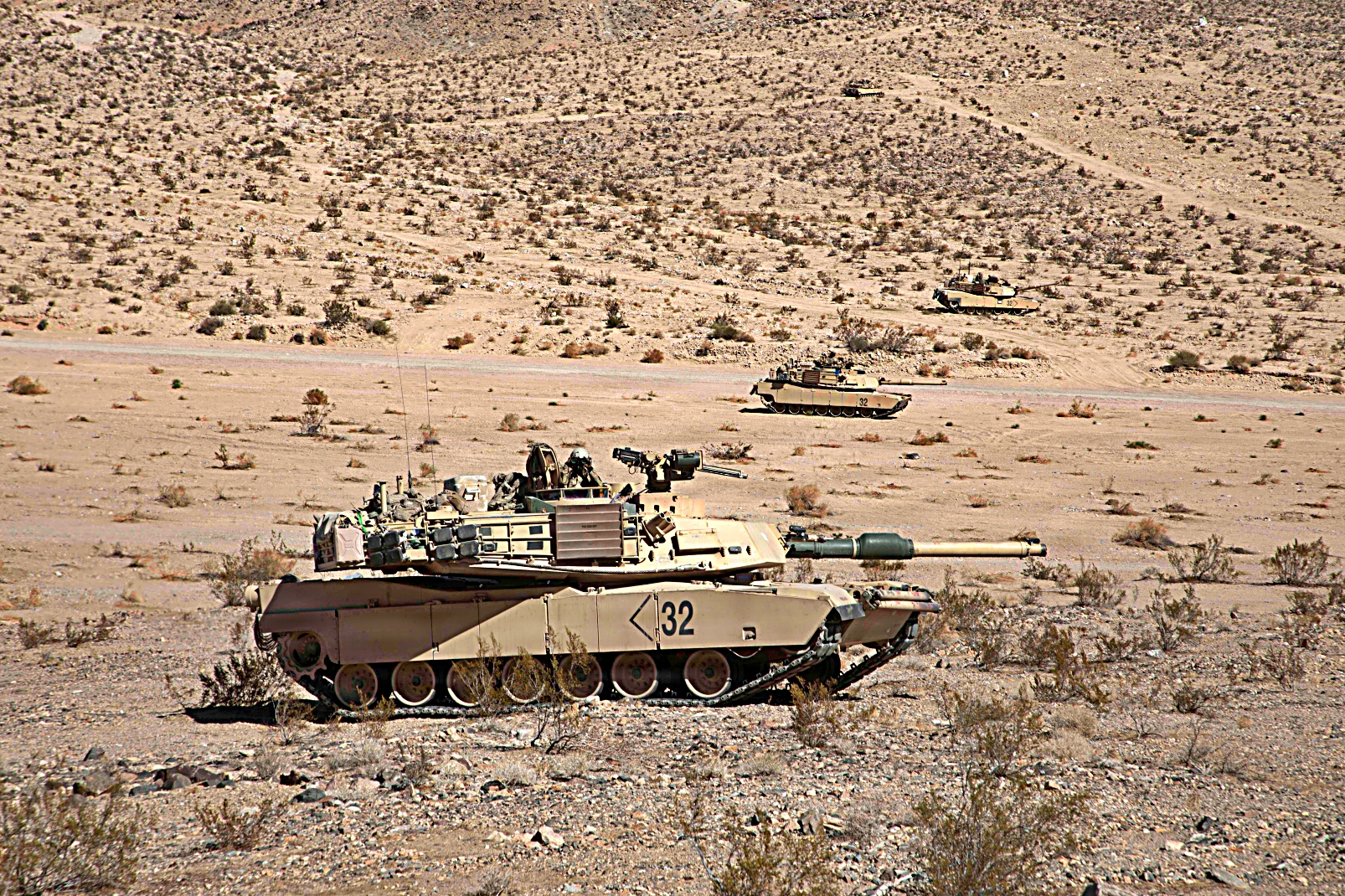 2025년 10월 4일과 5일, 캘리포니아주 Fort Irwin 국립훈련센터에서 열린 Rotation 26-01훈련 중, 제1기갑사단 제1기갑여단전투팀 제4대대 70기갑연대 소속 M1 Abrams 전차가 방어 진지를 구축하고 제1기갑여단전투팀 제16공병대대 소속 Bradley 장갑차가 둑을 돌파하고 합동강습교 (Joint Assault Bridge)를 이용하여 습지 도하 훈련을 실시하고 있다.