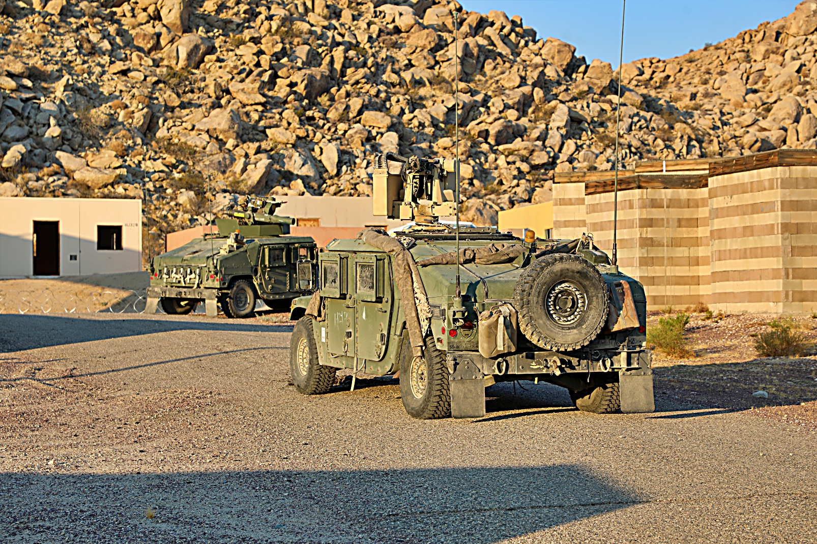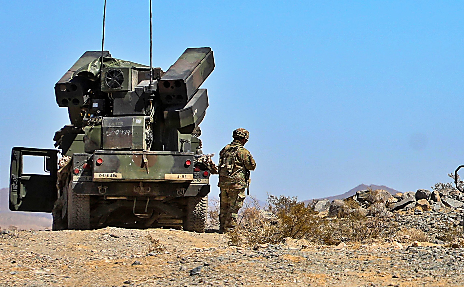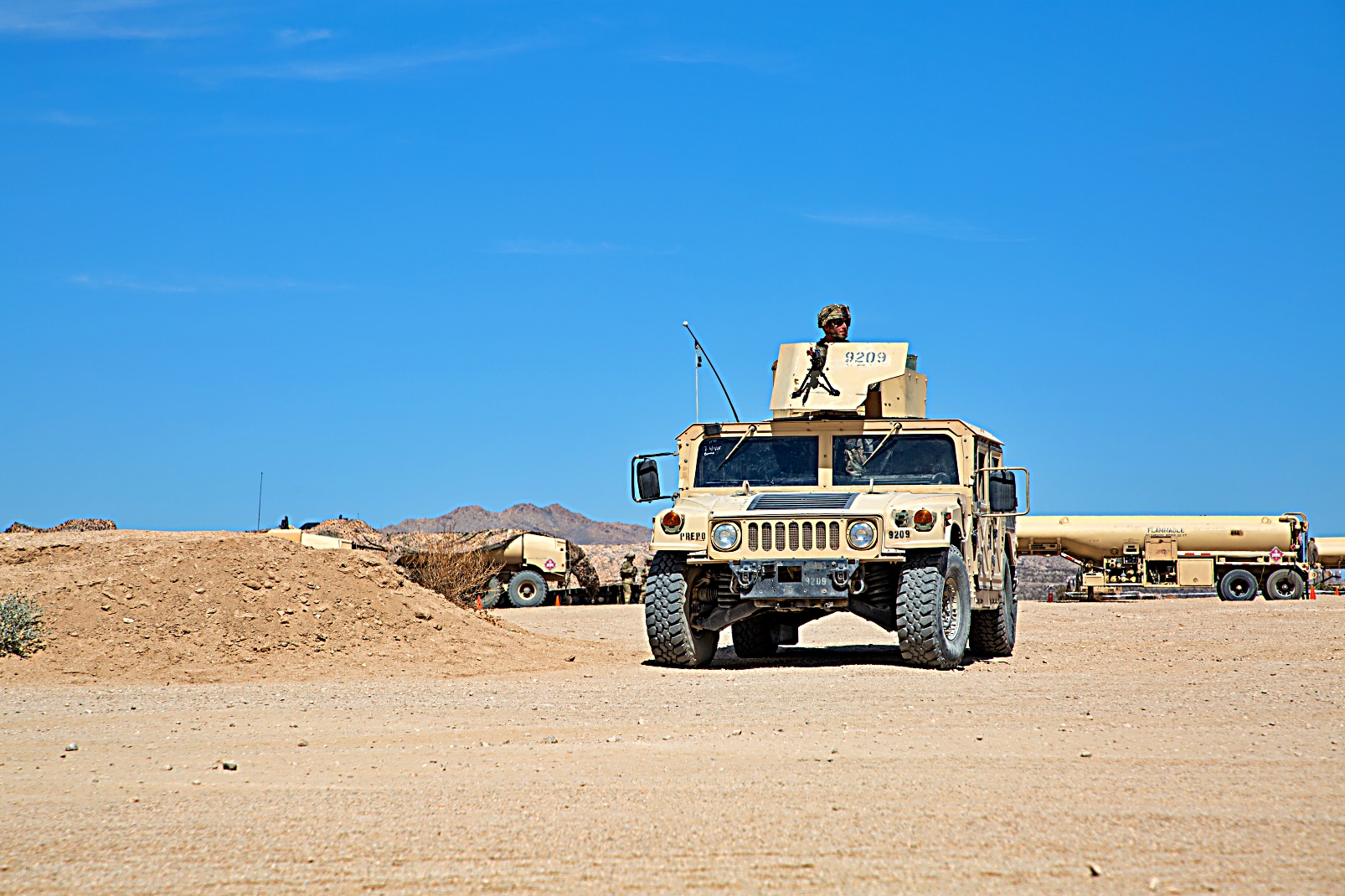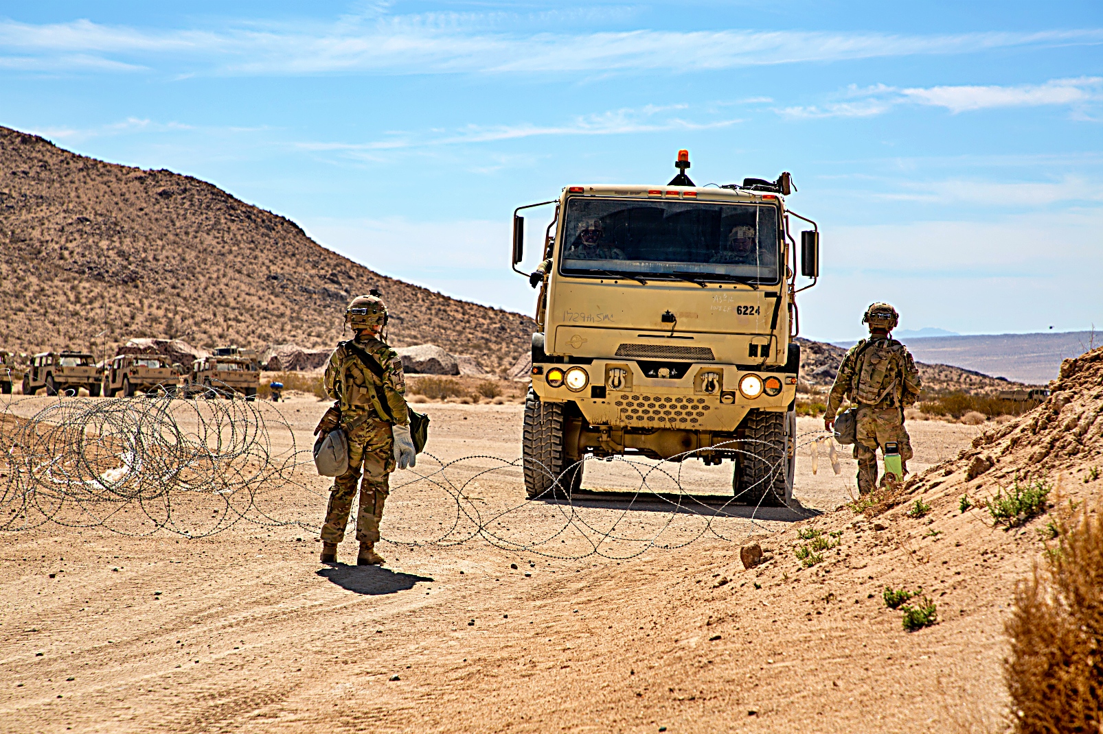 2025년 7월 26일과 8월 3일, 캘리포니아주 Fort Irwin 국립훈련센터에서 열린 Rotation 25-09 훈련 중, 플로리다 주방위군(FLARNG) 제53보병여단전투팀 제53여단지원대대 소속 미군 병사들이 분대 기반 기동, 시가전, 근접 전투를 포함하는 시가전 시나리오를 수행하고 플로리다 주방위군(FLARNG) 제53보병여단전투팀을 지원하는 마린 주방위군(MARNG) 제1297전투지원대대 소속 미군 병사들이 군수지원작전을 수행하고 물자 보급품을 준비하는 가운데 제53보병여단전투팀을 지원하는 오하이오주 방위군(OHARNG) 제2대대 174방공포병여단 소속 미군 병사들이 Avenger 방공시스템을 이용해 방어 사격을 실시하고 있다
