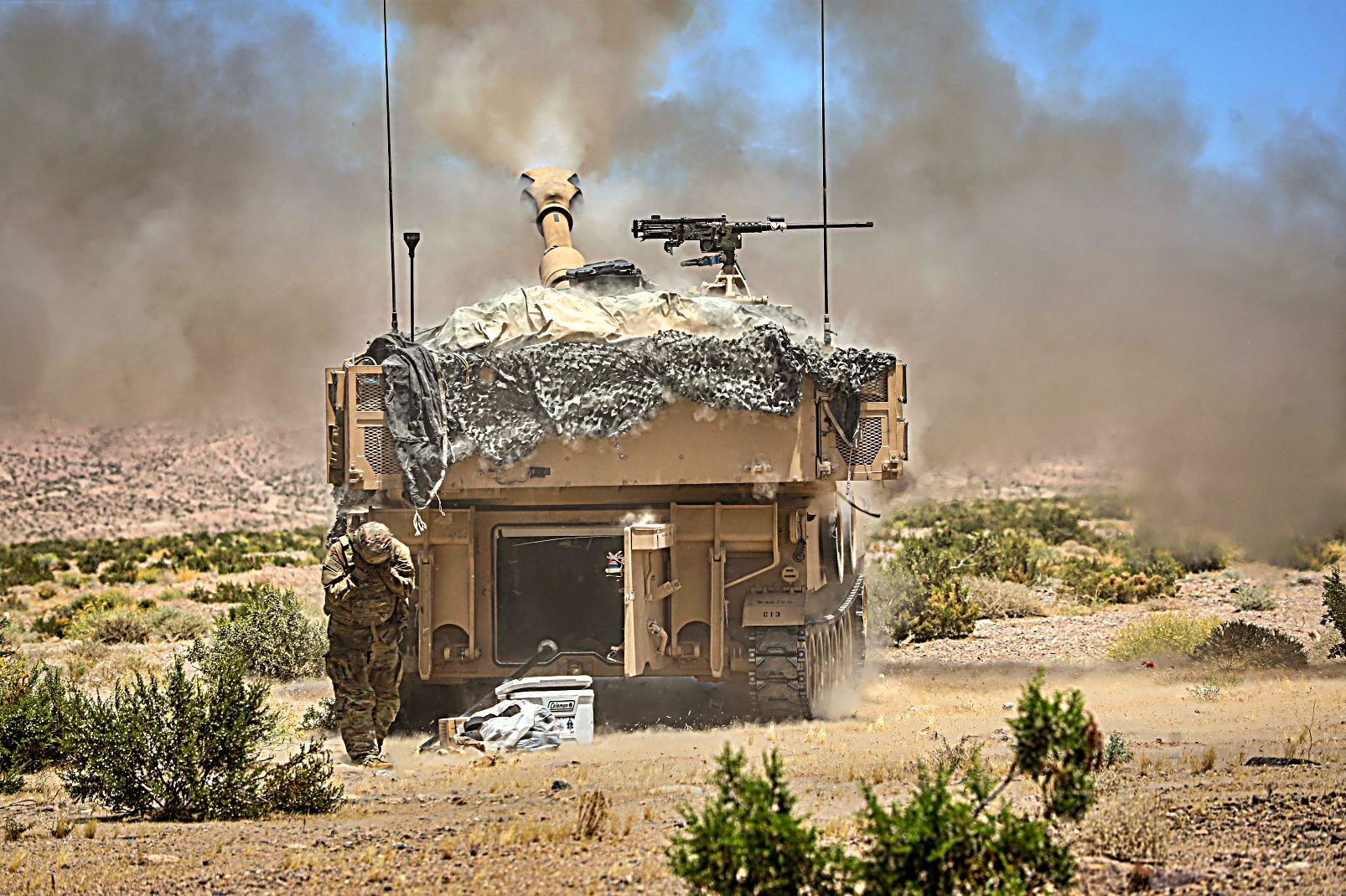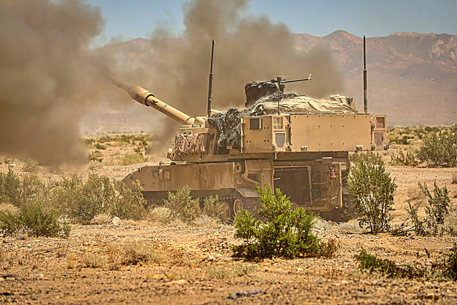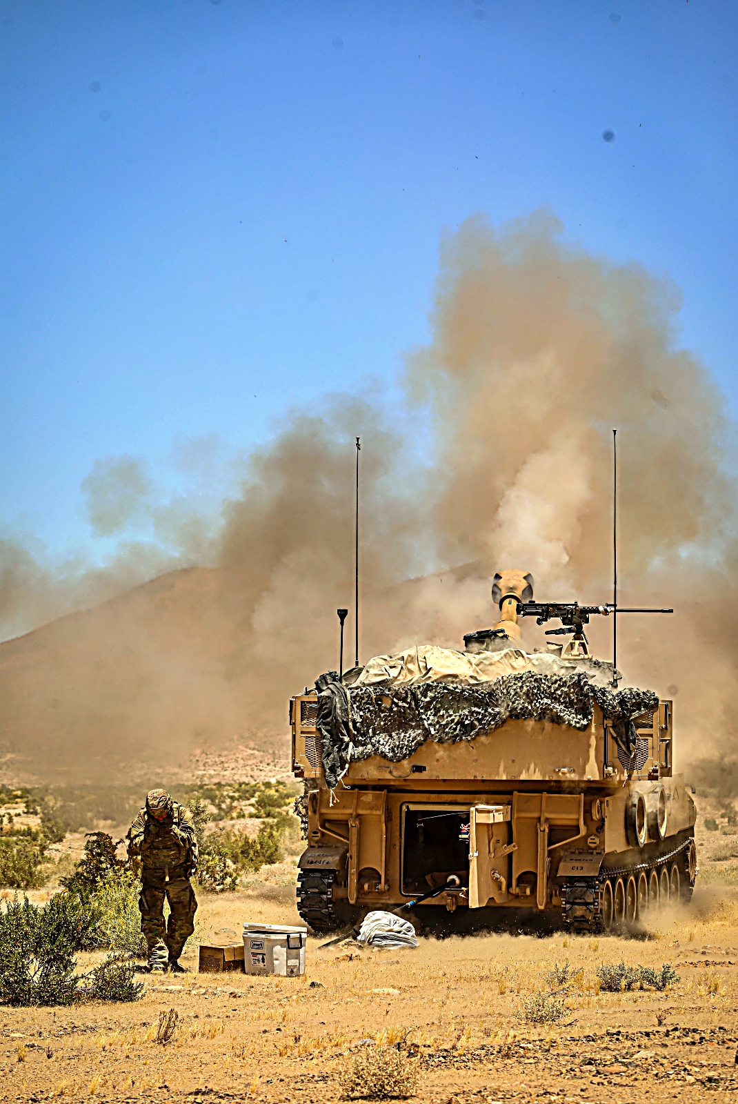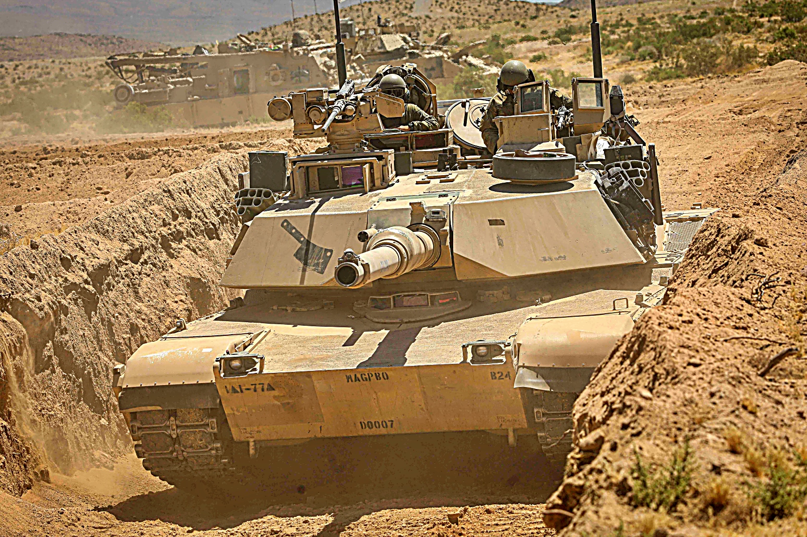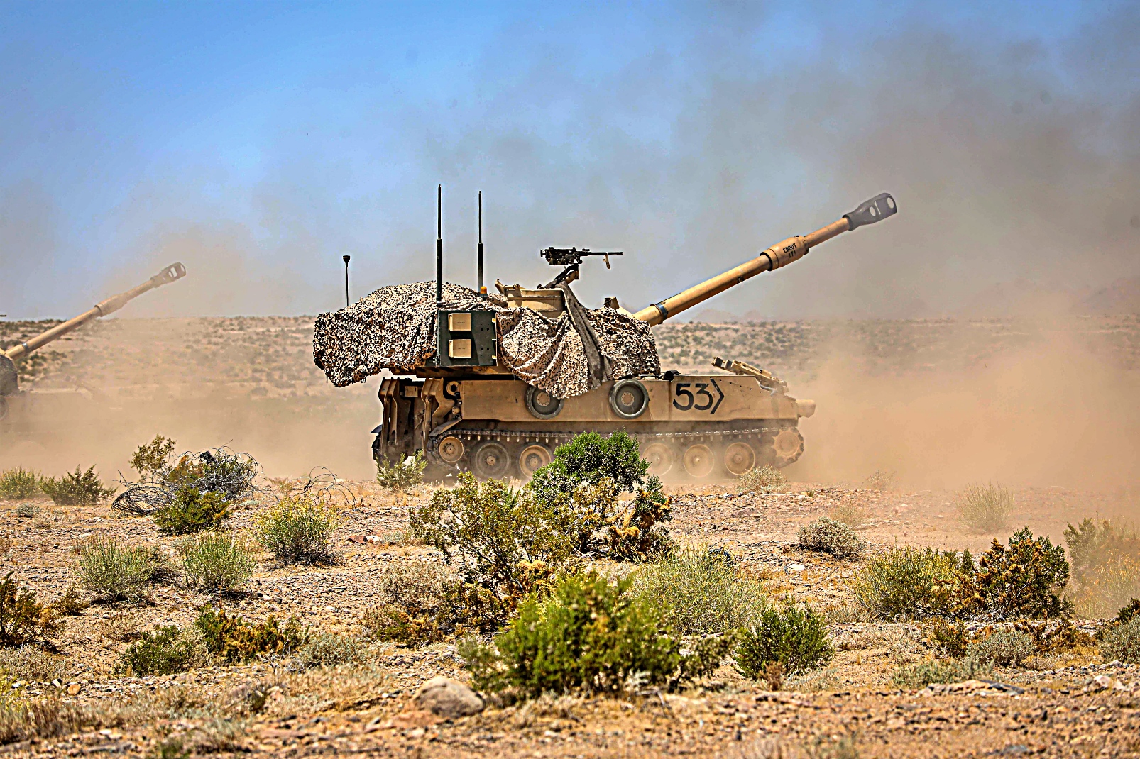 2024년 6월 13일부터 13일사이 캘리포니아주 Fort Irwin 국립훈련센터에서 실시된 Rotation 24-08 훈련 중 미 제1기갑사단 제3기갑여단전투팀 제77기갑연대 제1대대 소속 M1 전차와 제67기갑연대 제1대대 Bradley 장갑차를 기동시키고 미 제1기갑사단 제3기갑여단전투팀 제1야전포병연대 제4대대 소속 병사들이 M109 Paladin 자주포를 이용 가상 적진에 포격을 가하고 있다.