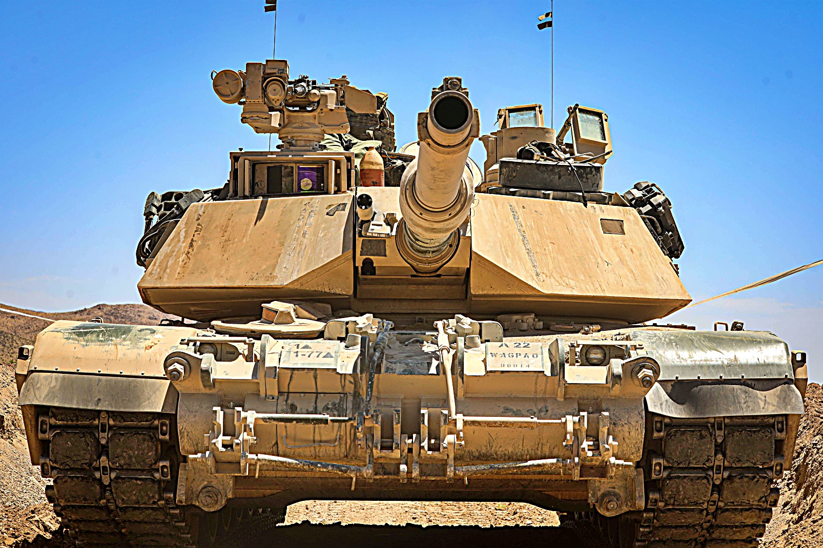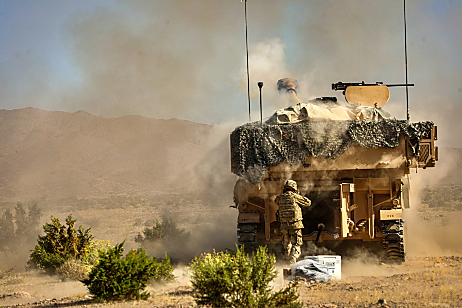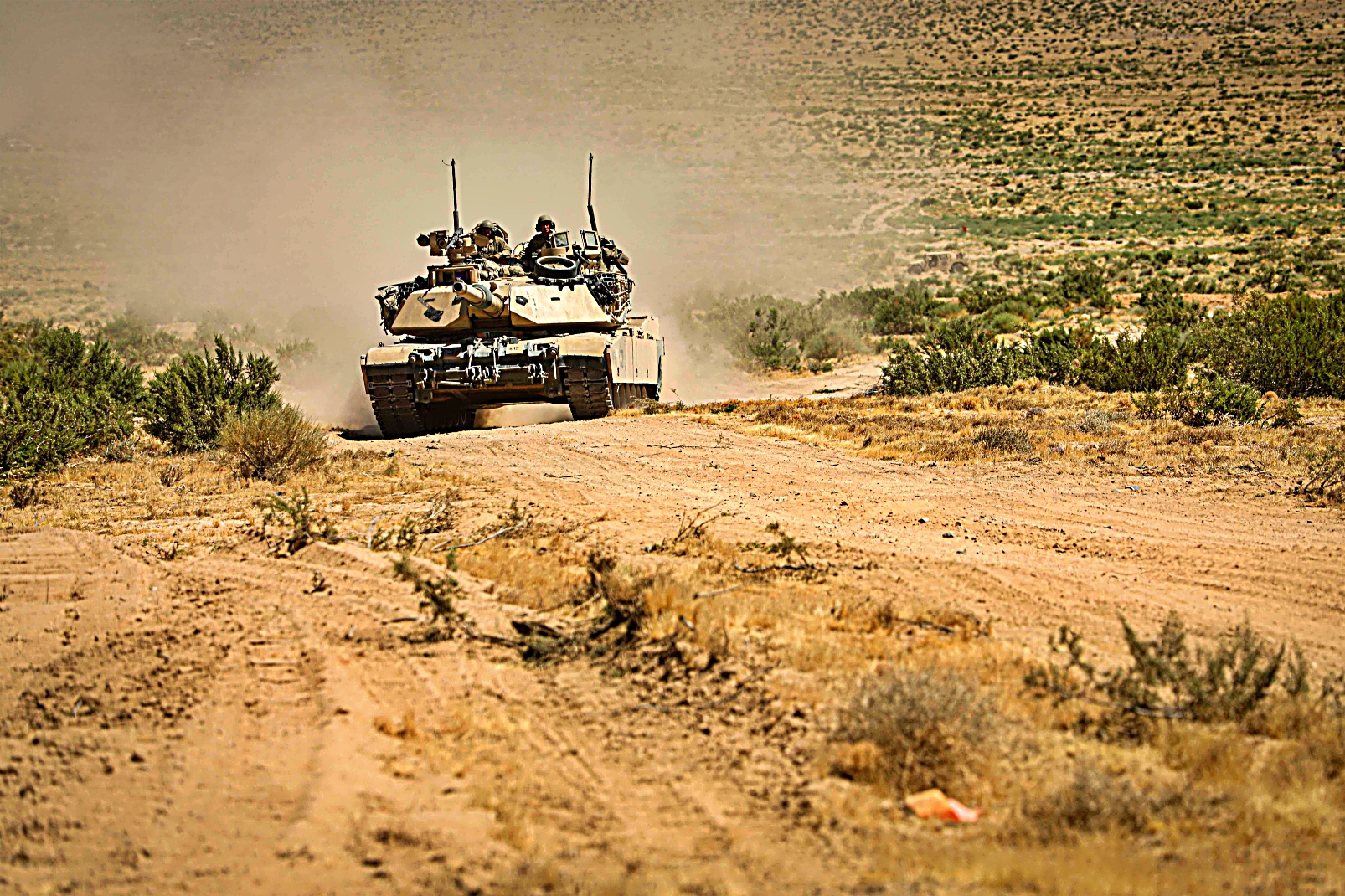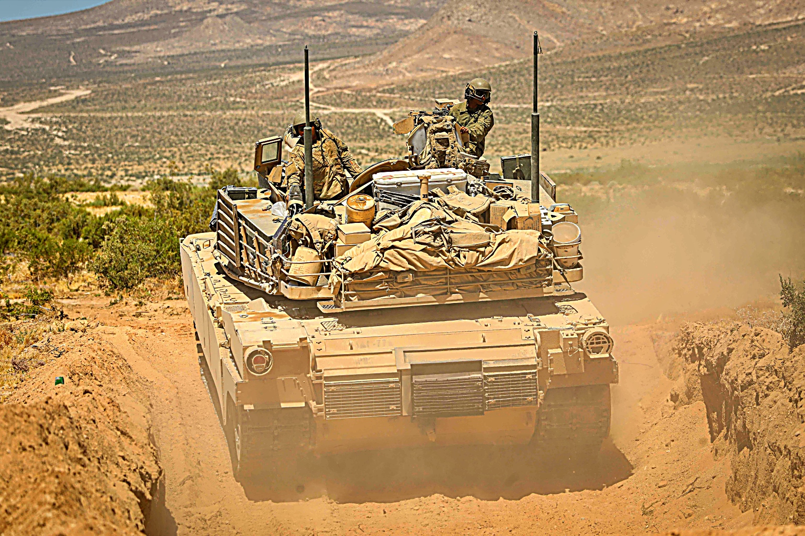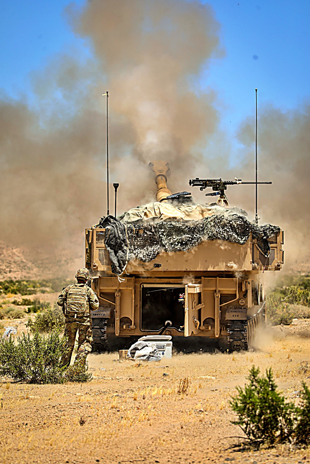 2024년 6월 13일부터 13일사이 캘리포니아주 Fort Irwin 국립훈련센터에서 실시된 Rotation 24-08 훈련 중 미 제1기갑사단 제3기갑여단전투팀 제77기갑연대 제1대대 소속 M1 전차와 제67기갑연대 제1대대 Bradley 장갑차를 기동시키고 미 제1기갑사단 제3기갑여단전투팀 제1야전포병연대 제4대대 소속 병사들이 M109 Paladin 자주포를 이용 가상 적진에 포격을 가하고 있다.