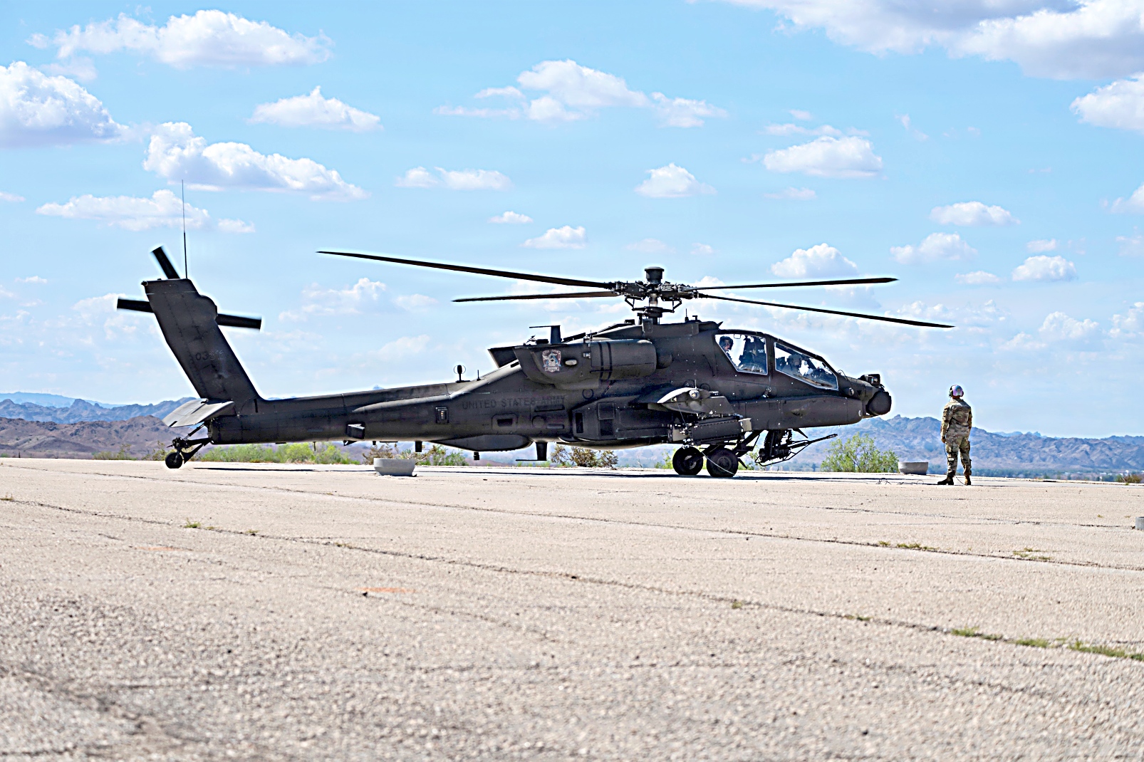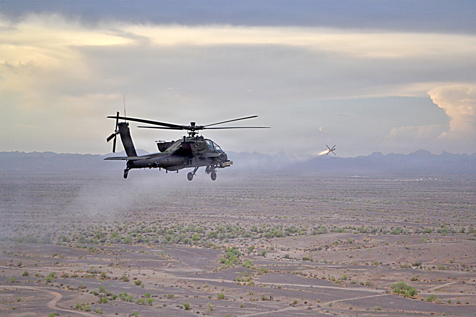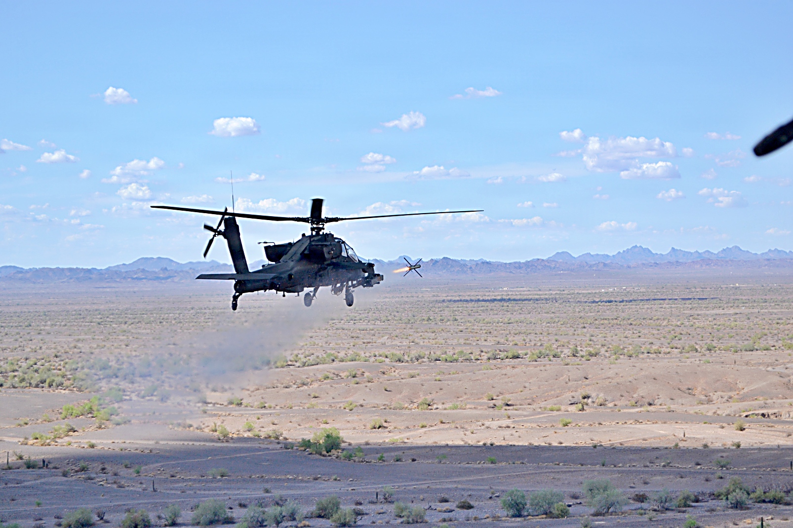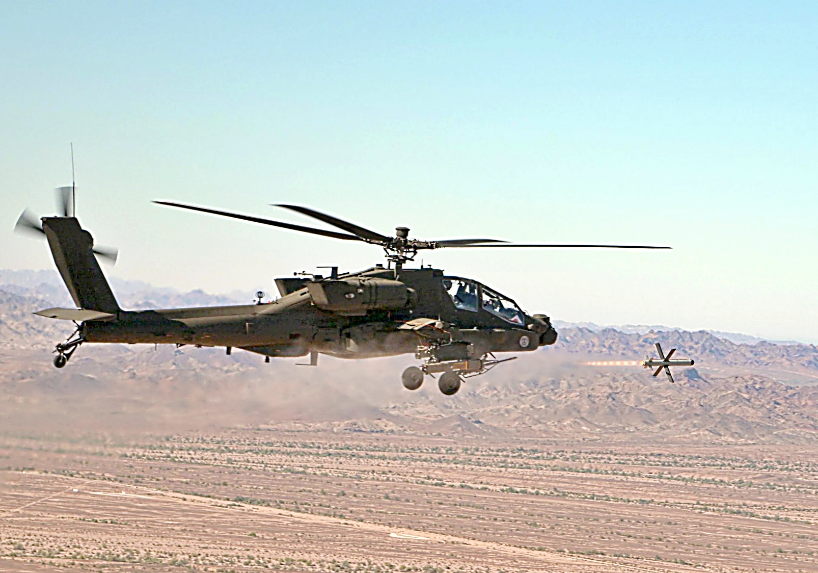 2025년 9월 5일, 애리조나주 유마 시험장에서 1-229 공격대대 소속 AH-64E 공격 헬리콥터가 SPIKE 비가시선 미사일 개발 시험 중 발사 준비를 하고 있다. 이 헬리콥터는 기존 무기 체계를 개선하고 육군 항공 전력의 전투력과 능력을 향상시키기 위한 노력의 일환으로 16전투항공여단 소속 조종사들이 조종했다.