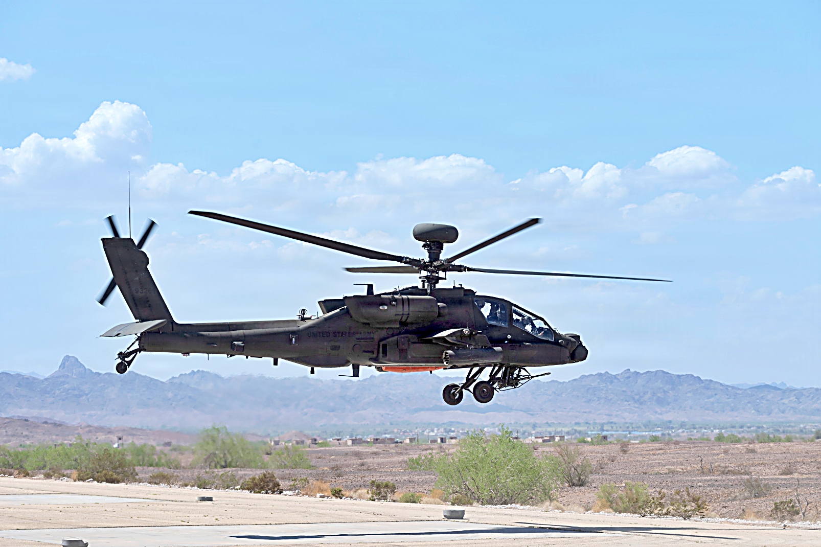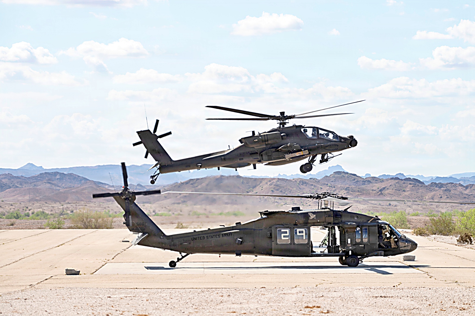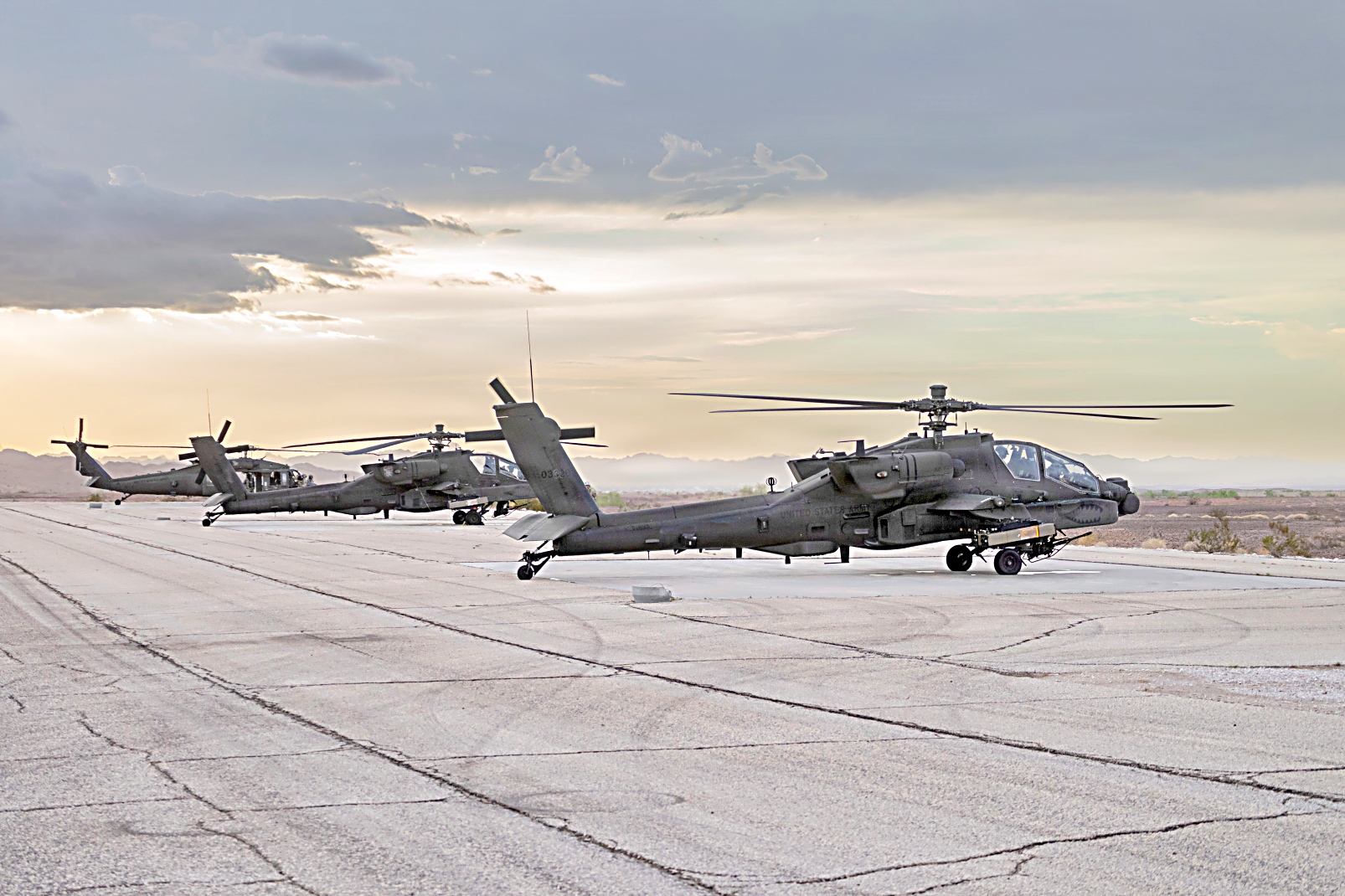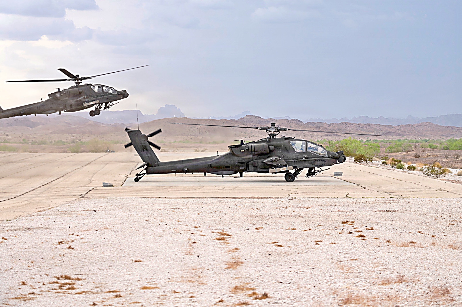 2025년 9월 5일, 애리조나주 유마 시험장에서 1-229 공격대대 소속 AH-64E 공격 헬리콥터가 SPIKE 비가시선 미사일 개발 시험 중 발사 준비를 하고 있다. 이 헬리콥터는 기존 무기 체계를 개선하고 육군 항공 전력의 전투력과 능력을 향상시키기 위한 노력의 일환으로 16전투항공여단 소속 조종사들이 조종했다.
