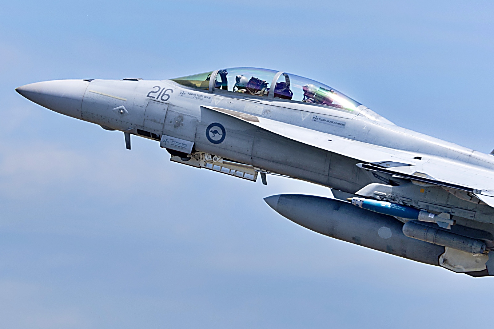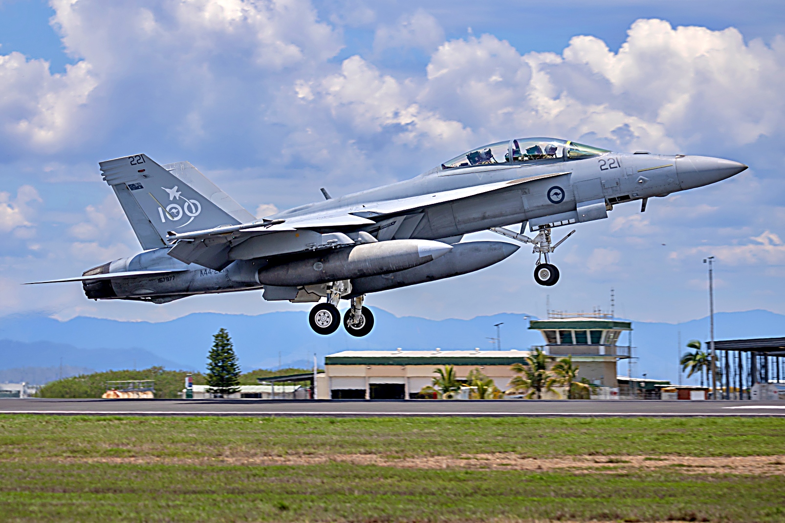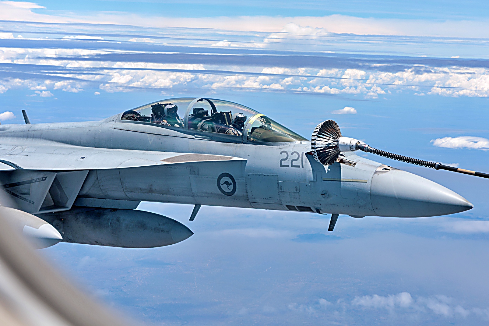 호주 왕립 공군 소속 F/A-18F Super Hornet 전투기 두 대가 Crimson Dawn 훈련 중 KC-30A 다목적 공중급유기와 함께 비행하며 공중급유를 받고 있다.