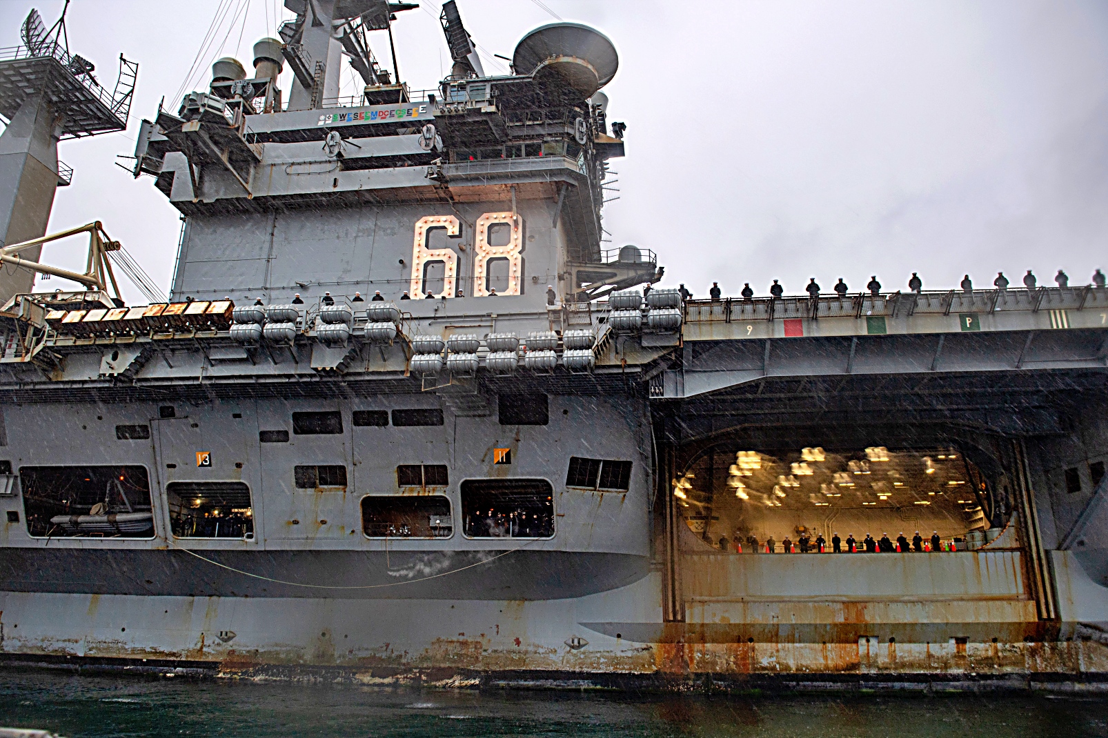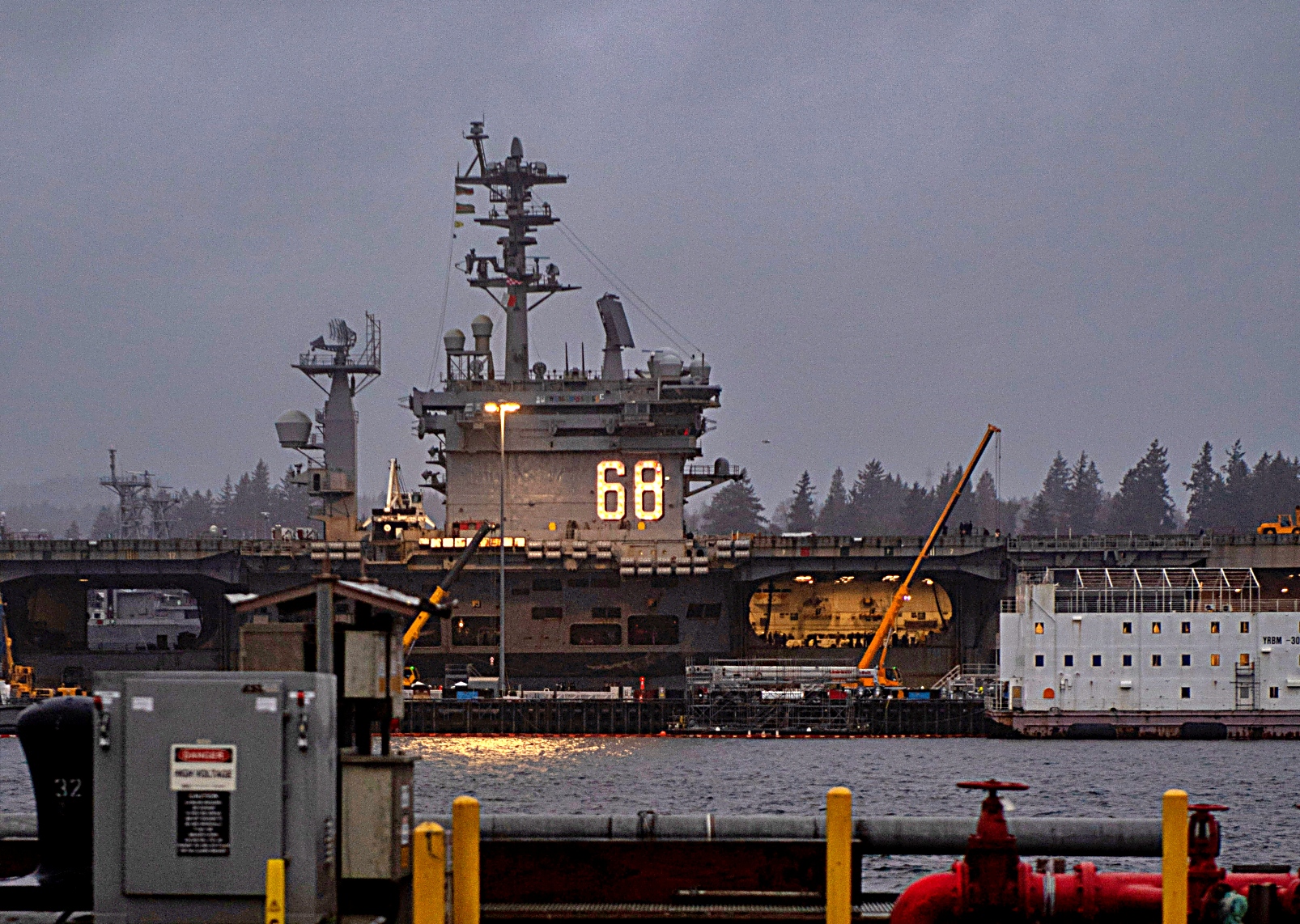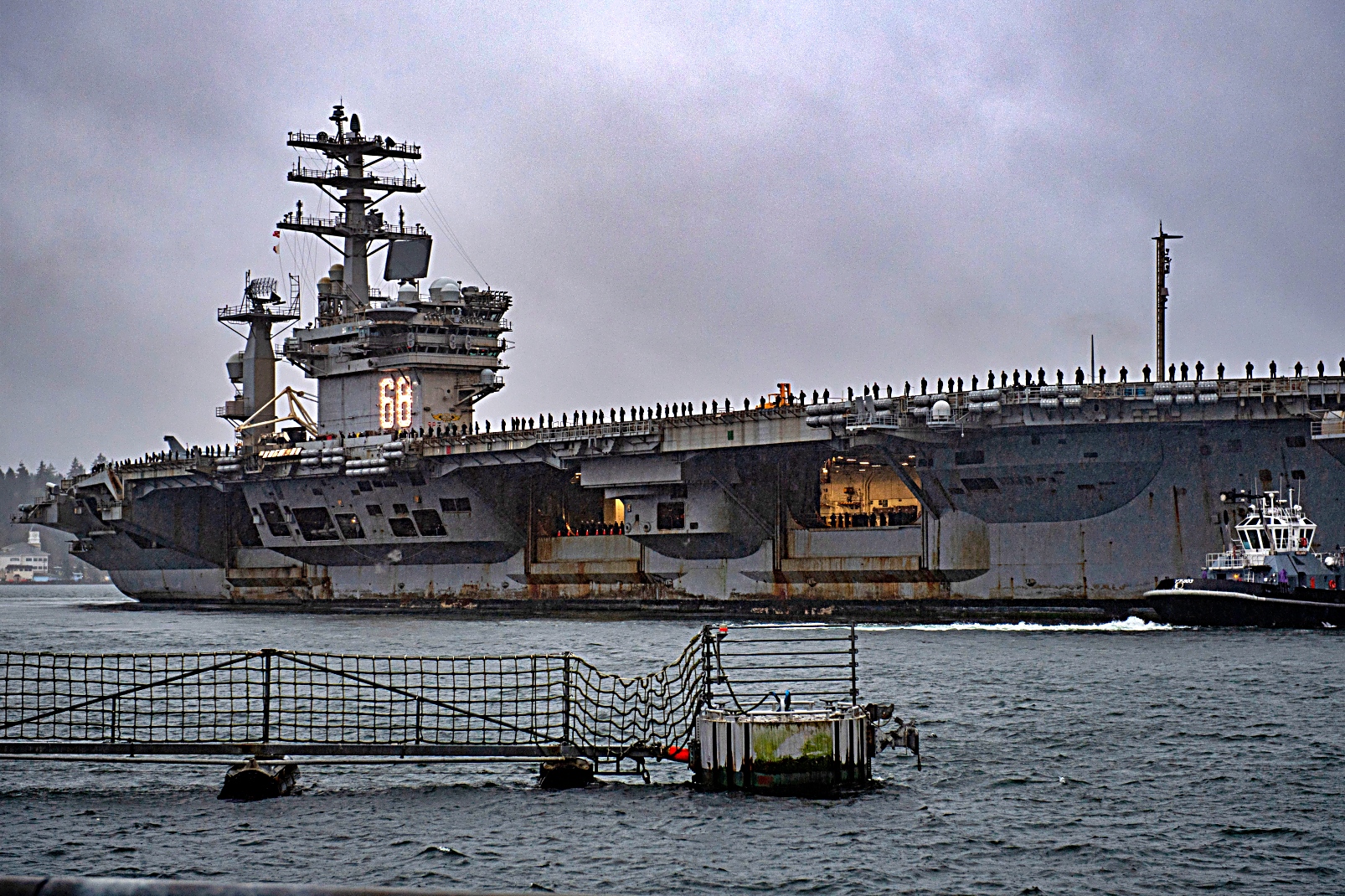 Nimitz급 항공모함 USS Nimitz (CVN 68)함이 2025년 12월 16일 워싱턴주 Kitsap-Bremerton 해군기지로 귀환하며 Puget Sound를 통과하고 있다. 제11항모타격단(CSG 11)의 기함인 Nimitz 항모는 미 제3, 5, 7함대 작전구역에서 9개월간의 임무를 마치고 모항인 Bremerton으로 복귀했다.