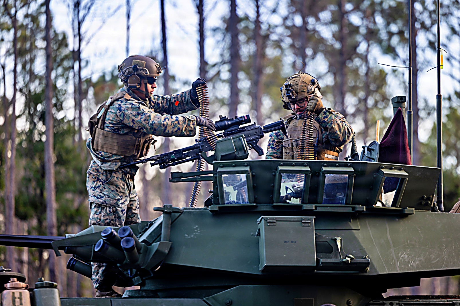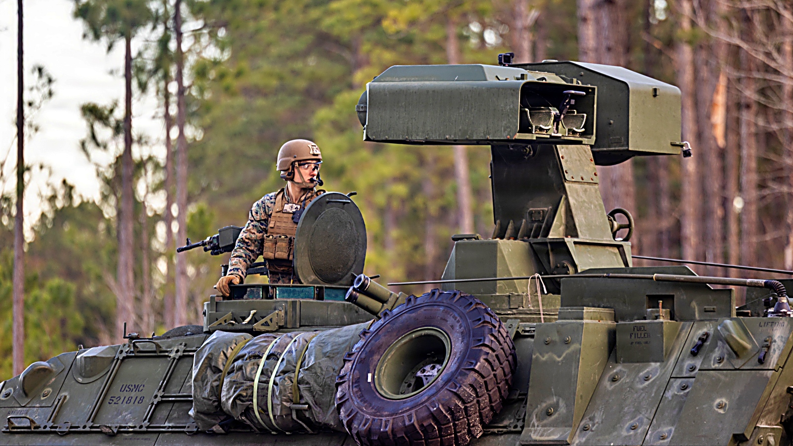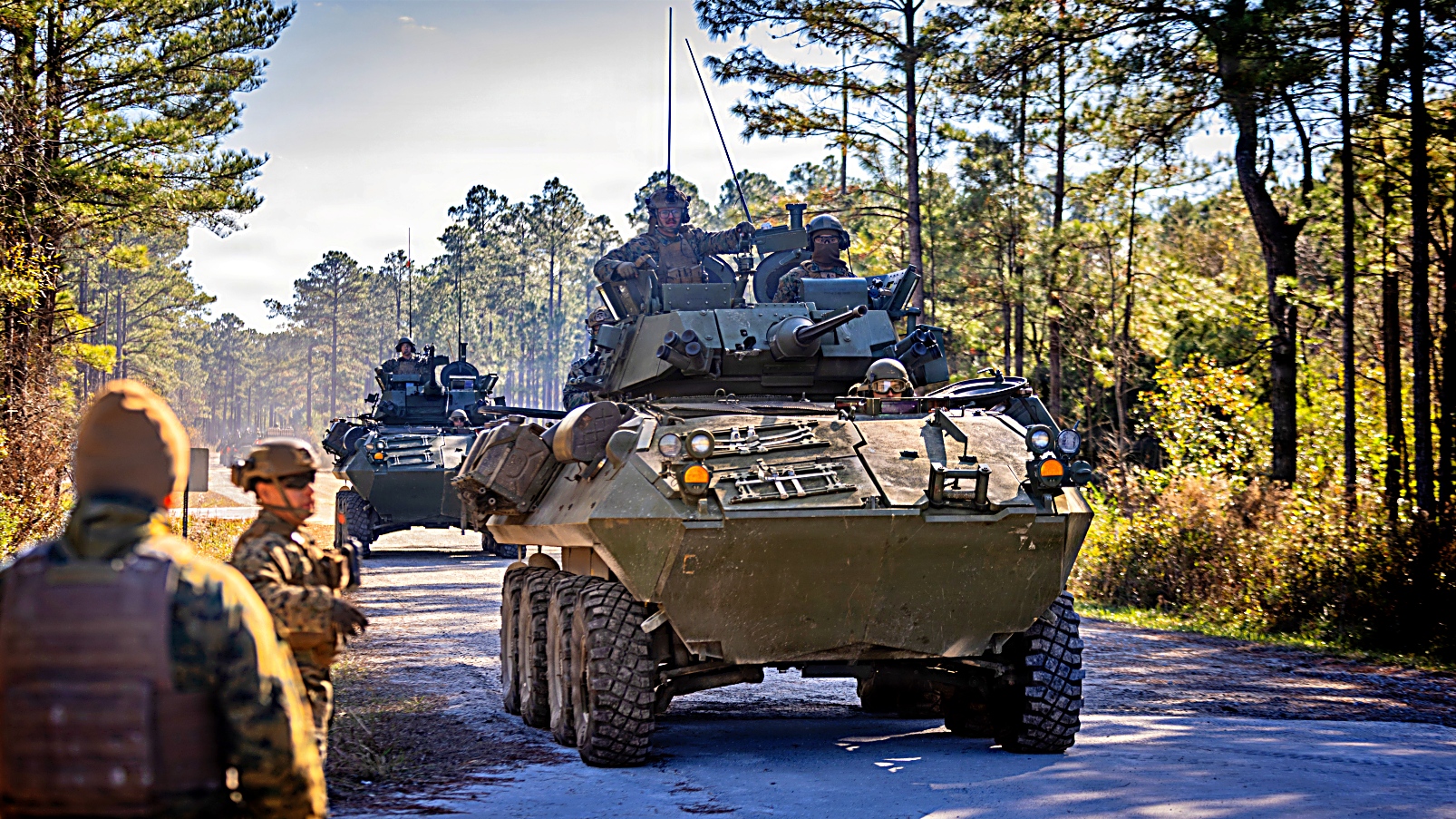 2025년 12월 11일, 노스캐롤라이나주 Camp Lejeune 해병기지에서 미 해병대 제2사단 제2경장갑정찰대대 소속 해병대원들이 Lockheed Martin VXE-30 Stalker 무인정찰기를 이용한 정찰활동 후 TOW 미사일(장거리 발사, 광학 추적, 유선 유도 방식) 사격 훈련장에서 TOW 미사일을 발사하고 LAV-25(경장갑차 25)의 기동 후 사격을 실시했다.
