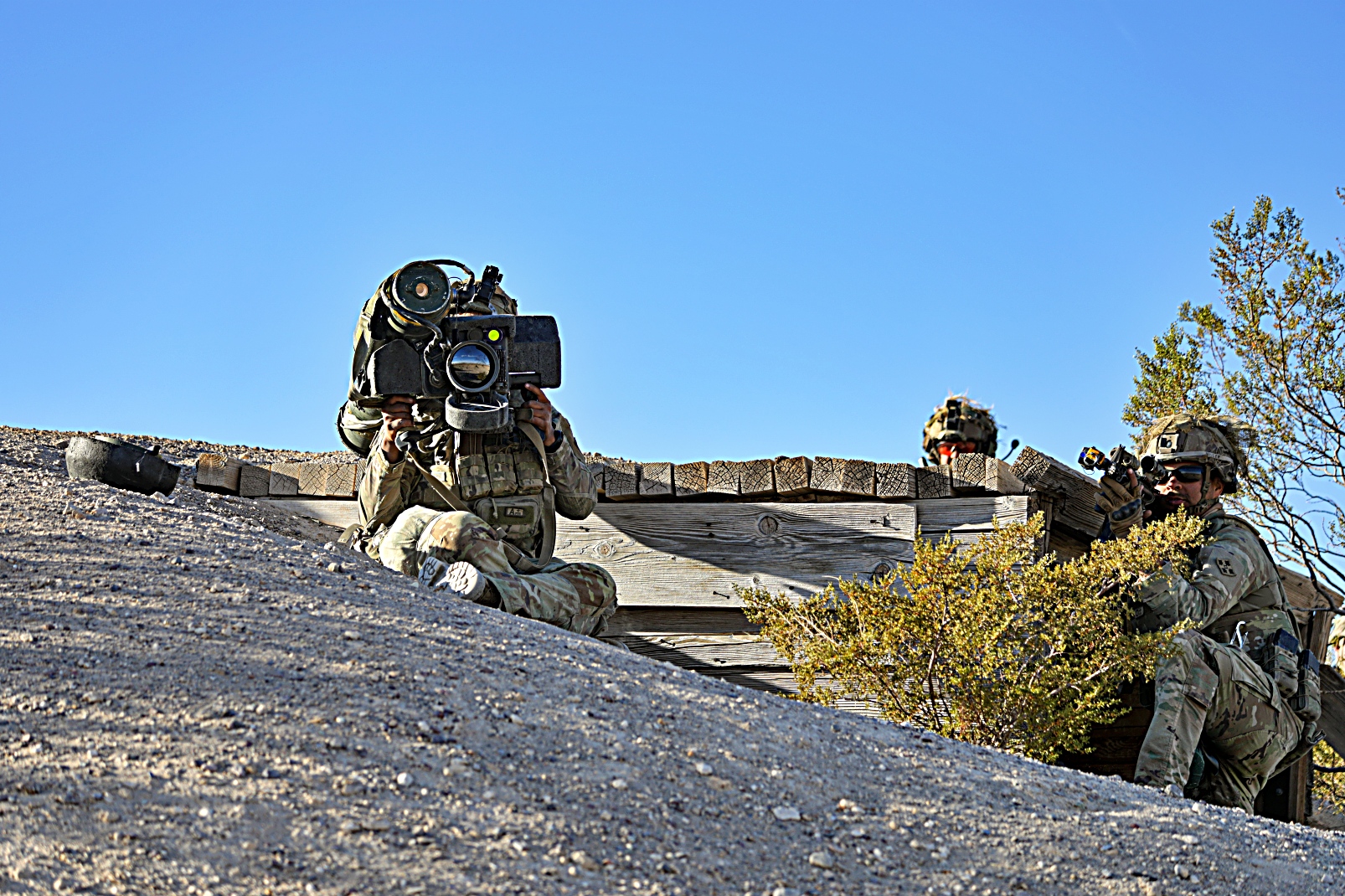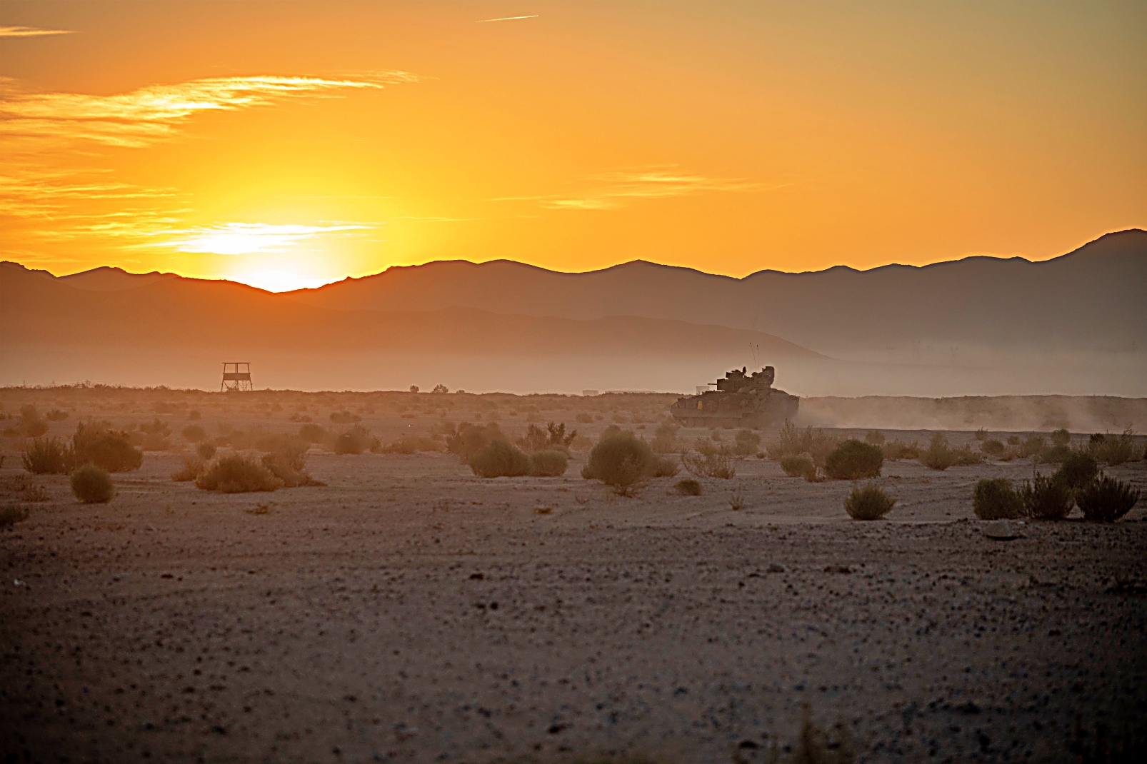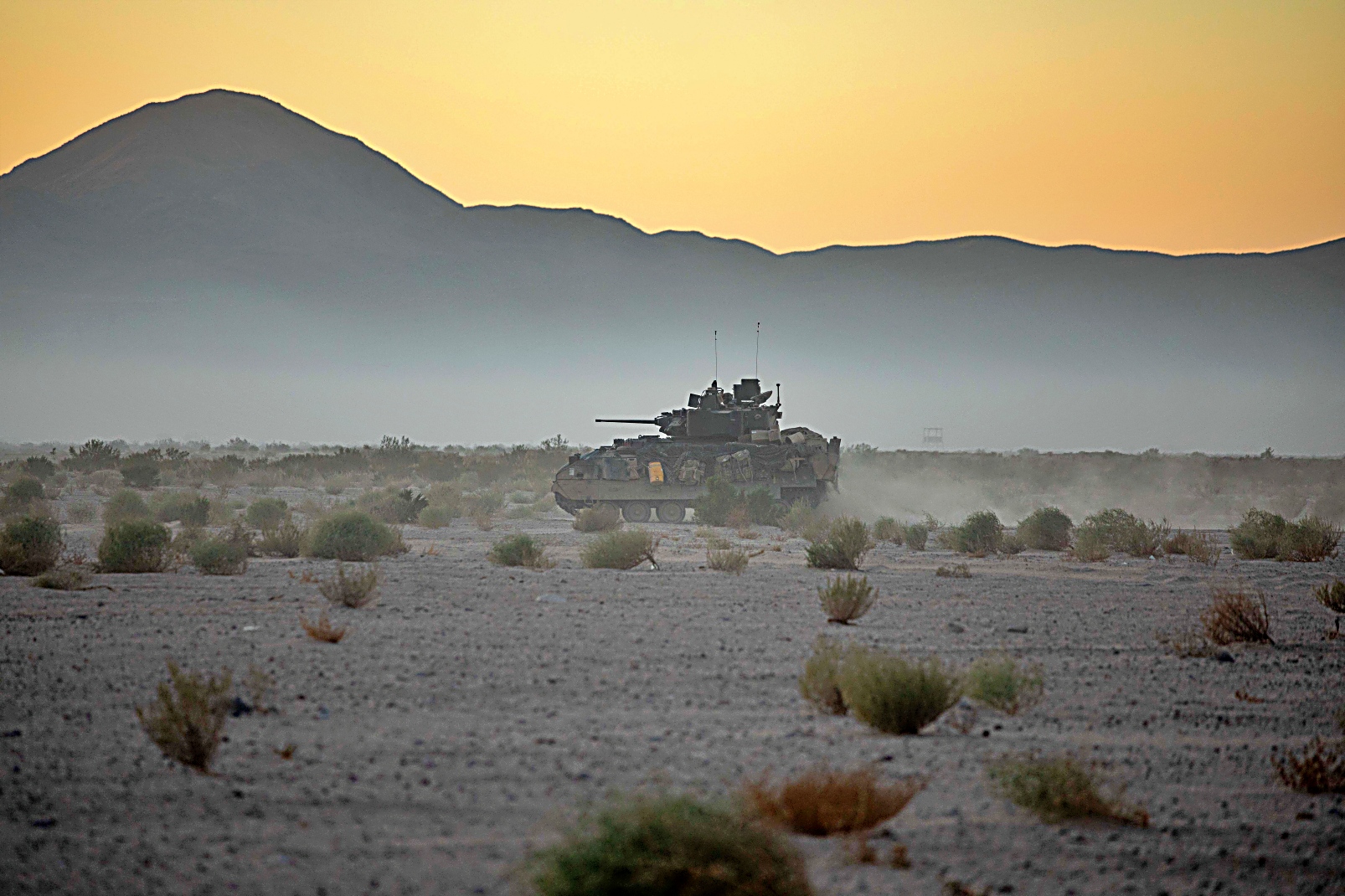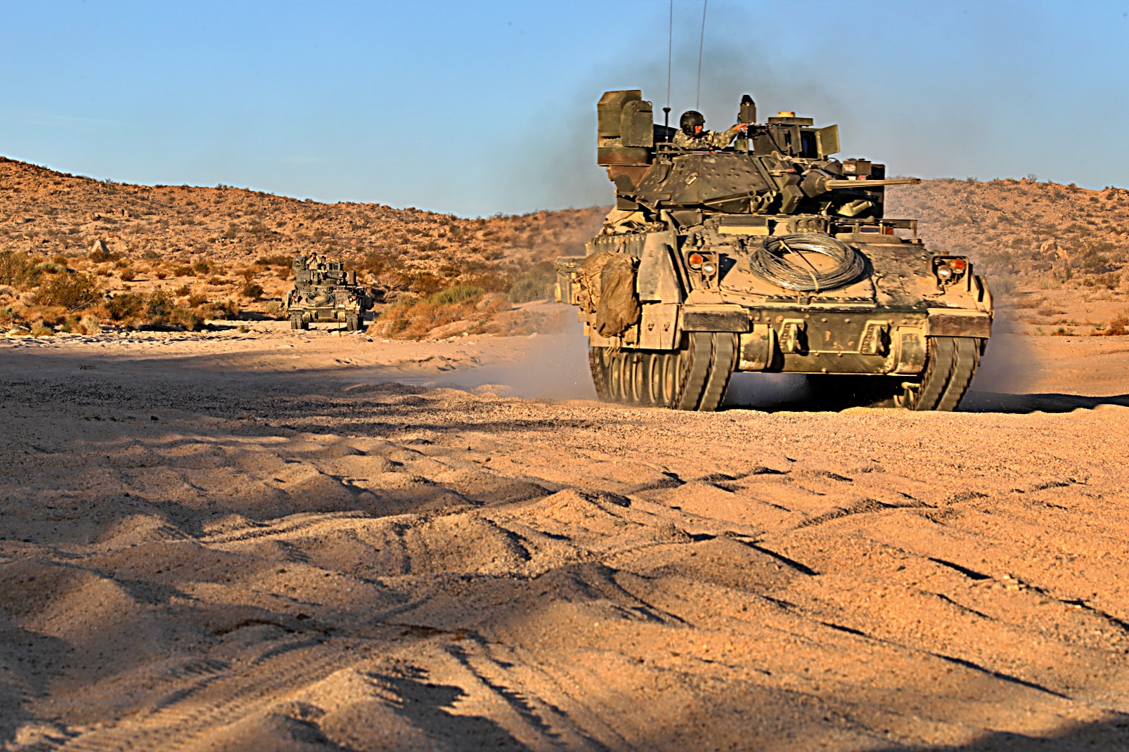 2024년 10월 30일부터 31일 사이 캘리포니아주 Fort Irwin 국립훈련센터에서 열린 제1기병사단 제2기갑여단전투팀 제5기병연대 제31대대와 제1대대의 Rotation 25-02 훈련 중, 미군 장병들이 M1150 강습공병전차를 동원 돌파 작전을 수행하고 있다.