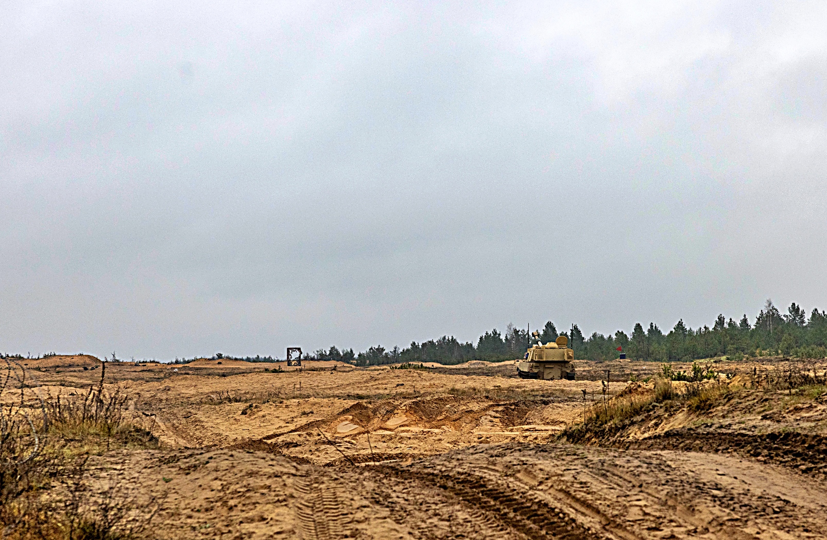 2025년 12월 15일, 라트비아 Adazi에서 열린 베스트 바이 테스트(Best By Test) 대회에서 미군 제1기병사단 사단포병대 제82야전포병연대 2대대 소속 병사들이 M109A7 Paladin 자주포를 직접 사격하고 있다. 대회 첫날, 병사들은 다양한 거리의 여러 종류의 표적을 명중시키고 스트레스 사격 훈련을 수행해야 했다. 이 대회는 실전과 유사한 환경에서 시간 제한 실사격 임무, 체력 테스트, 기본 병사 임무 수행 등을 통해 최고의 병사들을 선발했다.