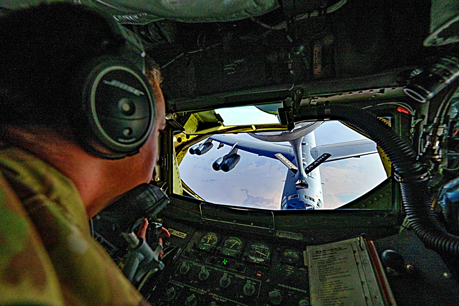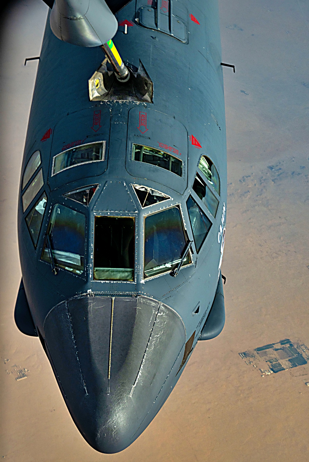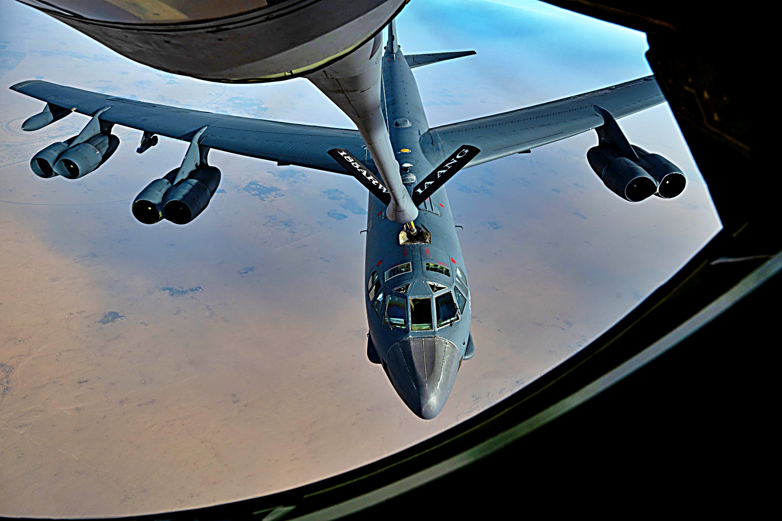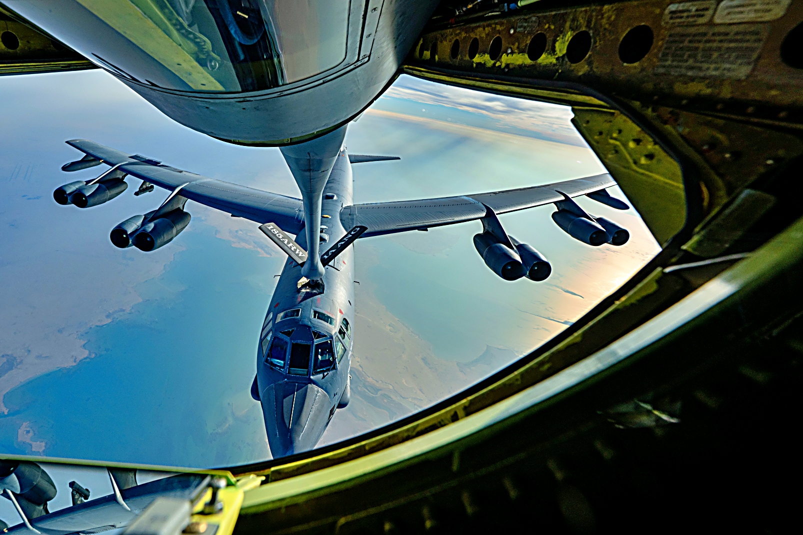 2025년 11월 17일, 미 중부사령부 작전책임지역에서 실시된 폭격기 태스크포스(BTF) 임무 중, 미 공군 제96원정폭격비행대대 소속 B-52H 폭격기가 제74원정공중급유비행대대 소속 KC-135R 공중급유기로부터 연료를 공급받으며 임무 비행을 수행하고 있다.