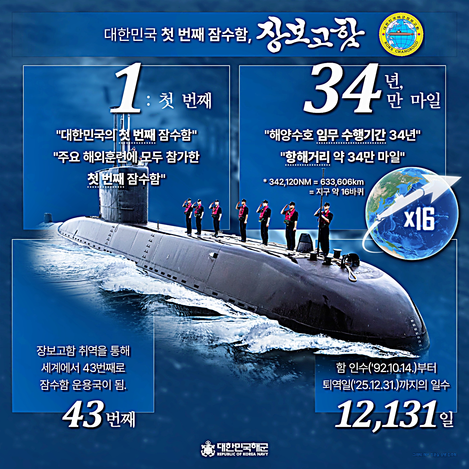 - 대한민국 1번 잠수함 장보고함, 34년간의 해양수호 임무 마치고 12월 31일 퇴역