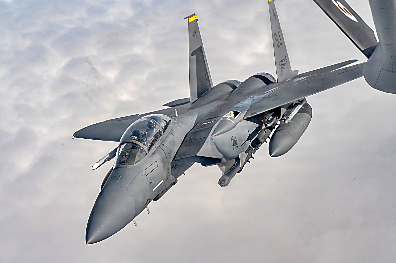 2025년 12월 18일, 미국 남동부 상공에서 노스캐롤라이나주 제4전투비행단 소속 F-15E Strike Eagle 전폭기가 메릴랜드주 Andrews 합동기지에 주둔하는 미 예비공군 제459공중급유비행단 제756공중급유비행대 소속 KC-135R Stratotanker로부터 공중 급유를 받으며 훈련비행중이다.