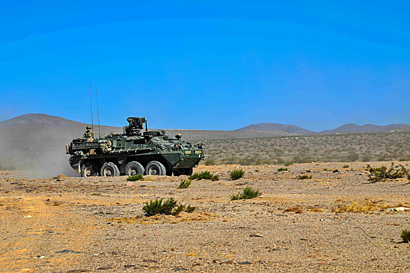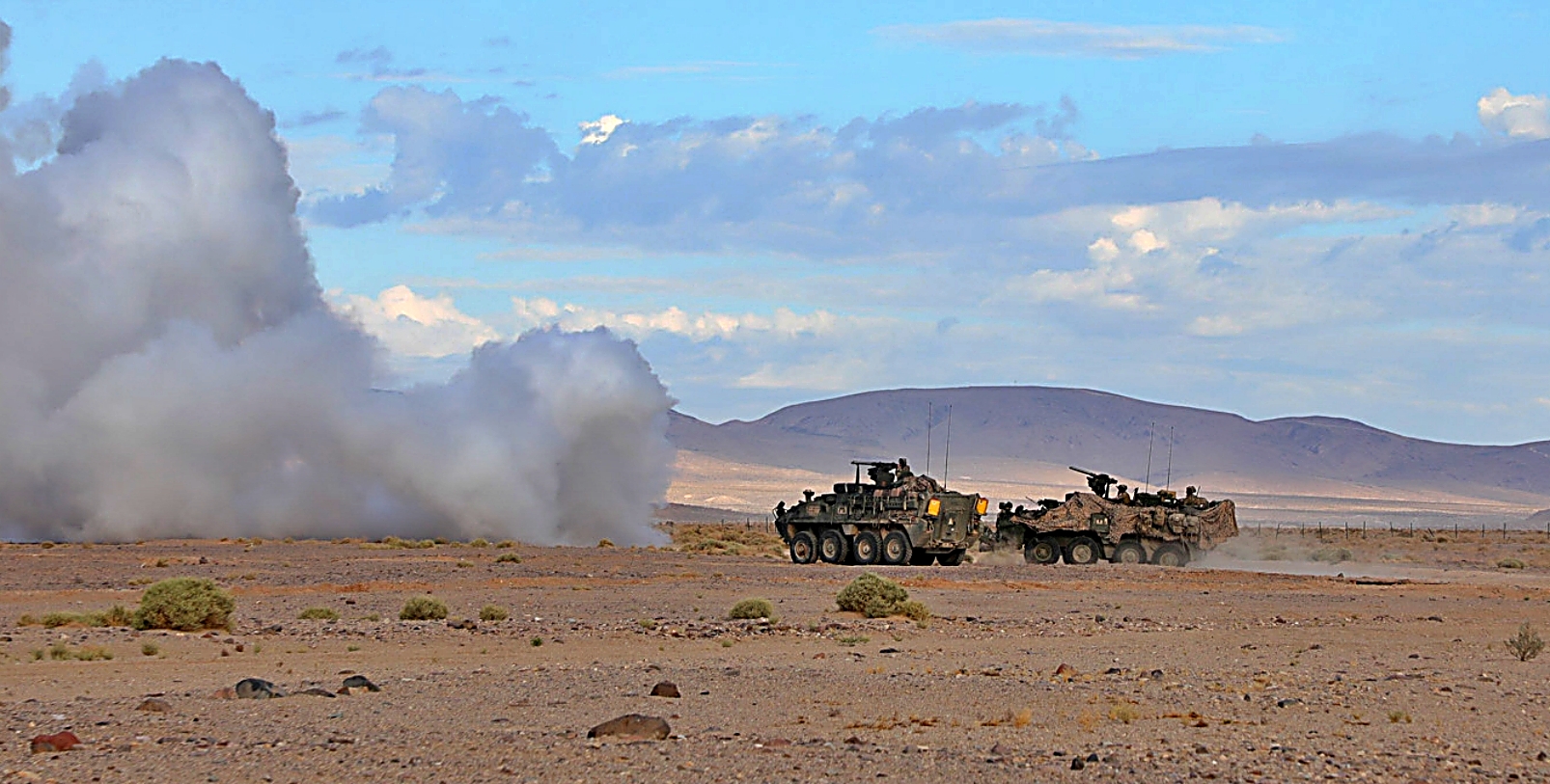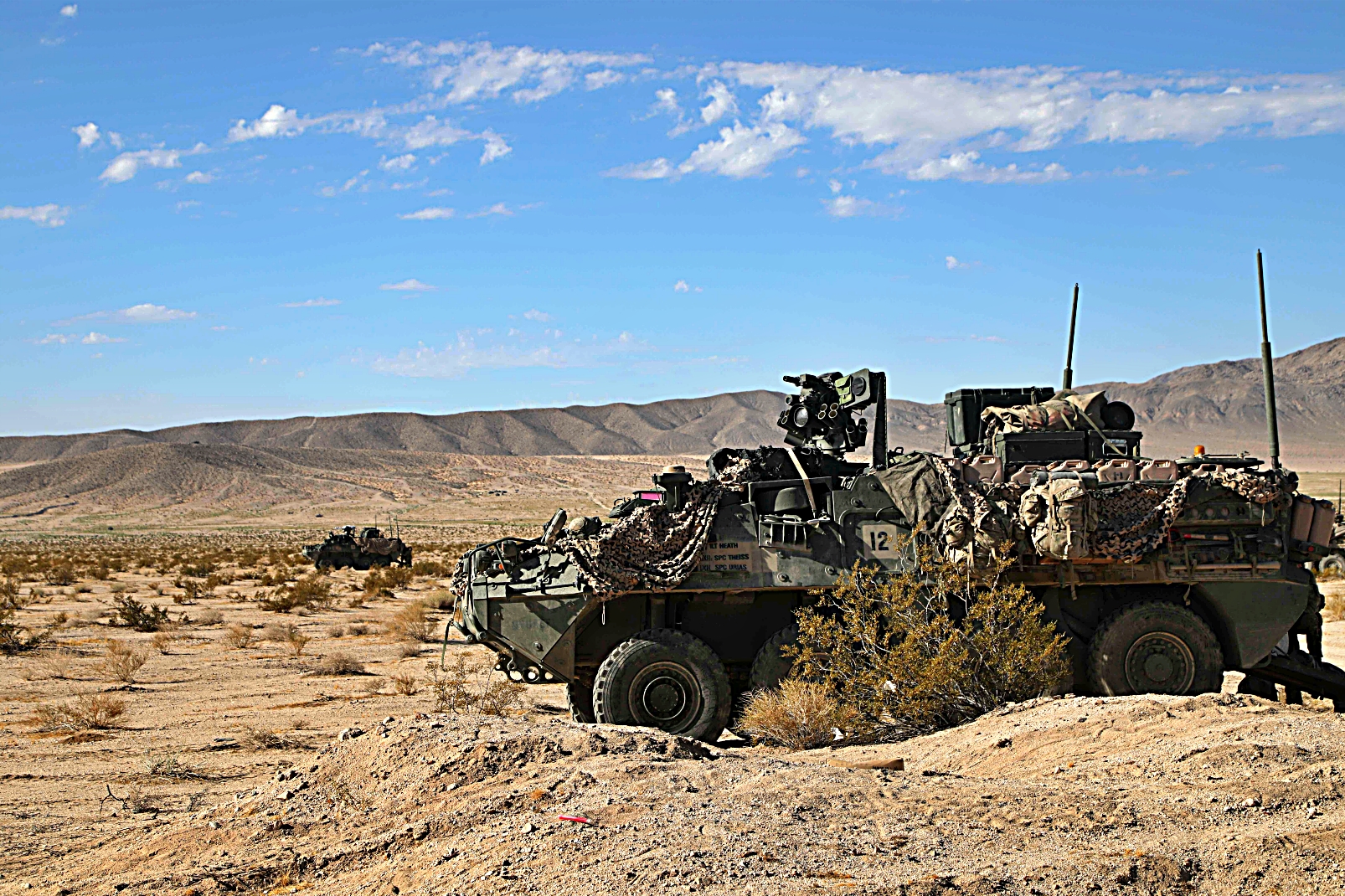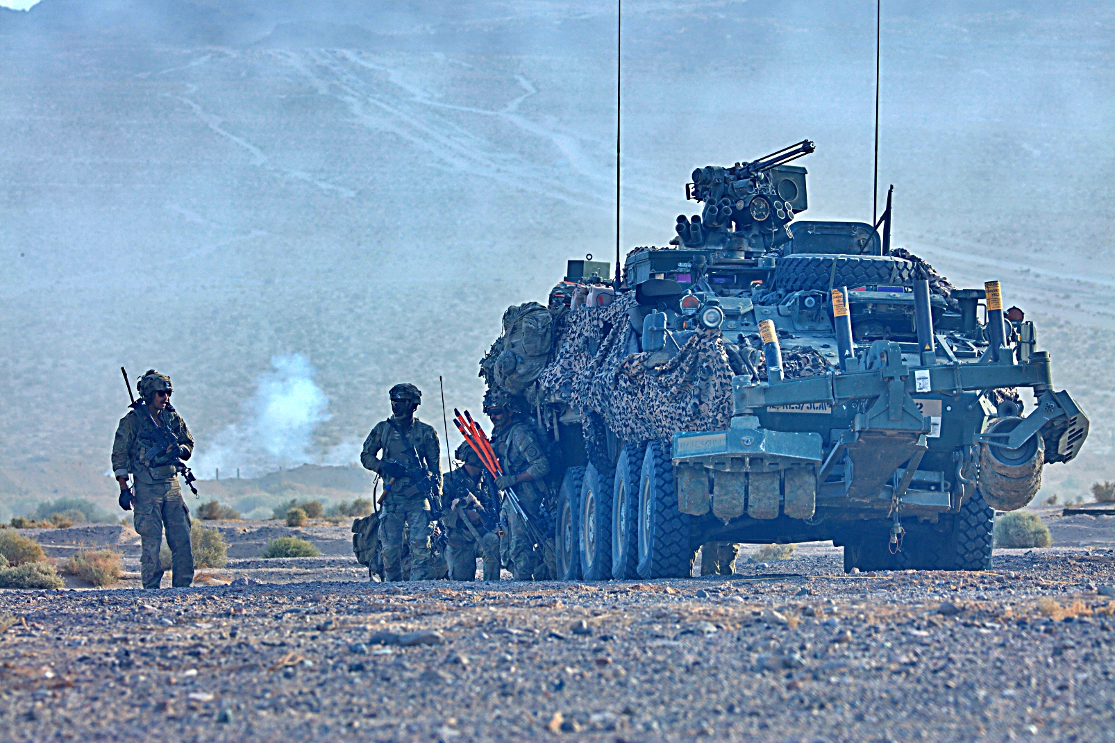 2023년 8월 11일부터 24일사이, 캘리포니아주 Fort Irwin 국립훈련센터에서 열린 Rotation 23-09 훈련 중, 제3기병연대 3대대 소속 미군 병사들이 Stryker 장갑차를 이용하여 훈련하고 있다.