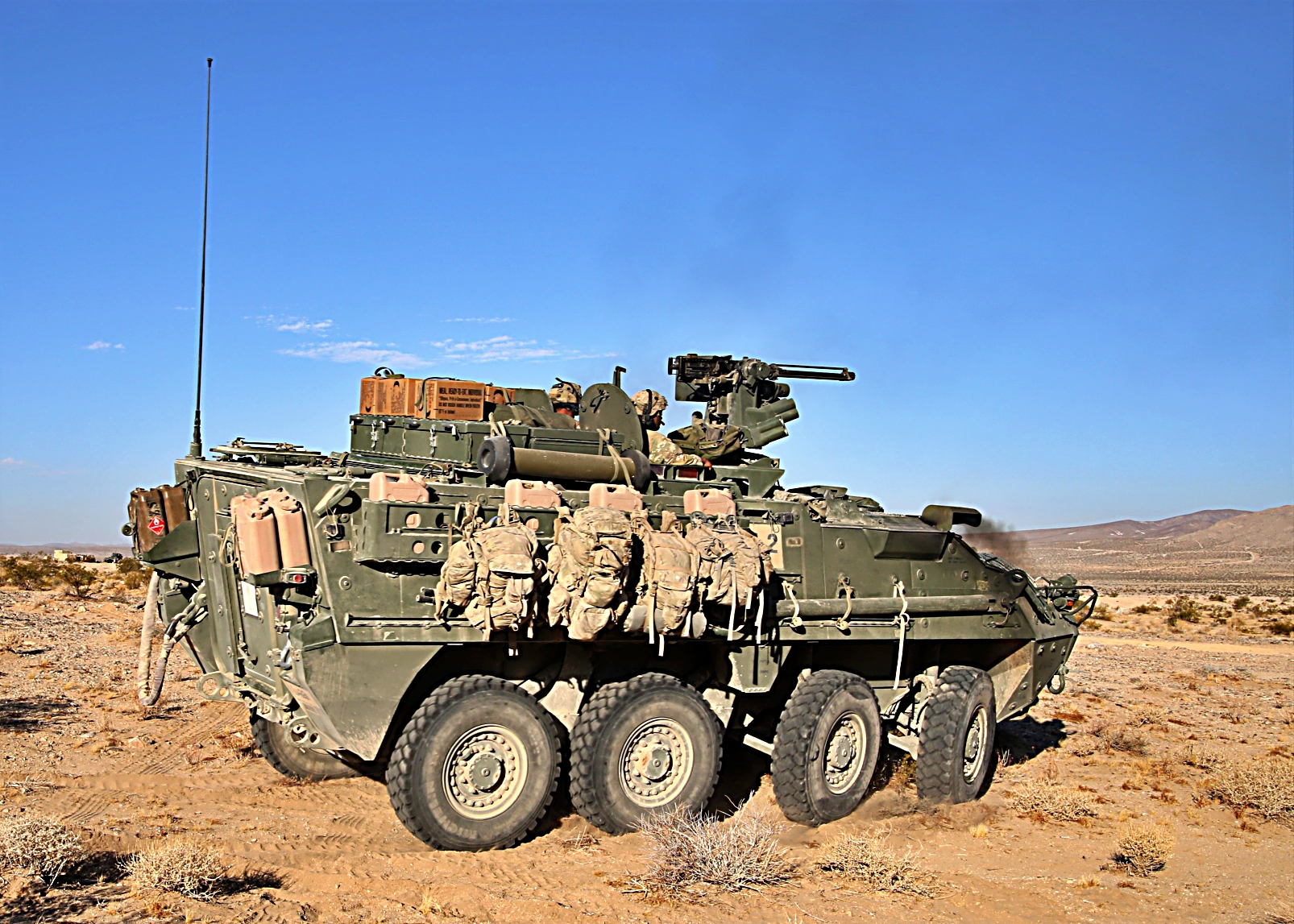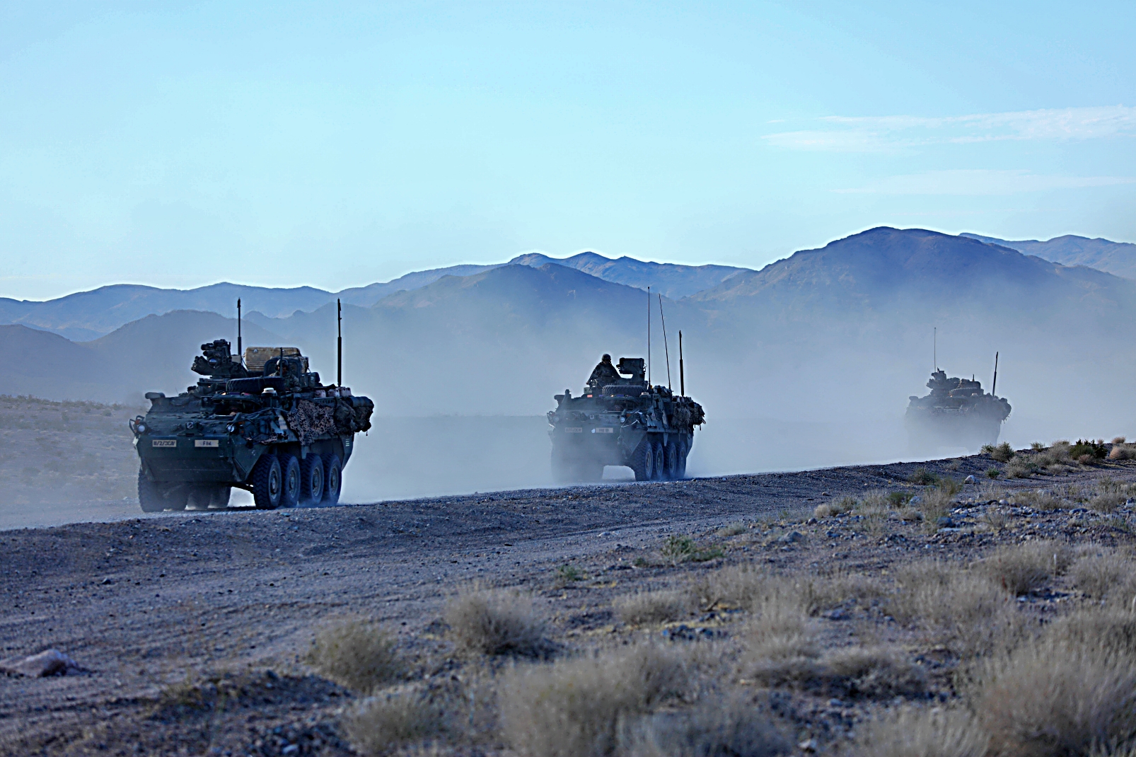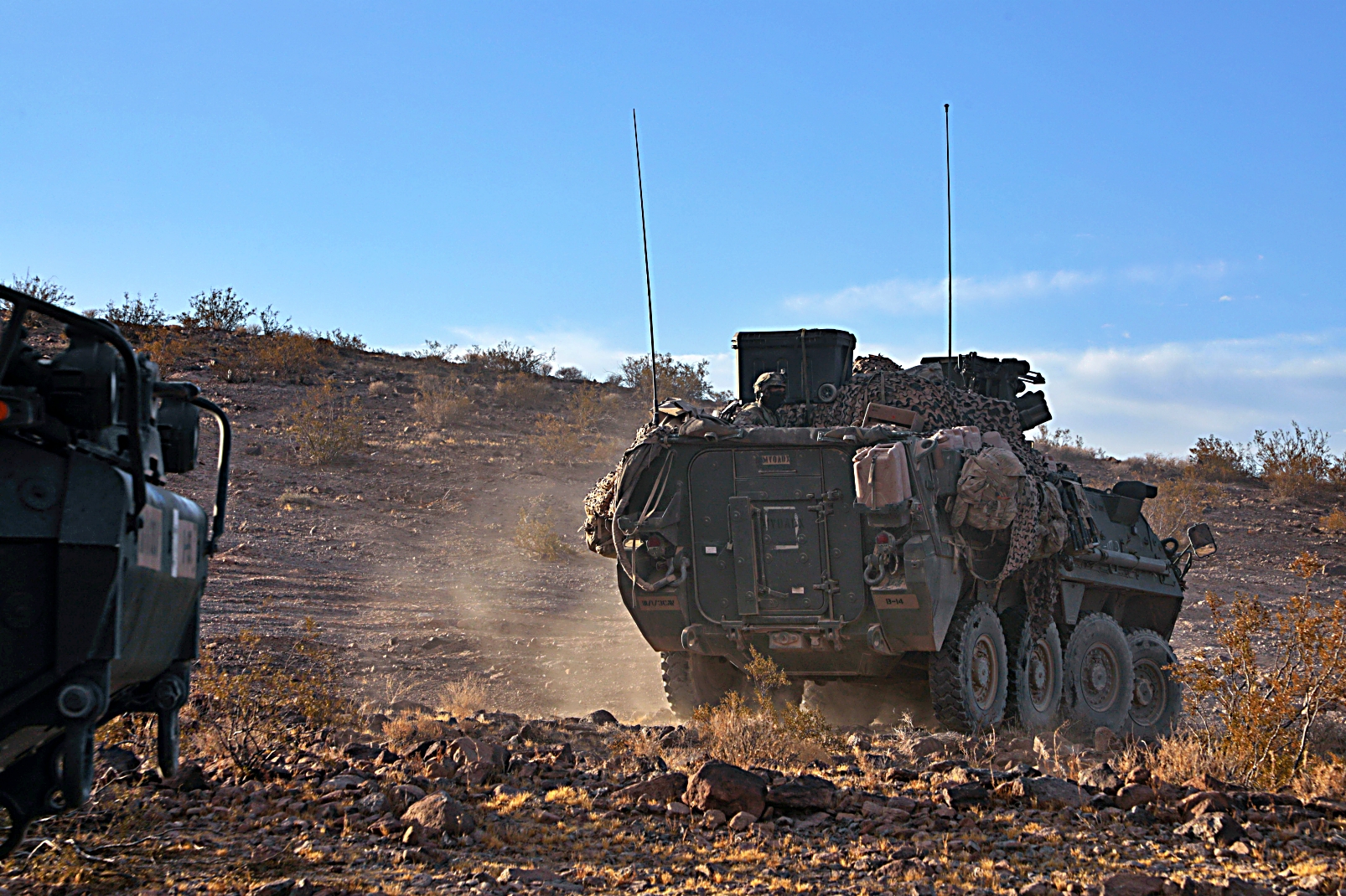 2023년 8월 11일부터 24일사이, 캘리포니아주 Fort Irwin 국립훈련센터에서 열린 Rotation 23-09 훈련 중, 제3기병연대 3대대 소속 미군 병사들이 Stryker 장갑차를 이용하여 훈련하고 있다.