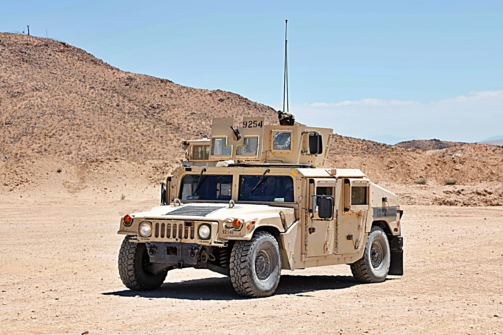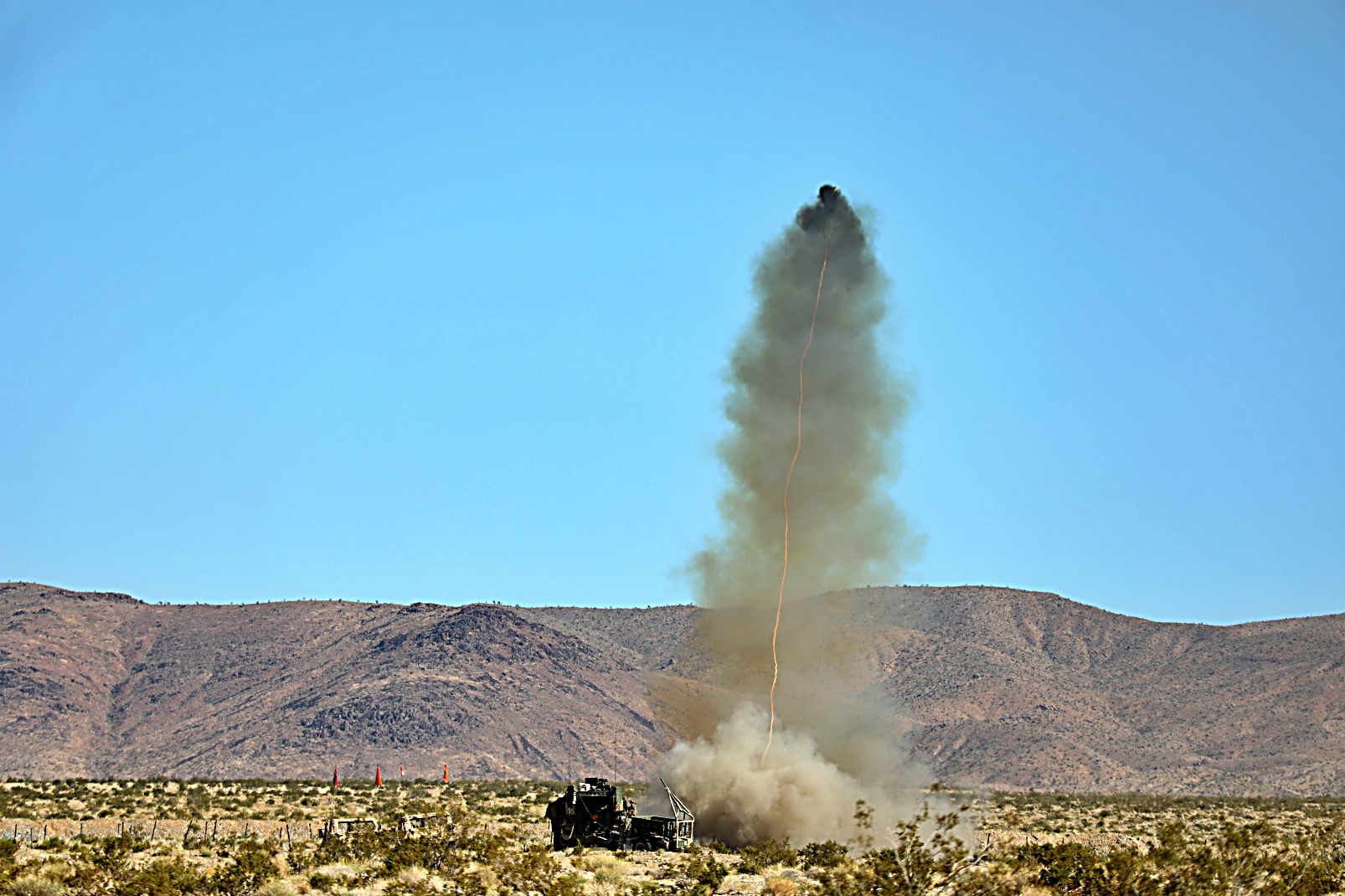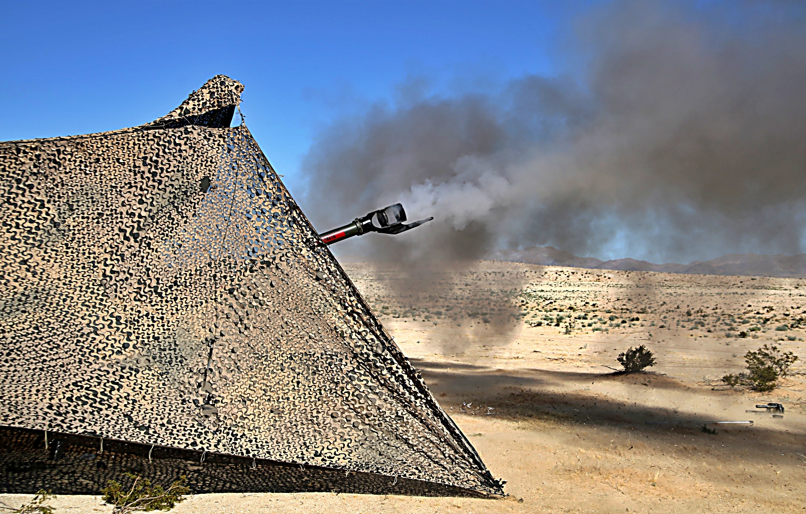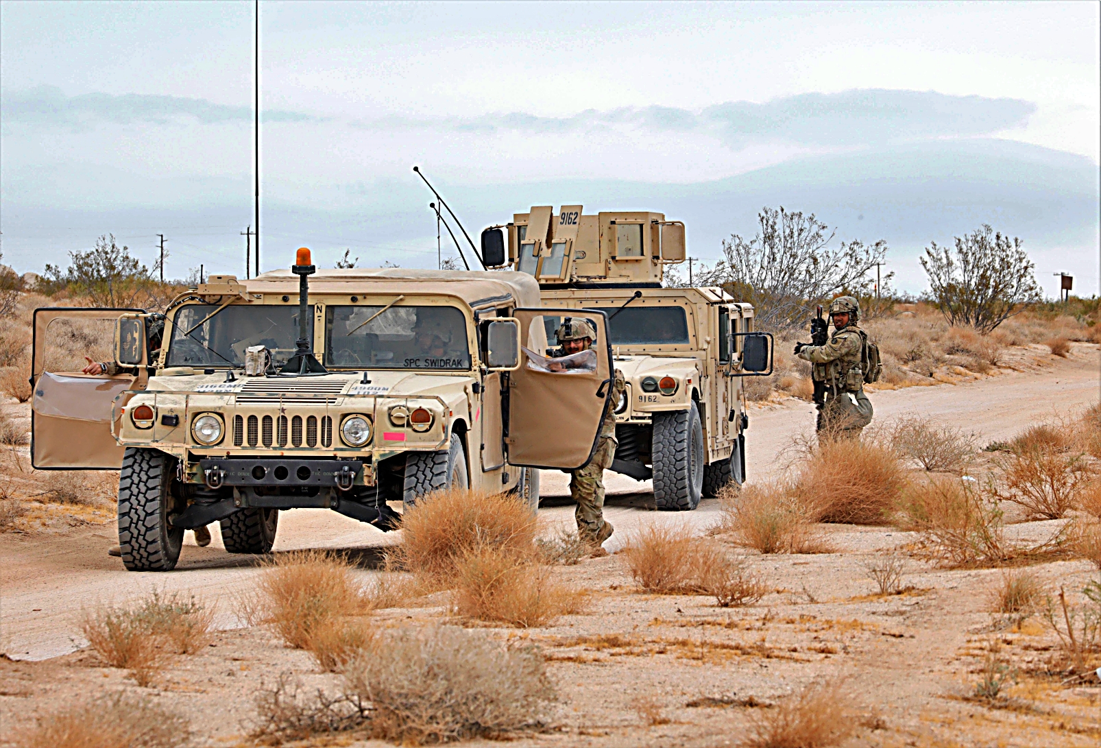 2023년 8월 11일부터 24일사이, 캘리포니아주 Fort Irwin 국립훈련센터에서 열린 Rotation 23-09 훈련 중, 제3기병연대 3대대 소속 미군 병사들이 Stryker 장갑차를 이용하여 훈련하고 있다.