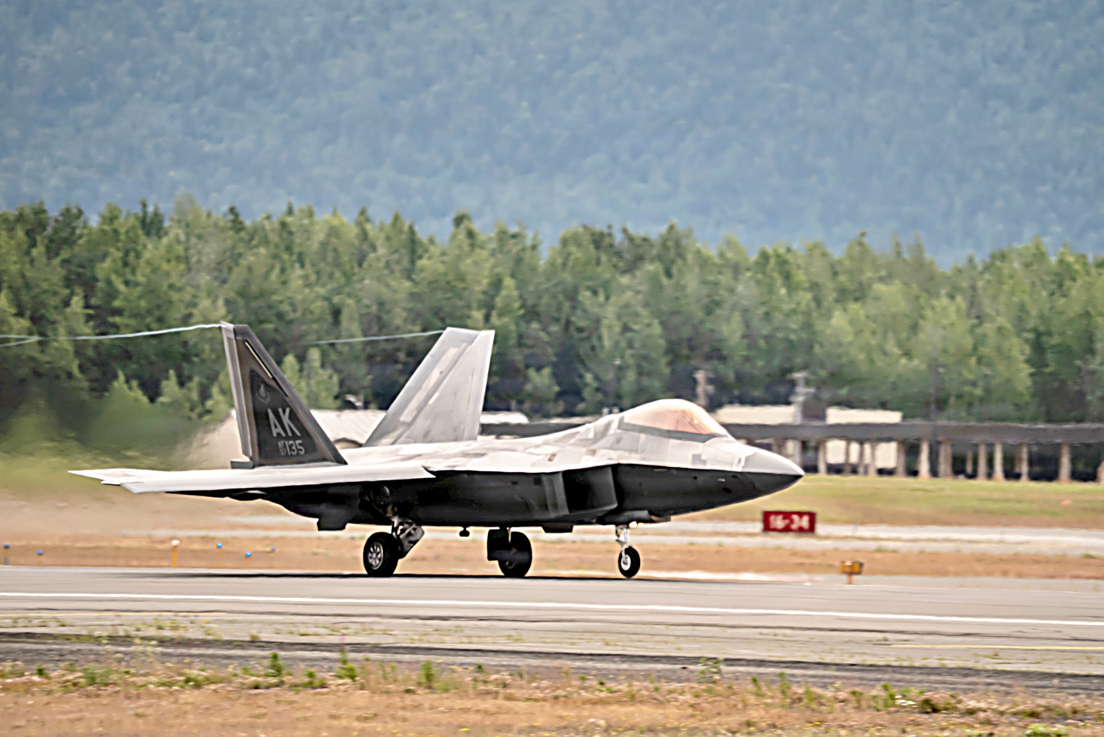 2025년 7월 13일, 알래스카주 Elmendorf-Richardson 합동기지에서 실시된 ' Resolute Force Pacific' 훈련 중, 제90전투비행대대 소속 F-22 Raptor 전투기가 출격하고 있다.이 훈련은 인도-태평양 지역 전반에 걸쳐 공군역량을 신속하고 대규모로 전개하고 6개 이상의 시간대에 걸쳐 신속한 전투 배치 및 지휘통제 작전 능력을 시연하기 위해 고안됐다.