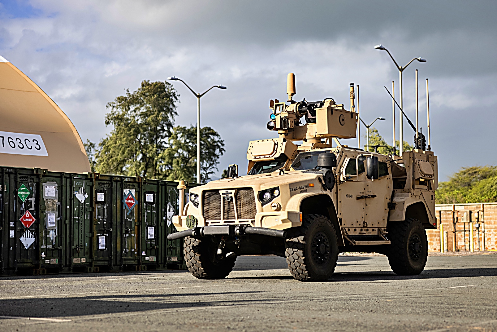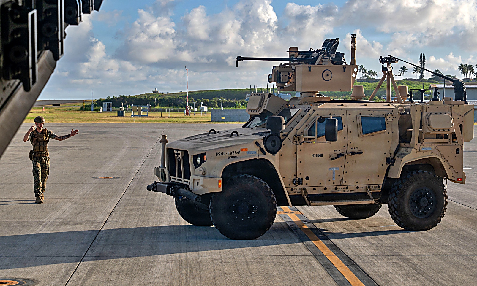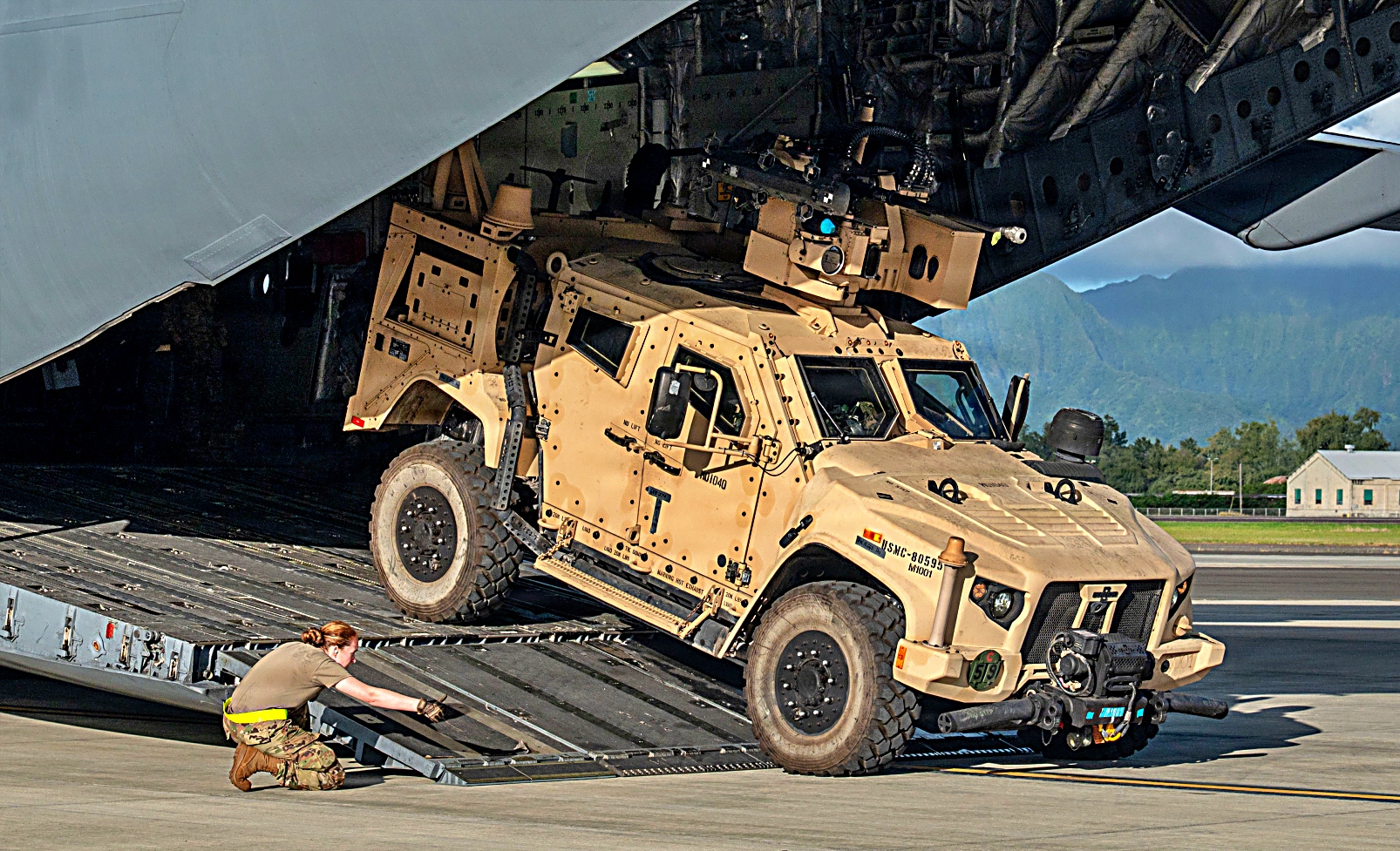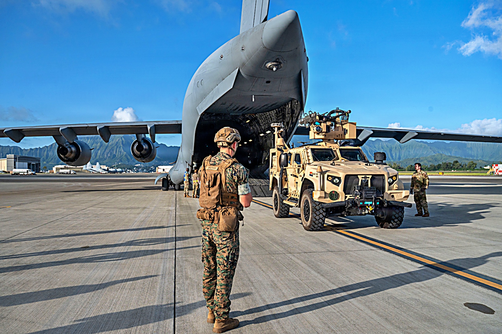 미 해병대 제3해병사단 제3해안연대 제3연안전투팀 중거리 미사일 포대원들이 2025년 2월 10일, 하와이 해병대 기지 Kaneohe Bay 해병대 항공 기지에서 진행된 ‘ NEXUS FORGE’ 훈련 중, 제445항공비행단 소속 미 예비공군 C-17 Globemaster III 수송기에서 제3해안방공포대에 배속된 합동 경전술차량 JLTV 탑재형 해병대 통합대공방어체계(MADIS Marine Air Defense Integrated Systems)를 하역하고 있다. 공중 수송 작전과 합동 전문성을 결합함으로써 공군과 해병대는 신속 배치 능력을 강화할 수 있으며, 이를 통해 NMESIS 및 MADIS와 같은 무기 체계를 원격 지역에 배치하여 역동적인 환경에서 유연성과 대응력을 높일 수 있다.