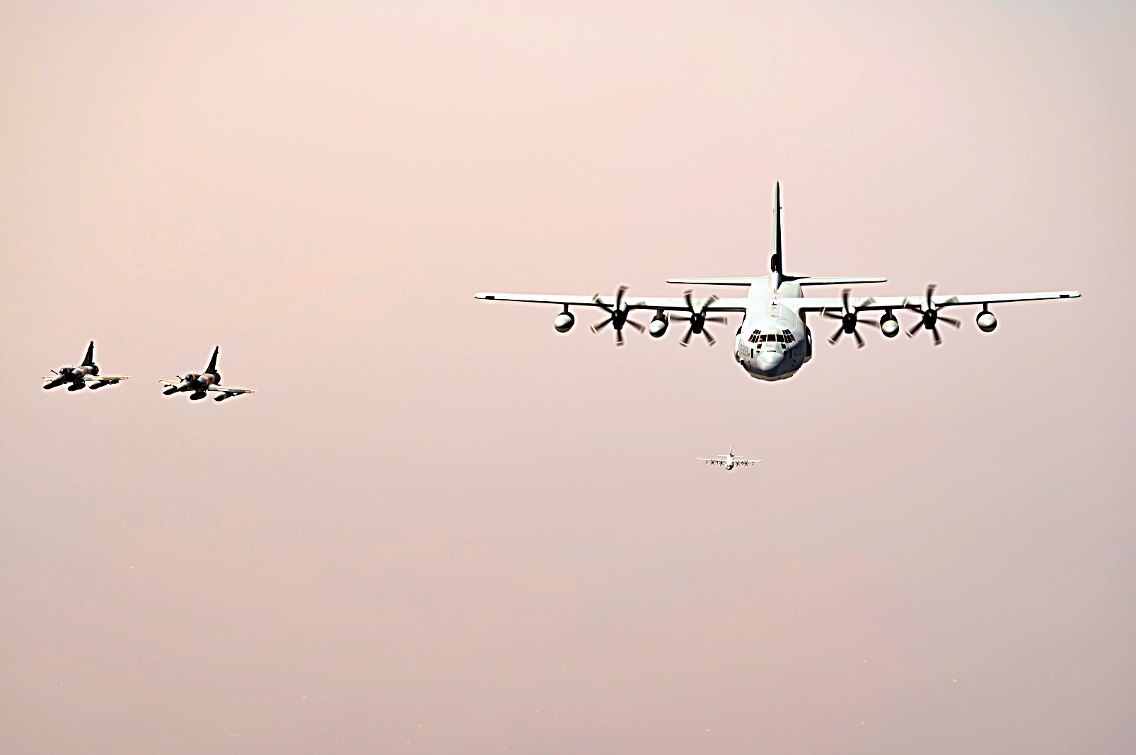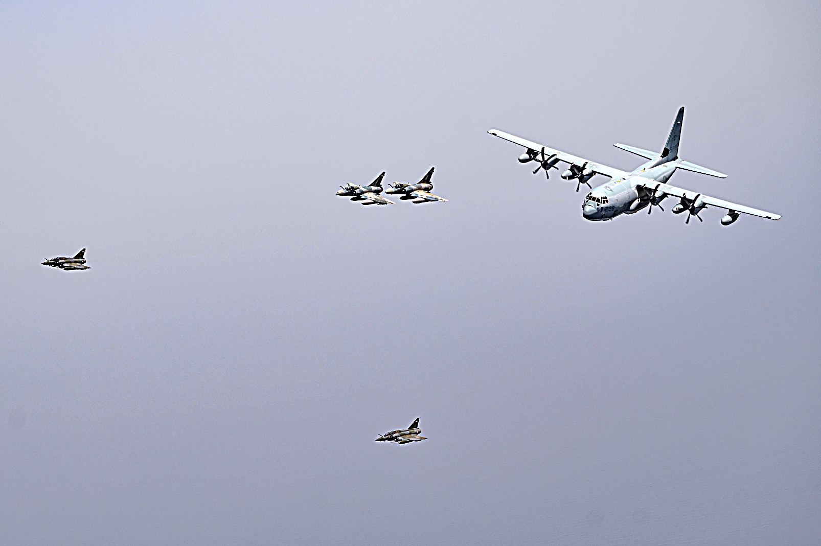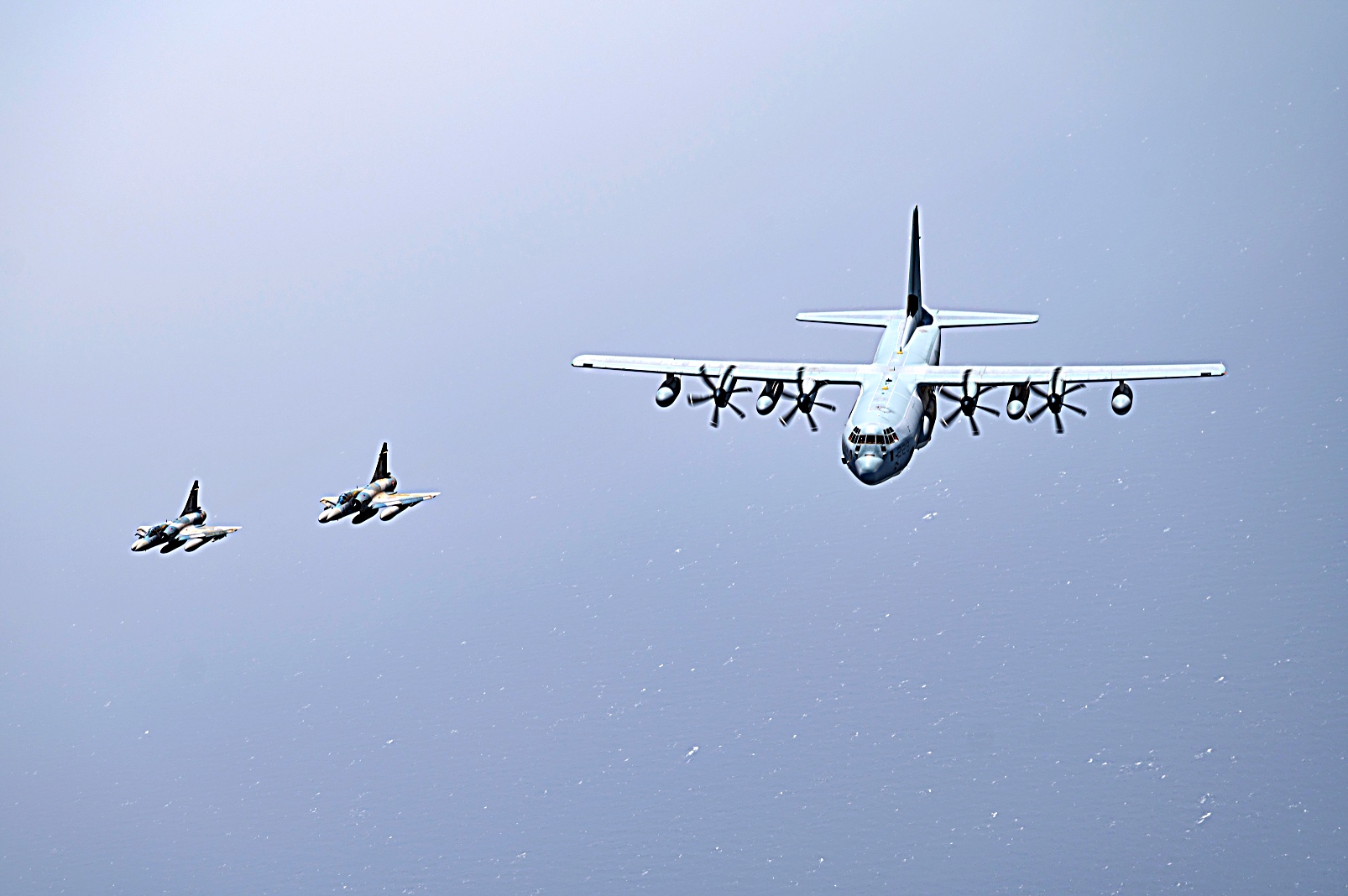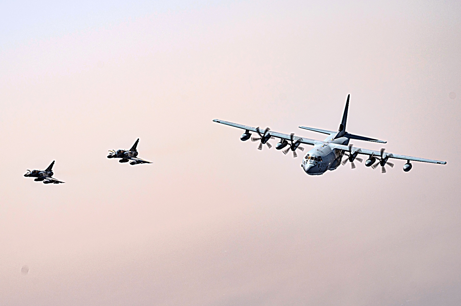 2021년 7월 11일 지부티 상공에서 미 해병대 VMGR-234 공중급유수송비행대대 234 소속 KC-130J 급유수송기가 프랑스 Mirage 2000 전투기와 편대 비행하고 있다. VMGR-234는 Combined Joint Task Force-Horn of Africa 작전지역에 공중급유, 구조 및 수송 능력을 제공한다.
