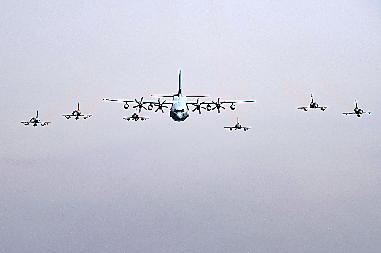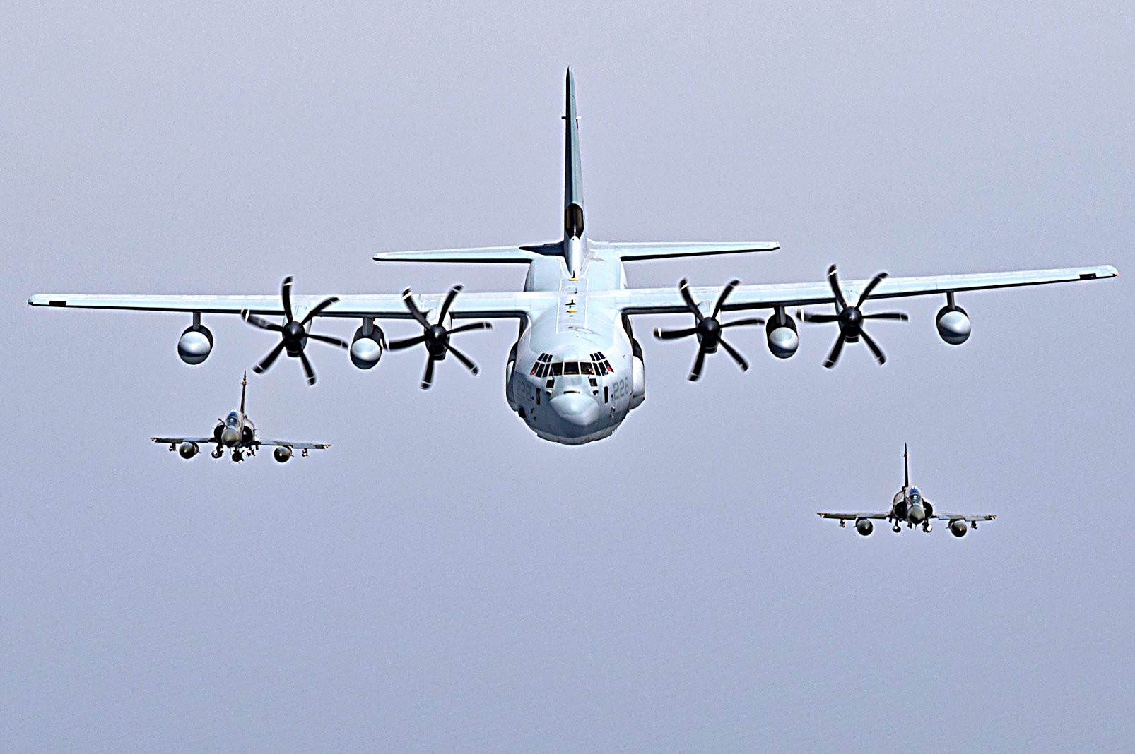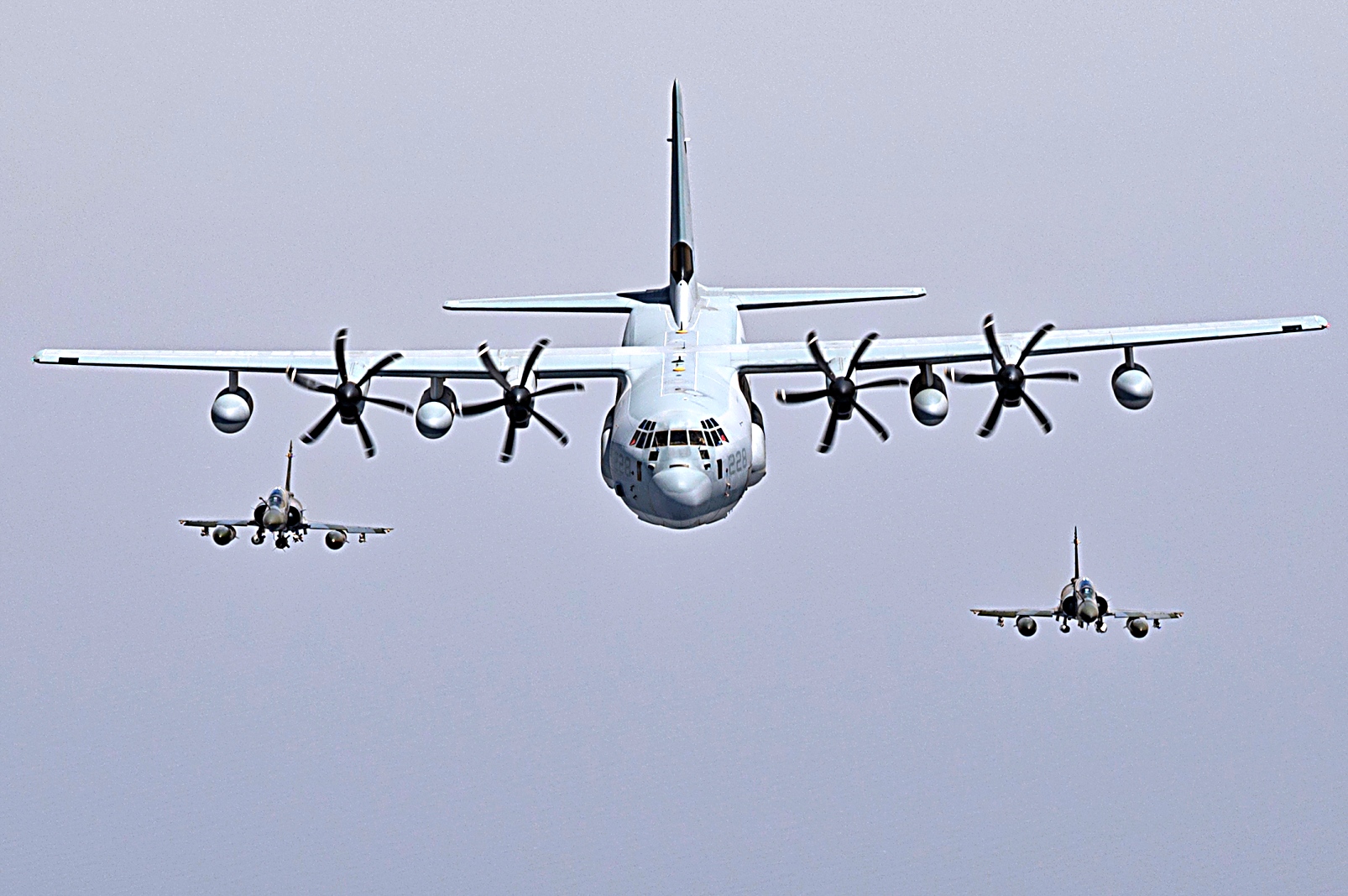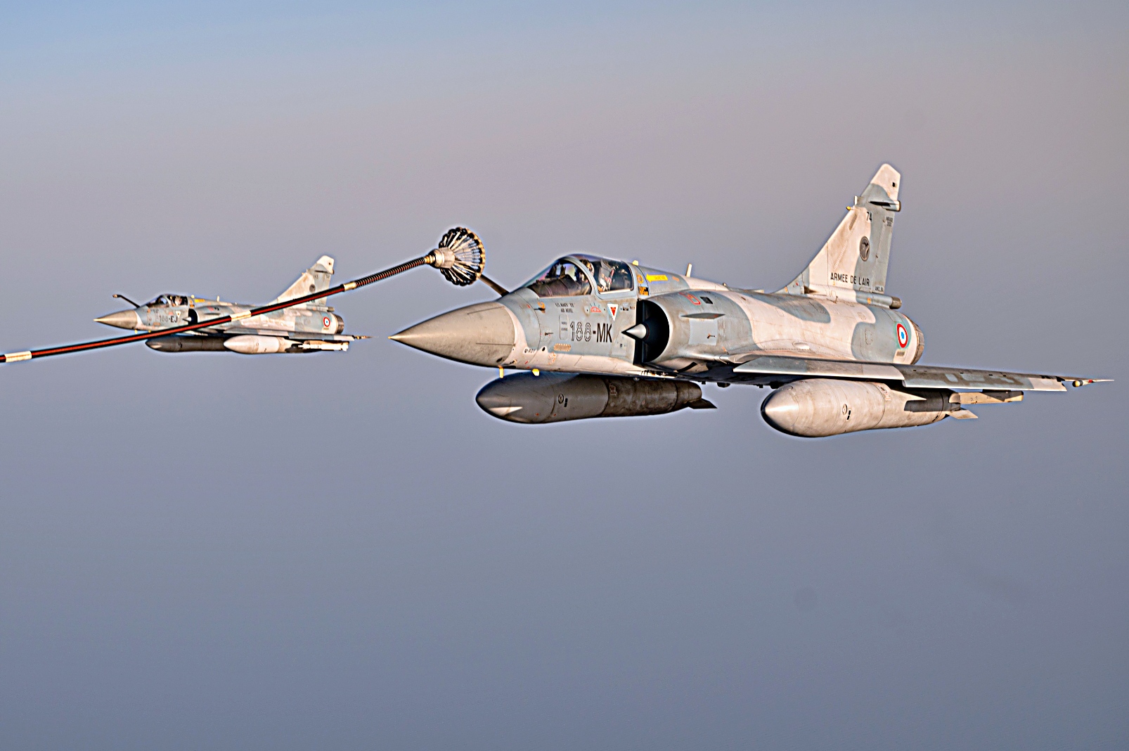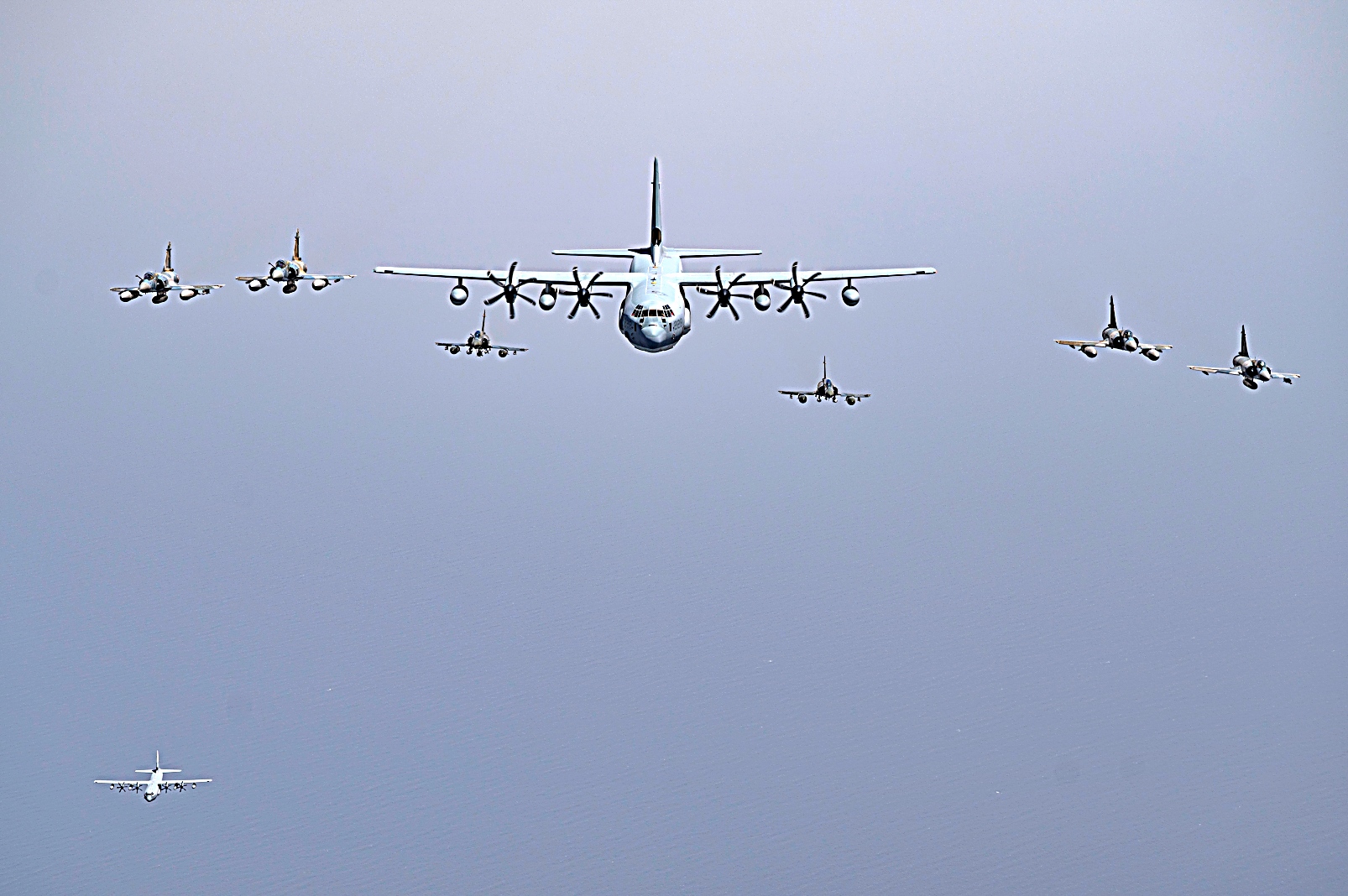 2021년 7월 11일 지부티 상공에서 미 해병대 VMGR-234 공중급유수송비행대대 234 소속 KC-130J 급유수송기가 프랑스 Mirage 2000 전투기와 편대 비행하고 있다. VMGR-234는 Combined Joint Task Force-Horn of Africa 작전지역에 공중급유, 구조 및 수송 능력을 제공한다.