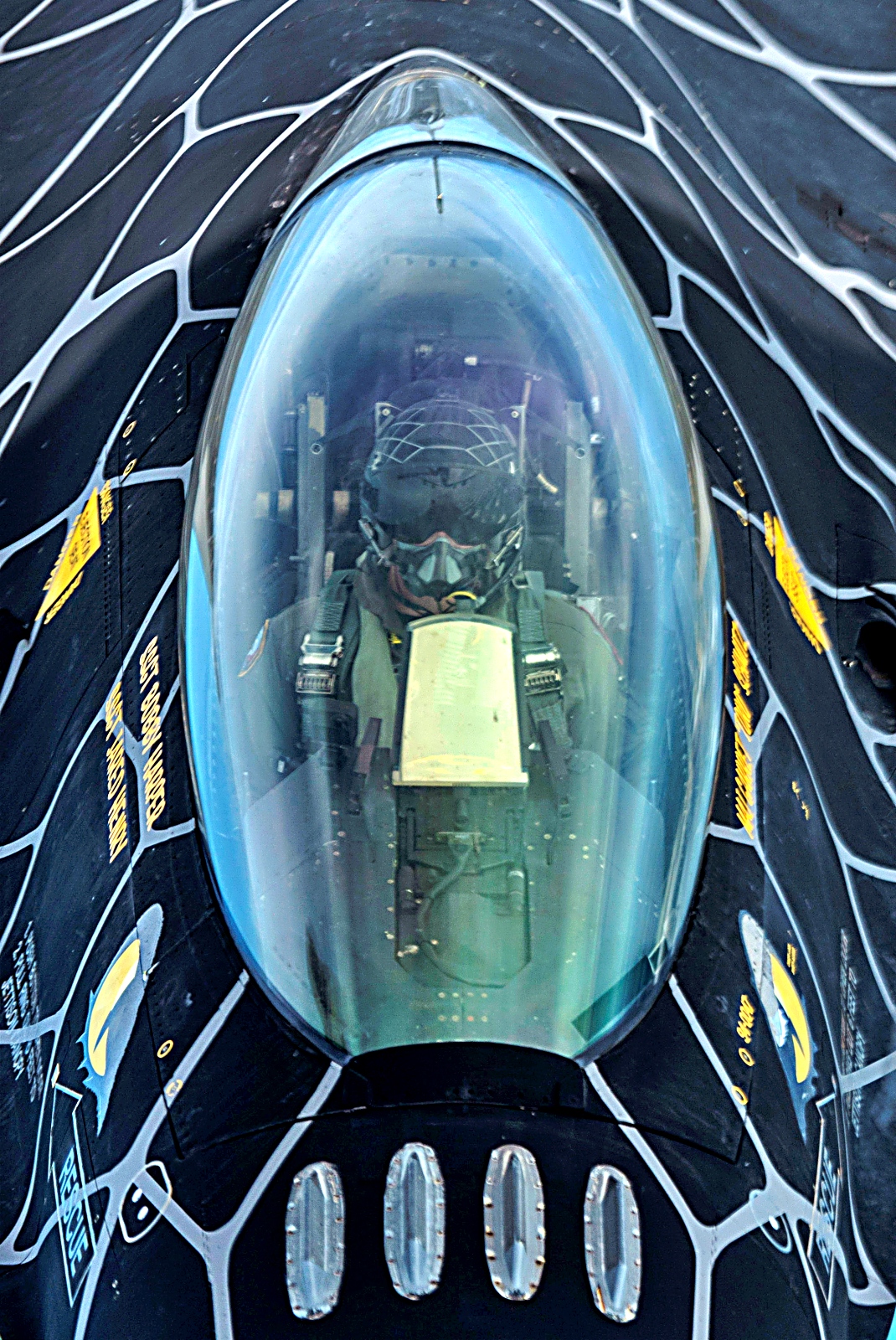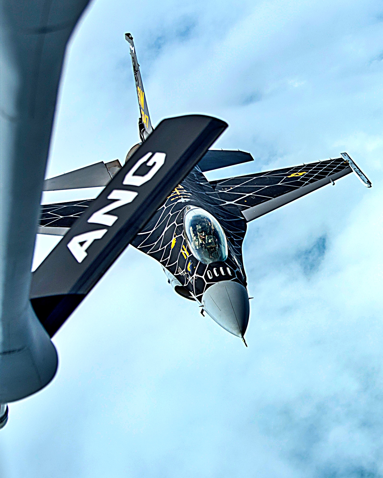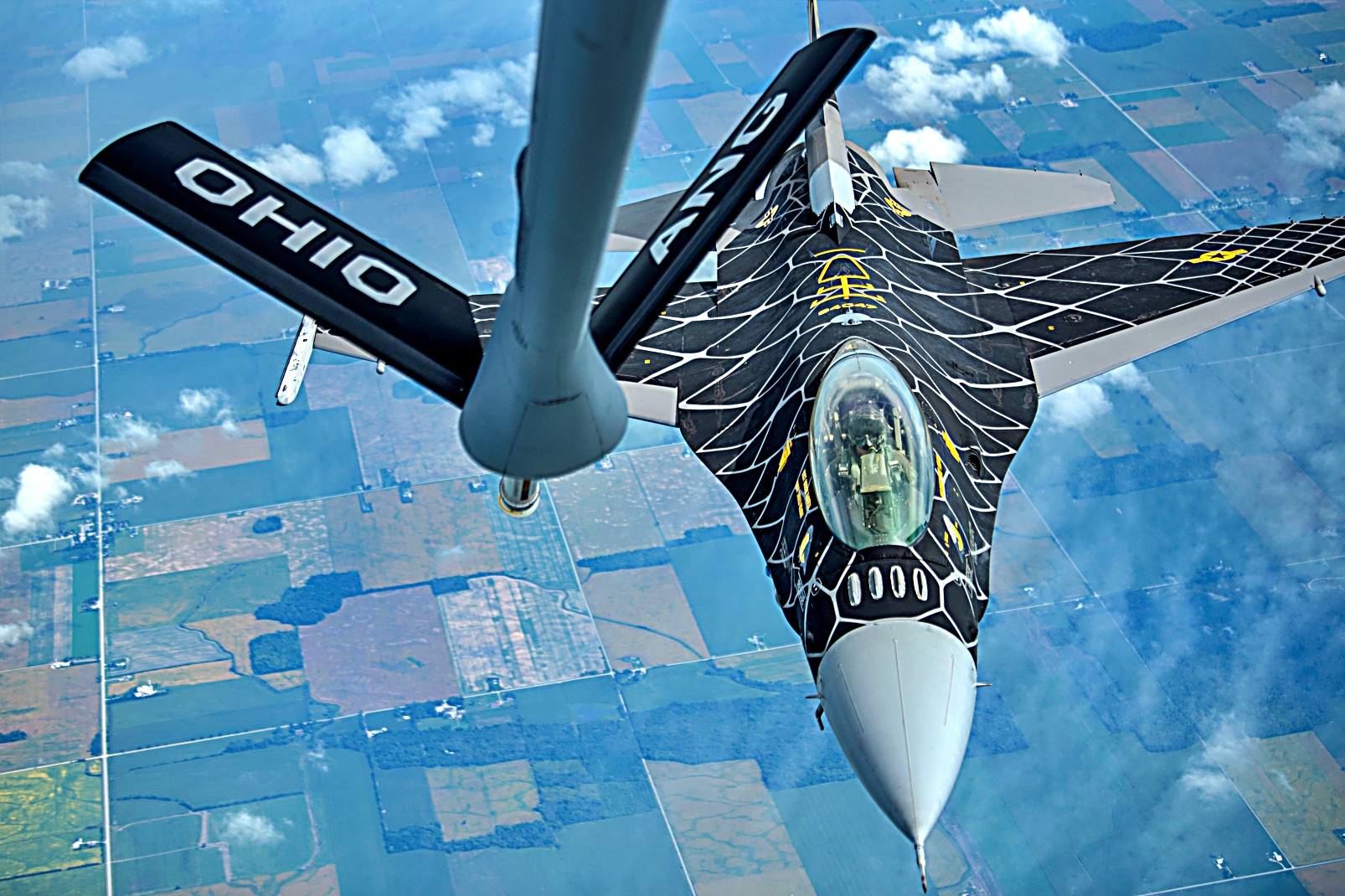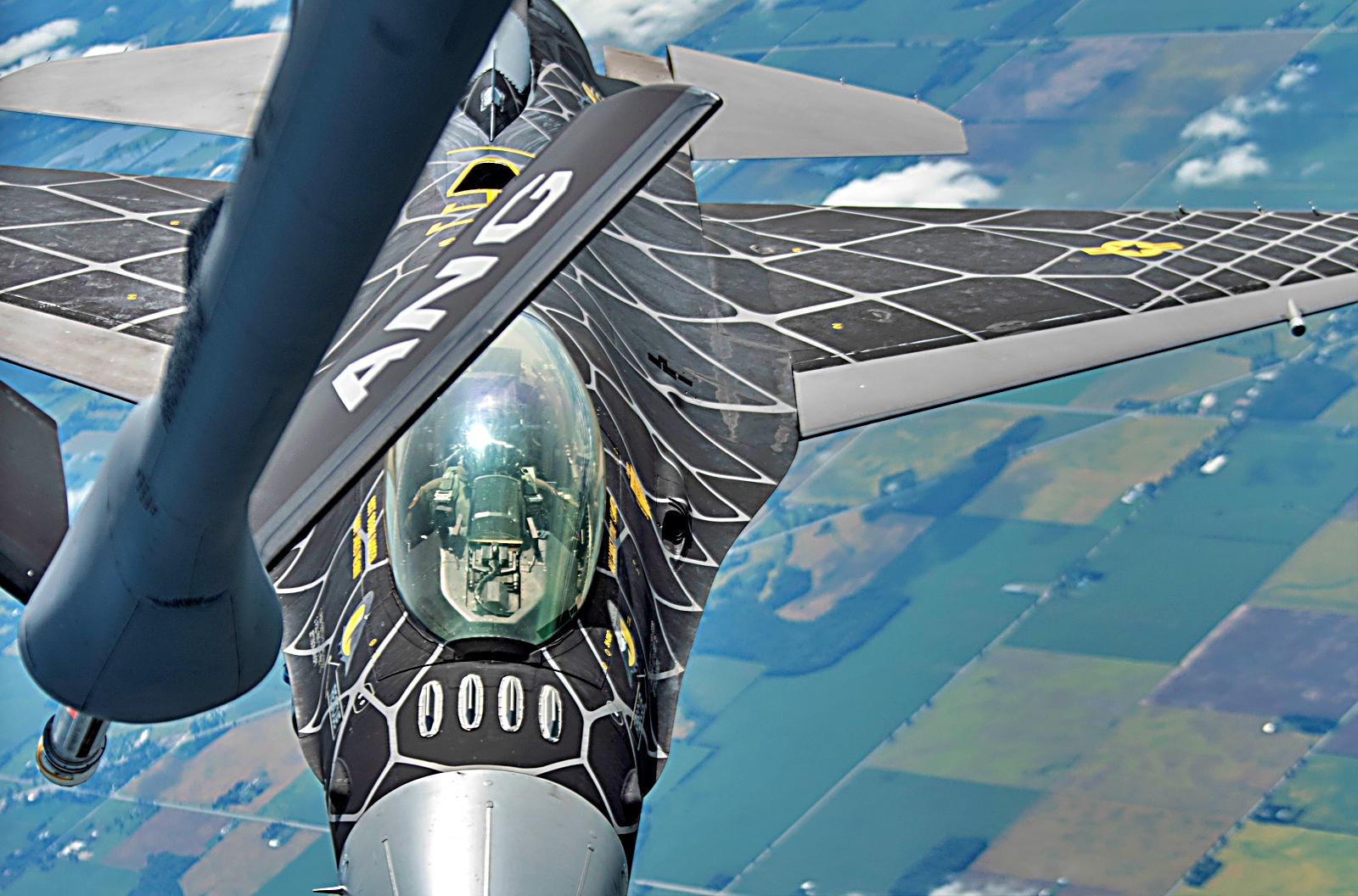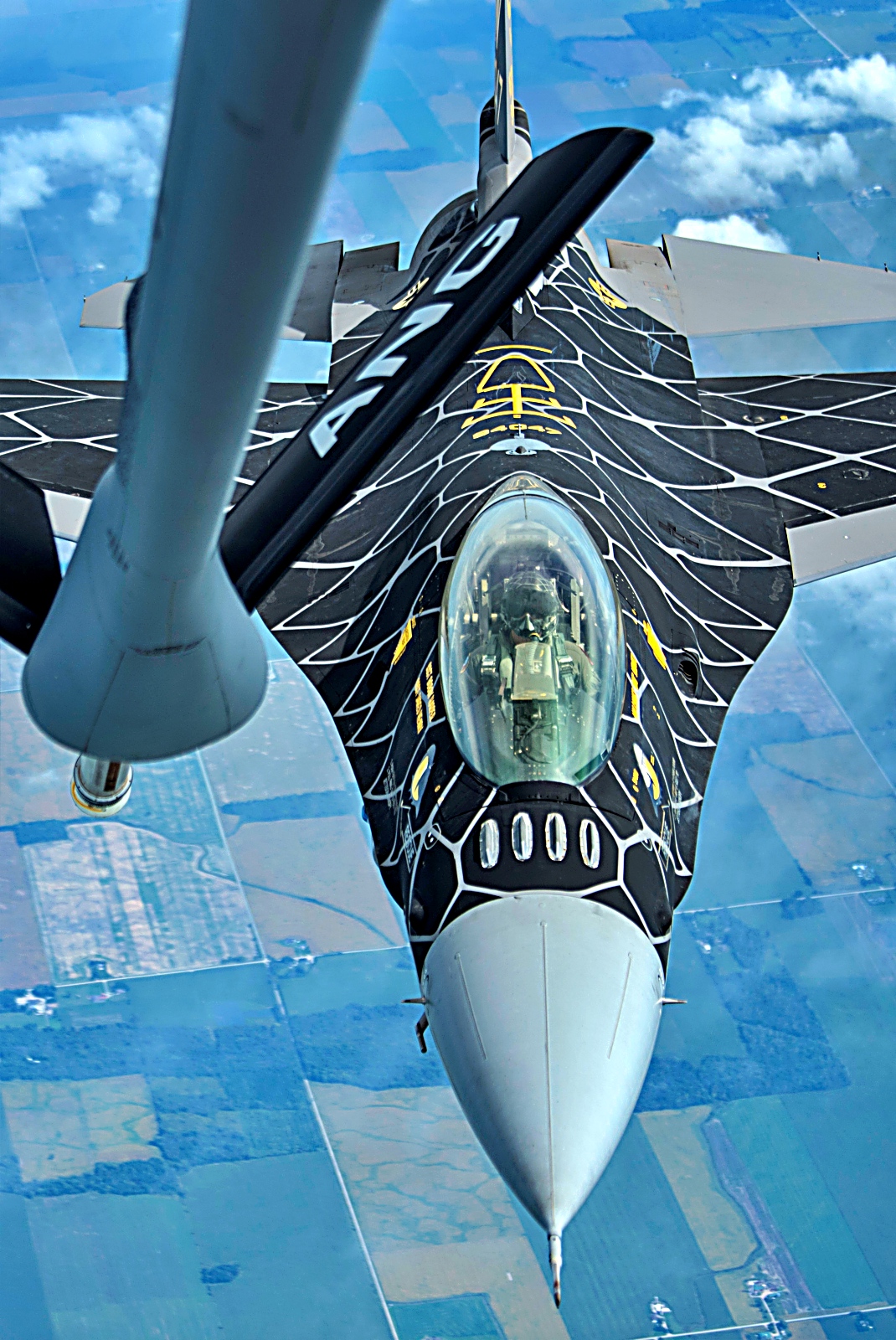 2020년 9월 12일, 사우스캐롤라이나주 Shaw 공군기지의 공군 전투사령부 F-16 Viper Demonstration Team 소속 F-16 Fighting Falcon 전투기와 애리조나 주 Davis-Monthan 공군기지의 Thunderbolt II Demonstration Team 소속 A-10C Thunderbolt II 이 온타리오주 런던 인근에서 공중 급유를 마친 후 오하이오주 콜럼버스에 있는 제121공중급유비행단 소속 KC-135 Stratotanker와 나란히 비행하고 있다. 이 F-16은 Airshow London 시범 비행팀의 일원이었다.