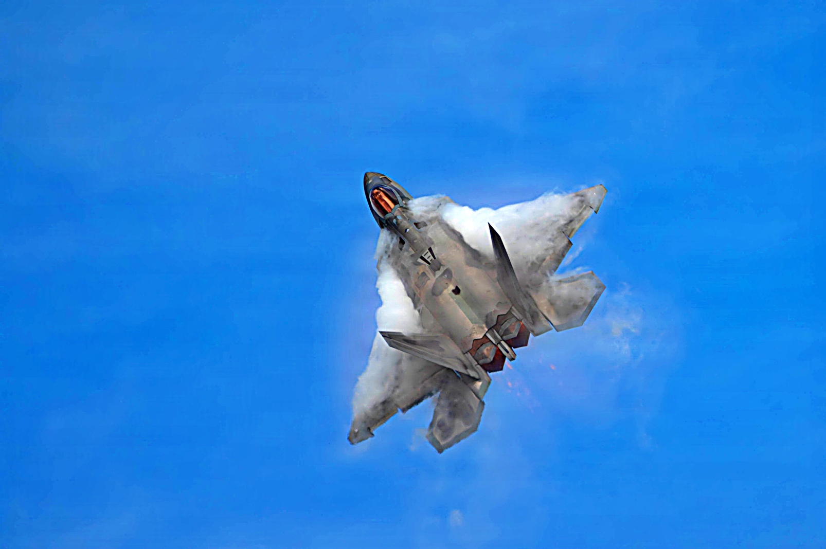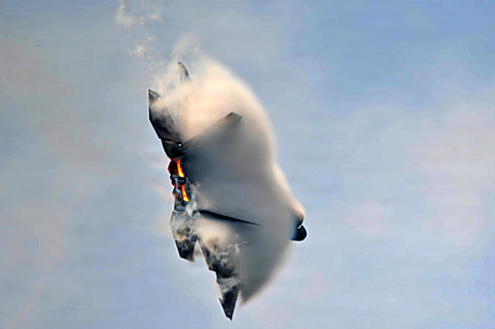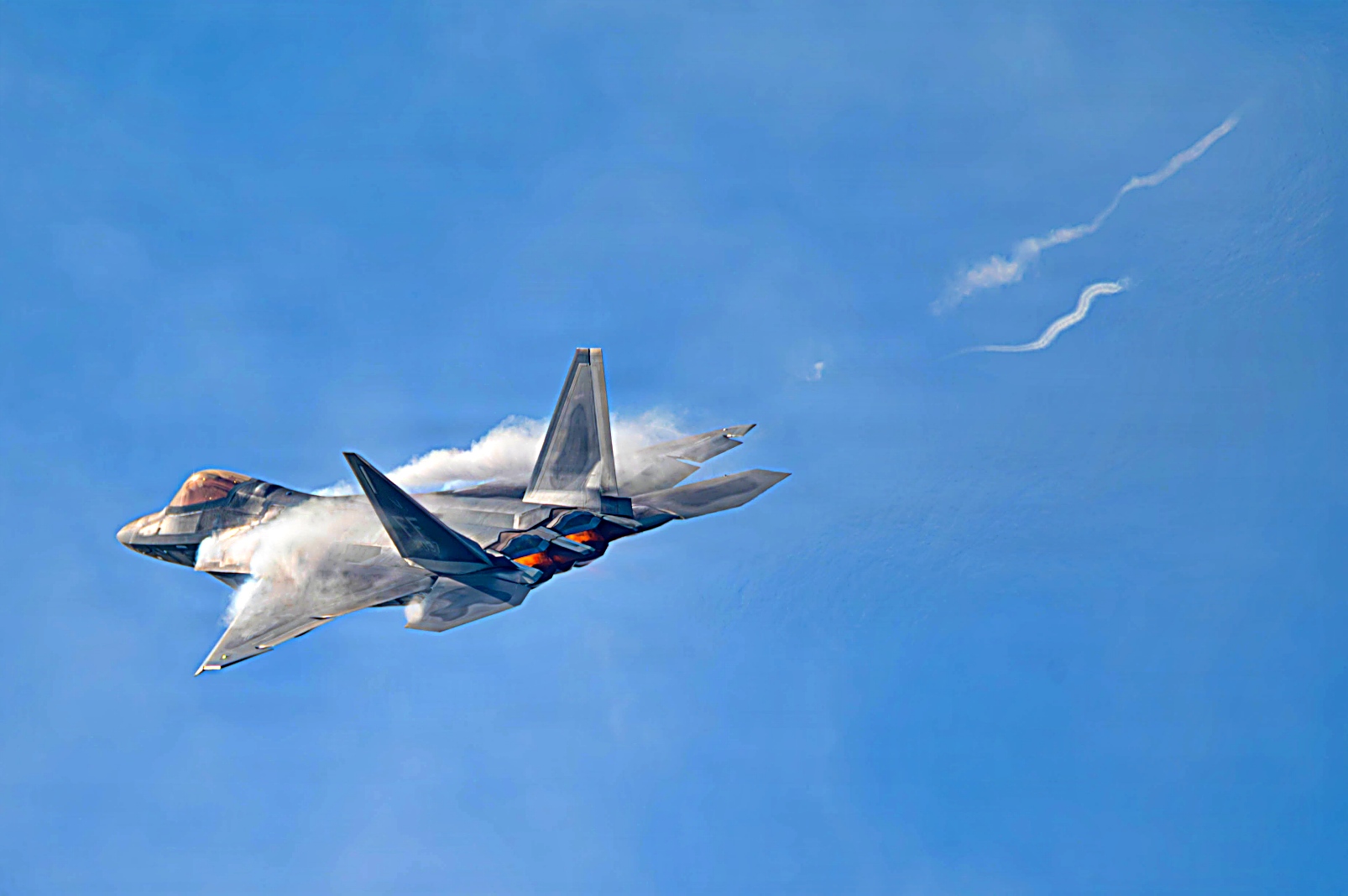 하늘을 가르는 F-22의 날개 위의 수증기는 항공기가 상승할 때 발생하는 급격한 기압 변화로 인한 응결 현상이다.
