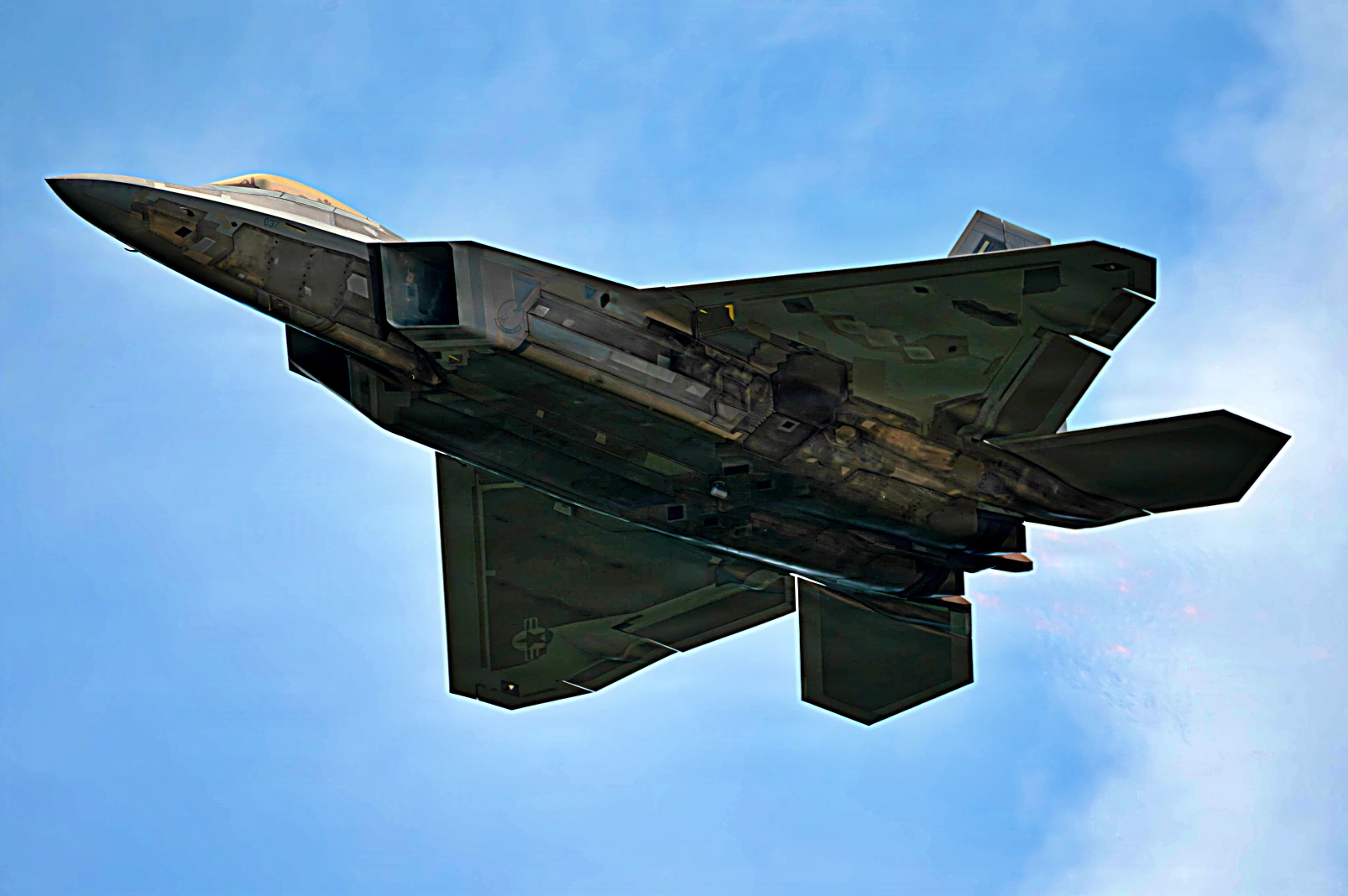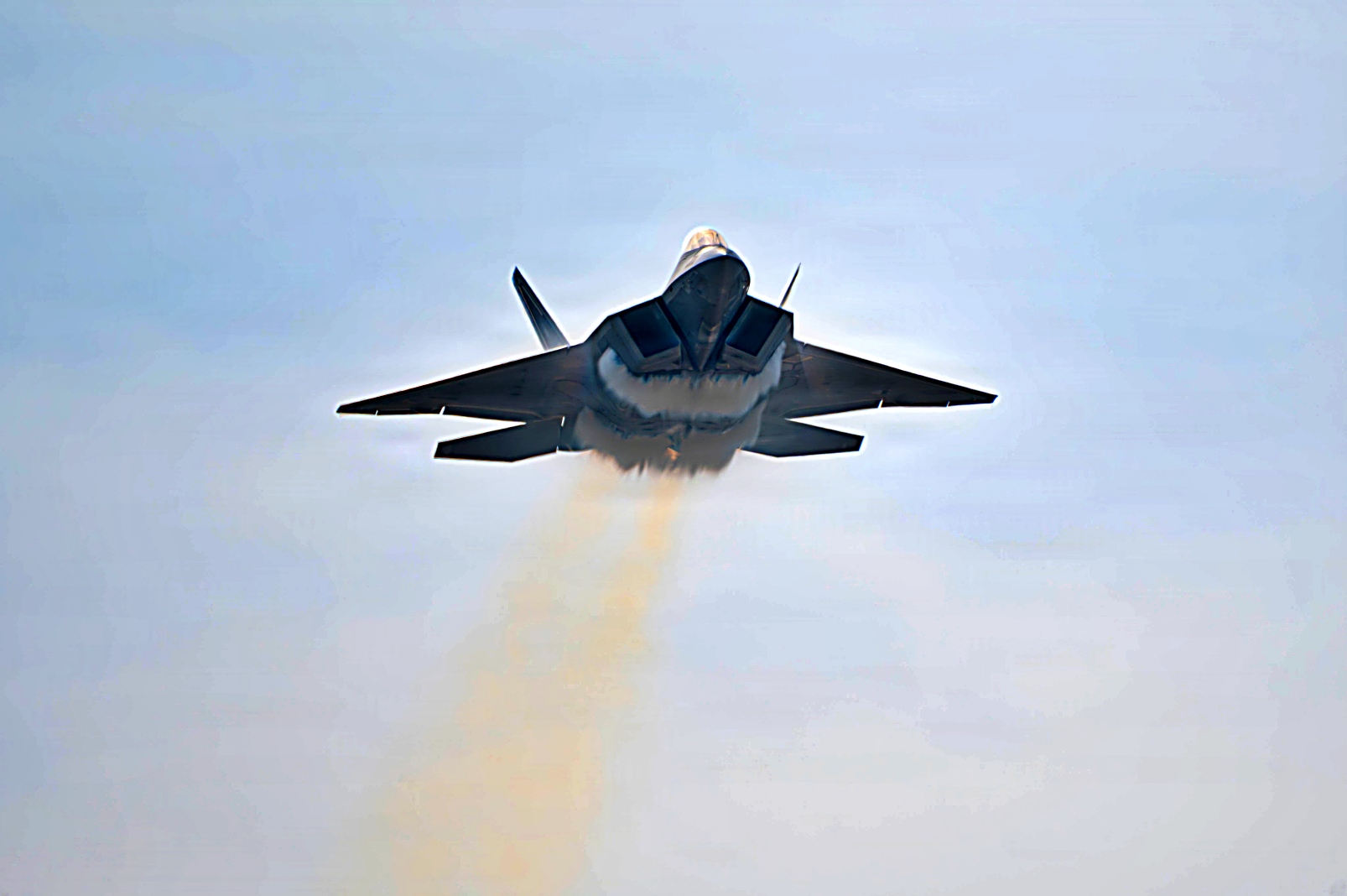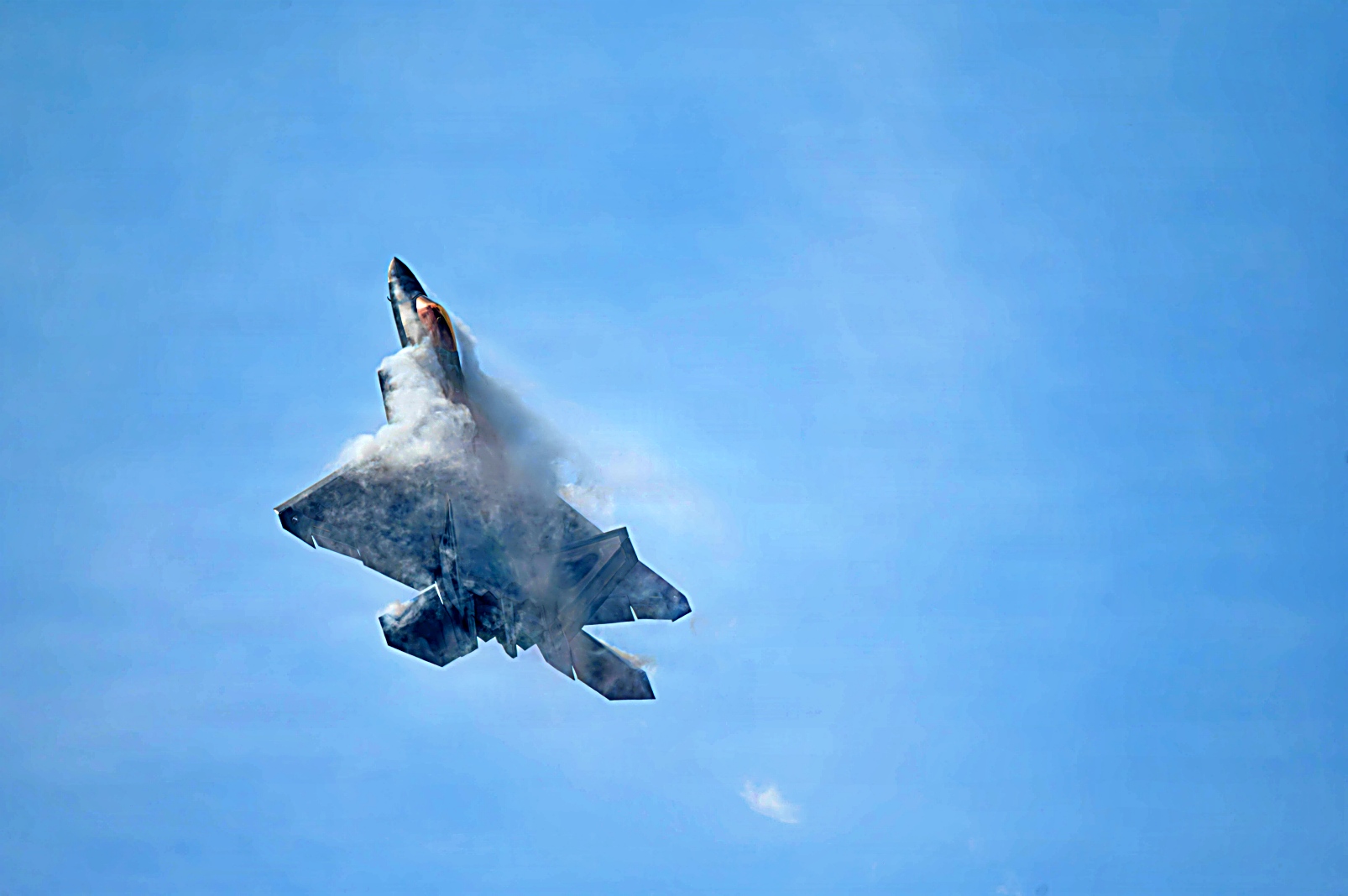 하늘을 가르는 F-22의 날개 위의 수증기는 항공기가 상승할 때 발생하는 급격한 기압 변화로 인한 응결 현상이다.