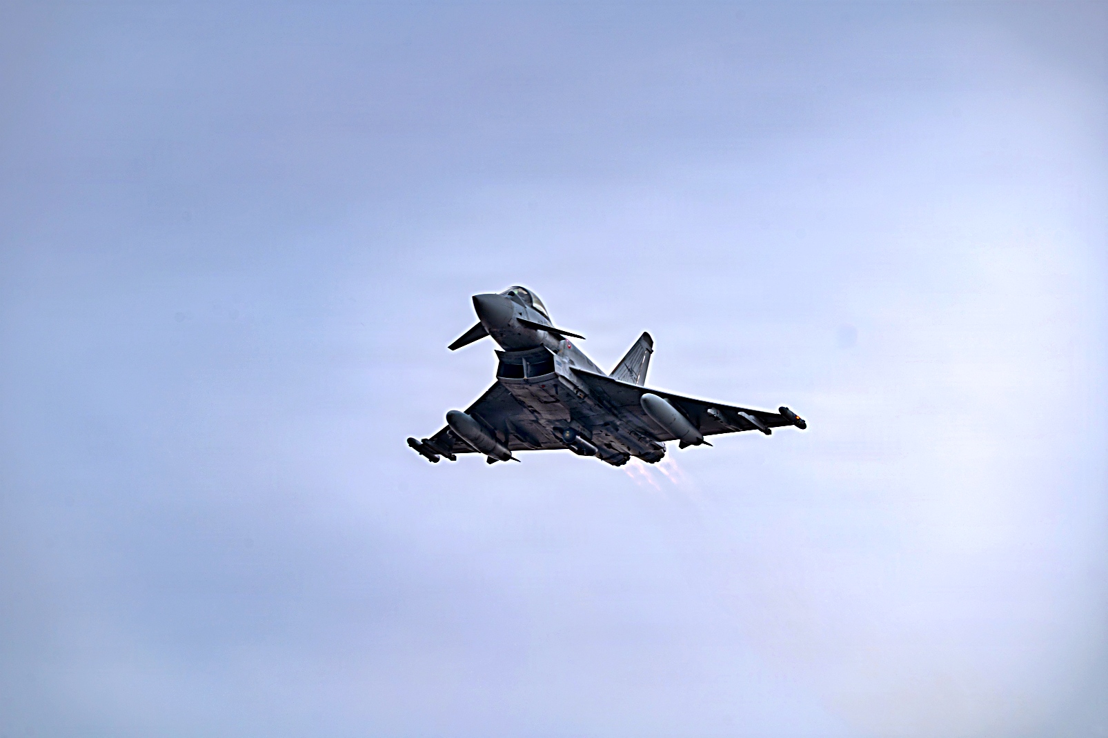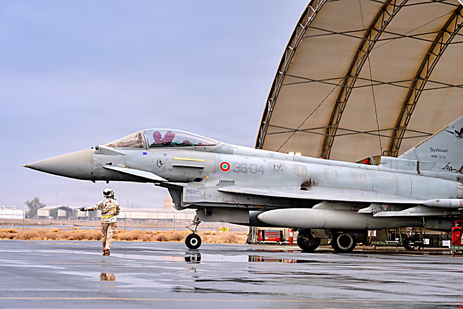 2025년 12월 11일, 미 중부사령부 작전책임지역 내에서 실시된 Exercise Blue Sands 26.1 중 이탈리아 공군 Eurofighter Typhoo 전투기가 상공을 비행하고 있다. Blue Sands 26.1 훈련은 지역 안정을 강화하기 위해 파트너 및 연합군과 함께 전술, 기술, 절차를 강화하여 통합성, 상호 운용성 및 전투력을 증대시키기 위해 설계된 통합 공중 및 미사일 방어, 드론 대응 능력을 향상시키는 다국적 훈련이다.