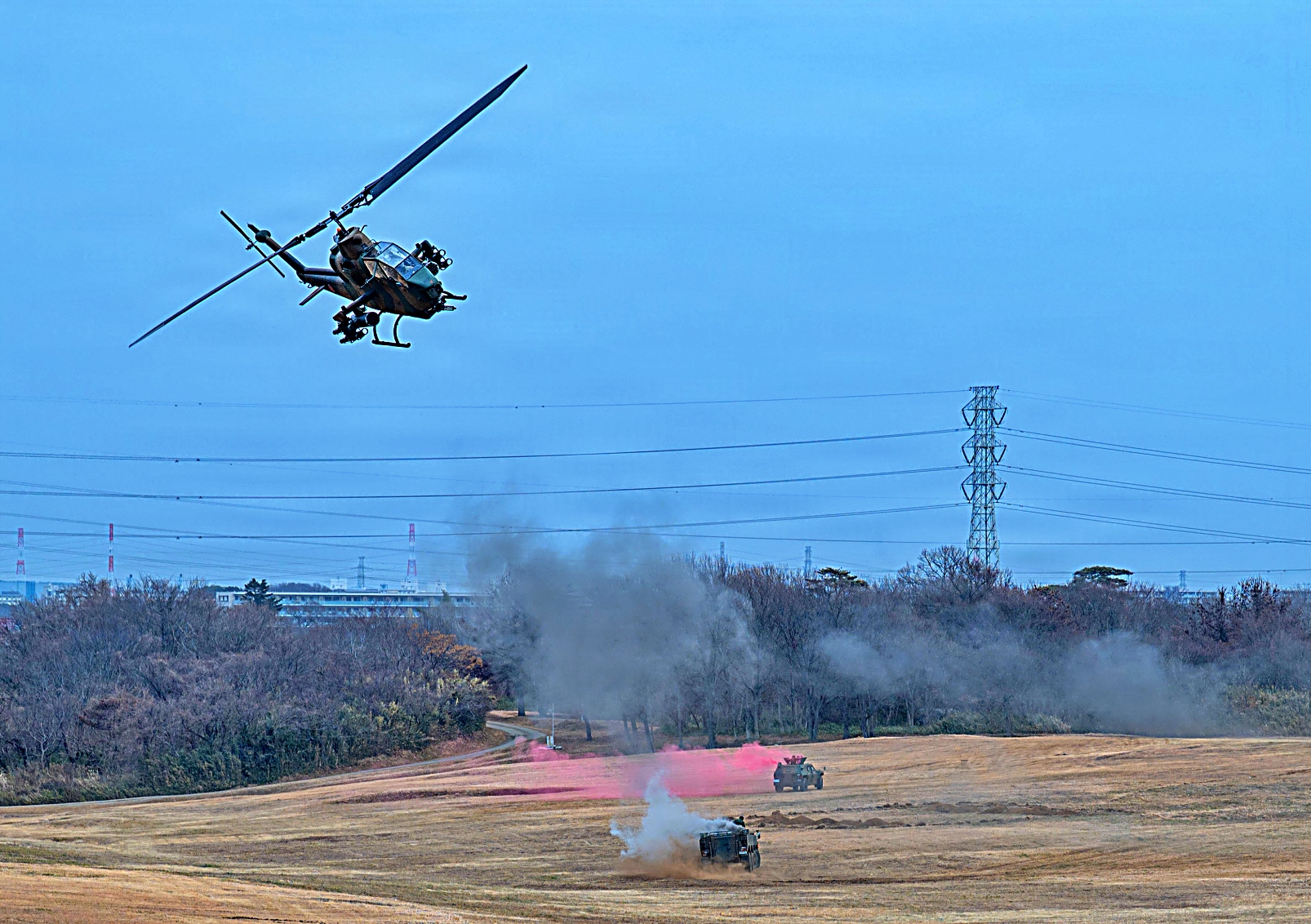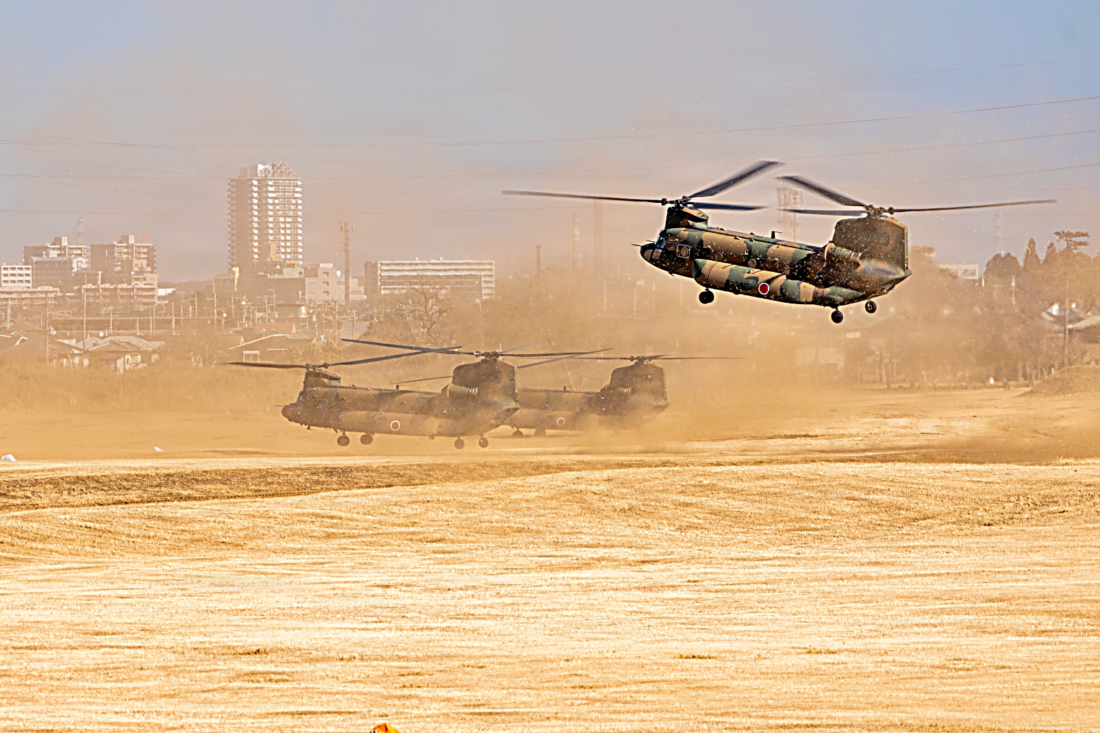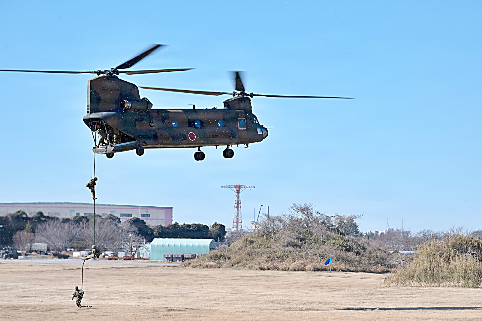 2026년 1월 9일, 일본 Camp Narashino 에서 열린 신년 낙하산 훈련의 일환으로 일본 육상자위대 대원들이 UH-1J 헬리콥터와 CH-47D 헬리콥터를 이용하여 전투 기동 훈련을 실시하며 제1공수여단의 역량을 시연하고 있다.