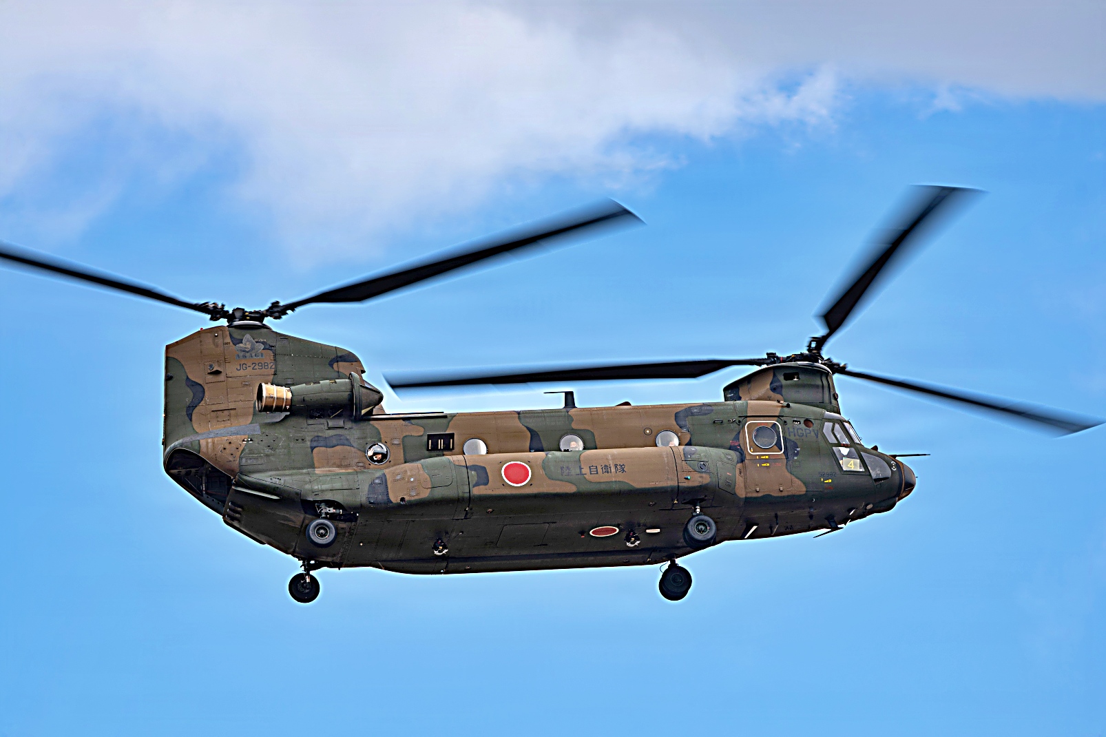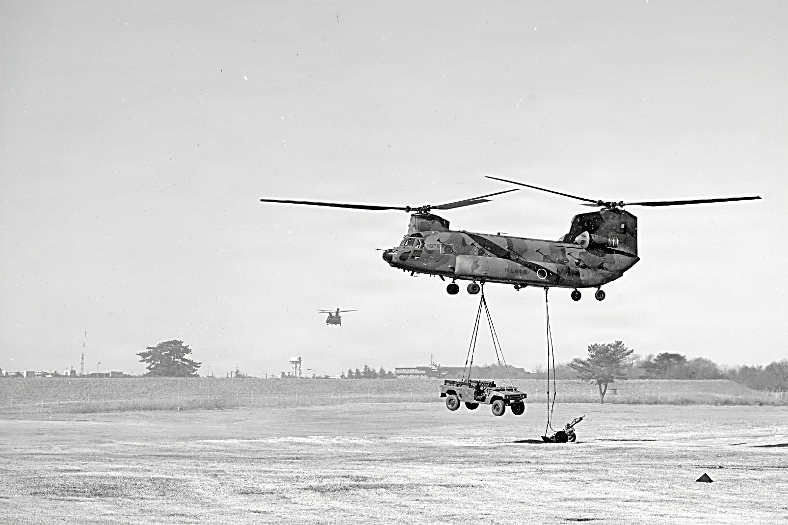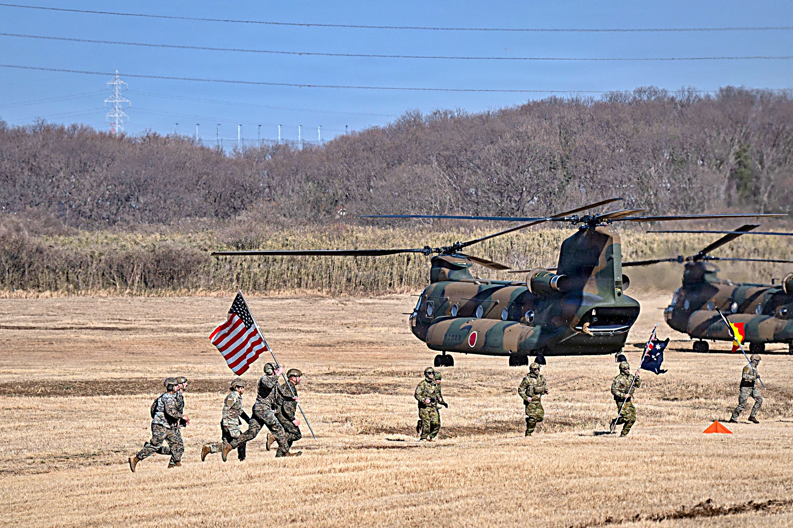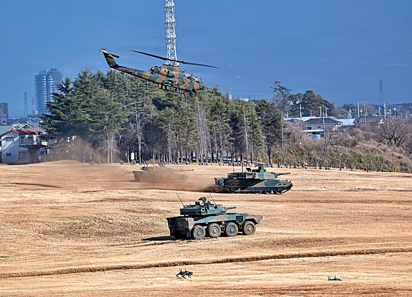 2026년 1월 9일, 일본 Camp Narashino 에서 열린 신년 낙하산 훈련의 일환으로 일본 육상자위대 대원들이 UH-1J 헬리콥터와 CH-47D 헬리콥터를 이용하여 전투 기동 훈련을 실시하며 제1공수여단의 역량을 시연하고 있다.