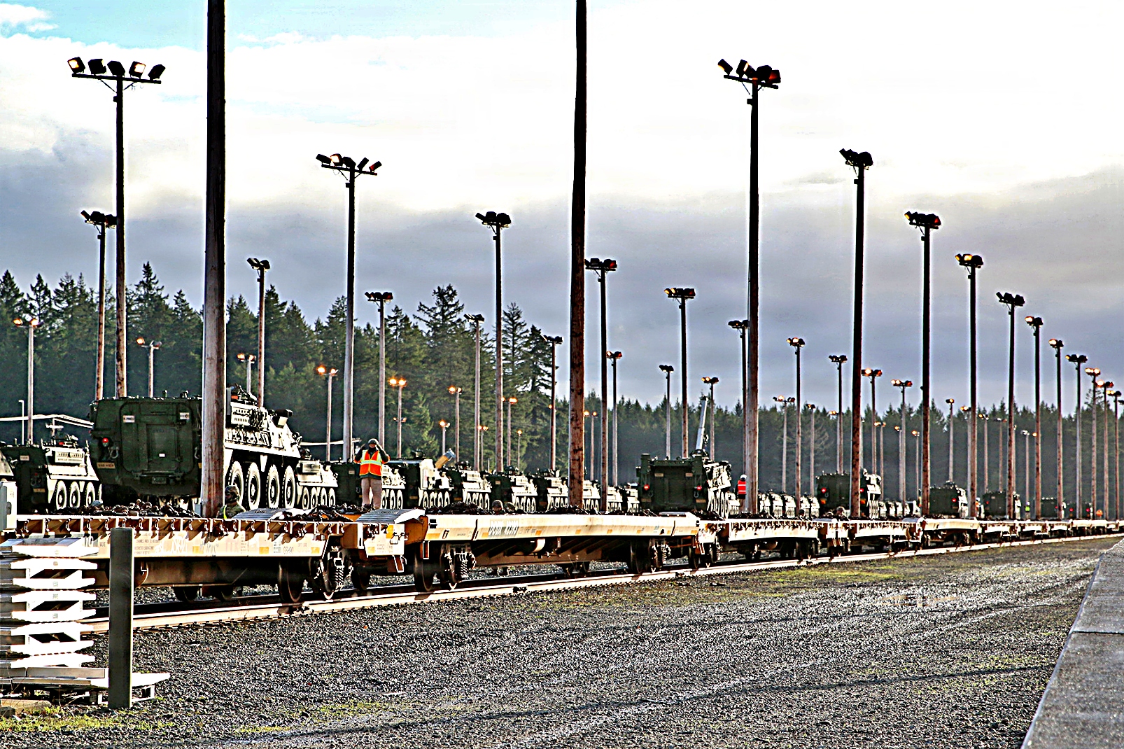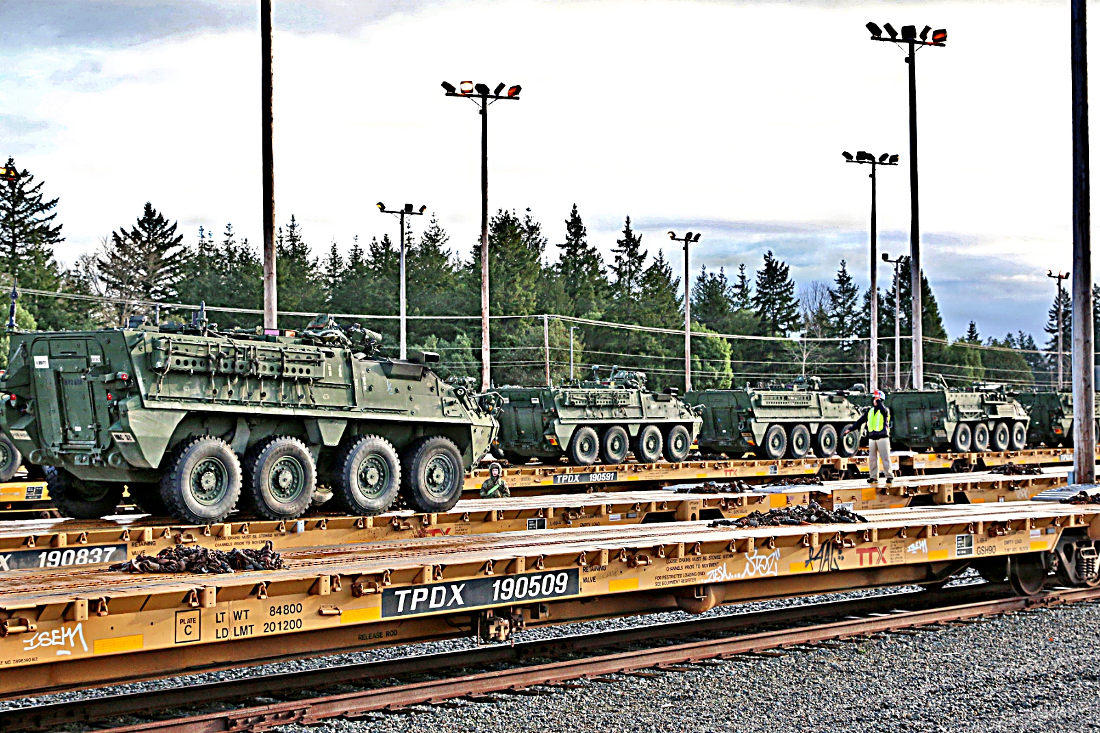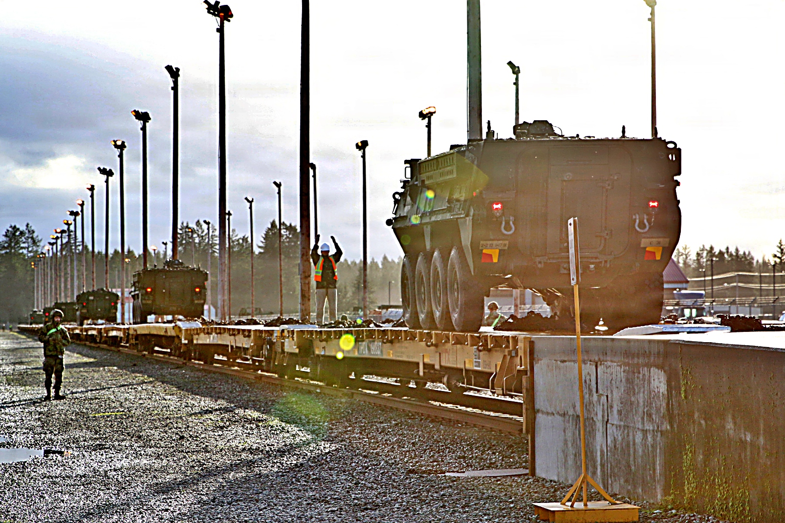 Stryker 장갑차와 장비들은 2025년 12월 19일, Lewis-McChord 합동기지(JBLM)에서 철도를 이용하여 항국까지 이동할 수 있도록 준비했다.(미육군사진)