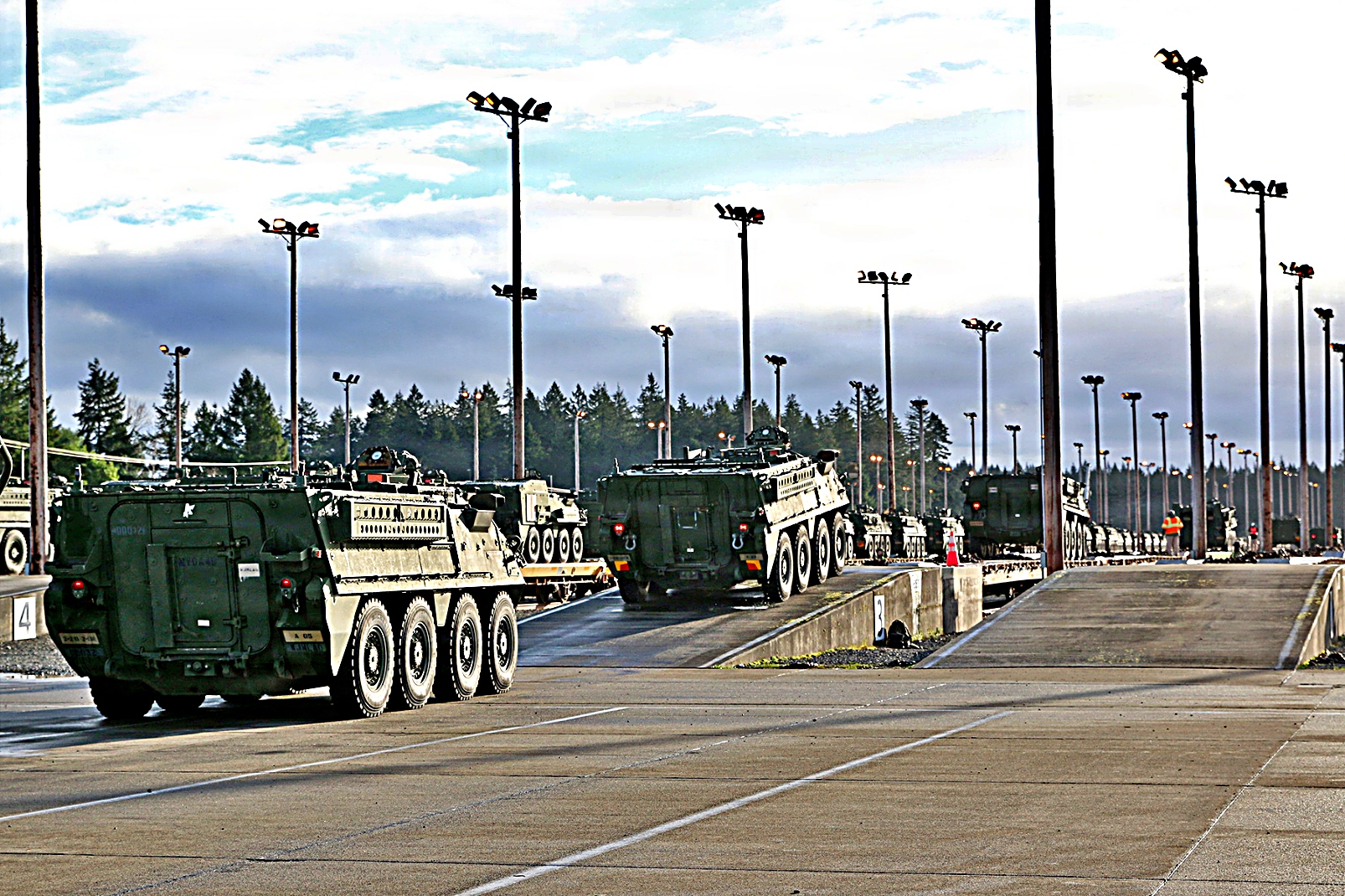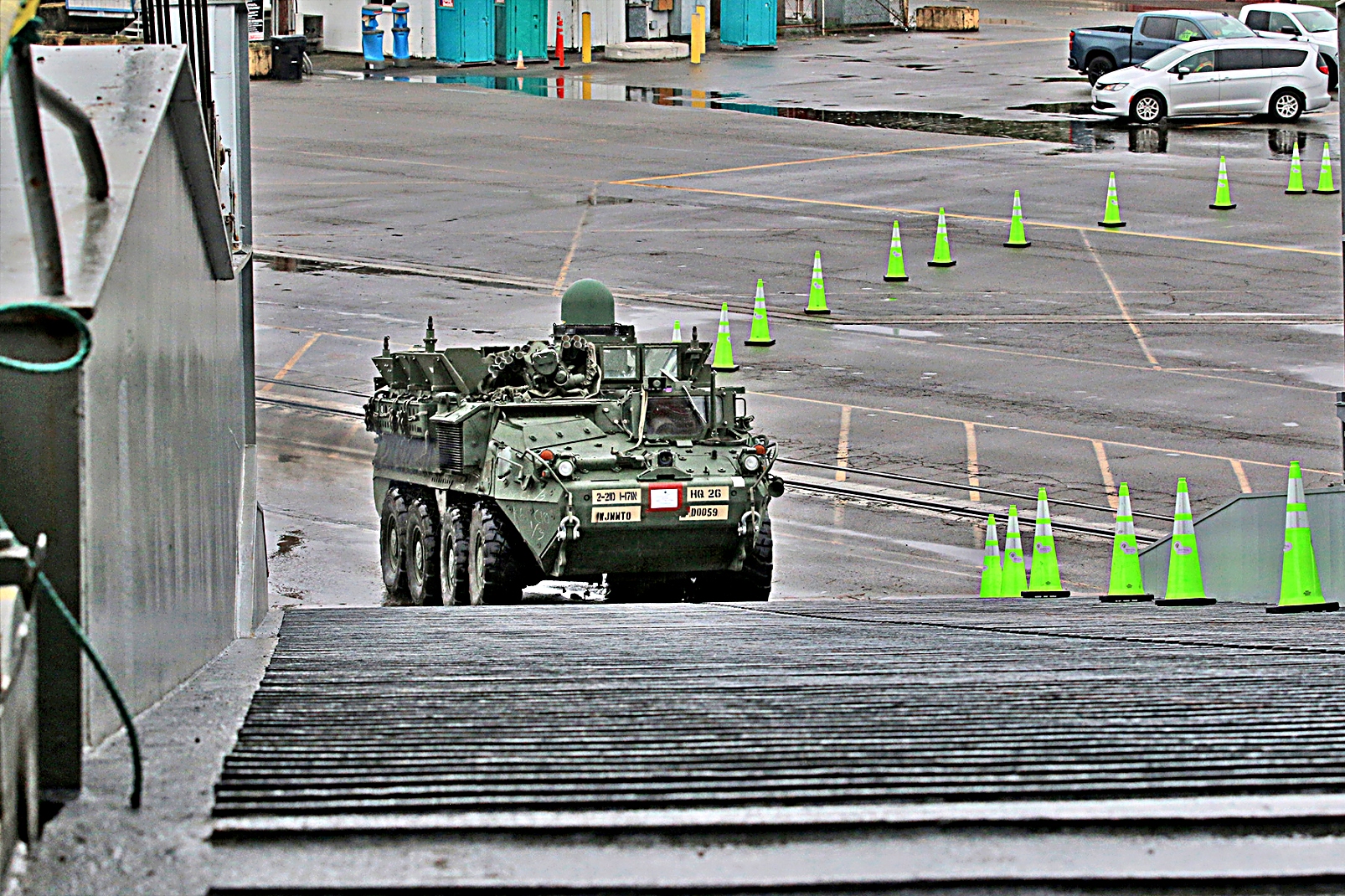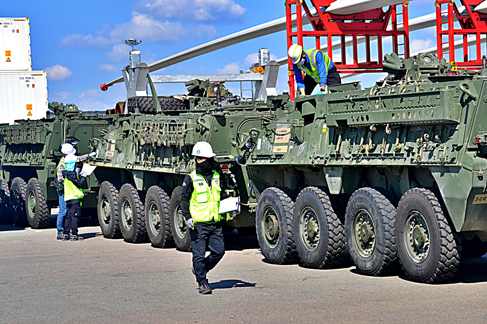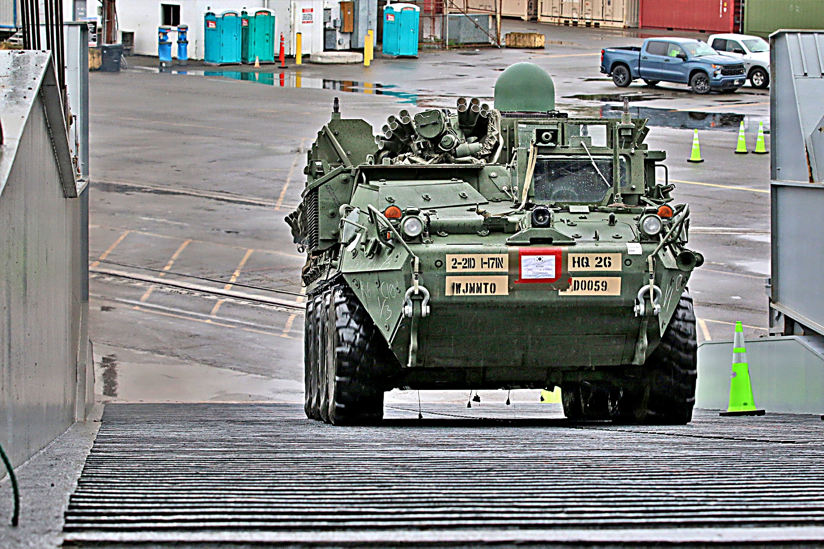 2026년 1월 7일 워싱턴주 Lewis-McChord 합동기지(JBLM)의 제593군수지원사령부 장병들이 제2스트라이커여단전투팀(2nd Stryker Brigade Combat Team)의 한국 순환 배치를 앞두고 기지 수송부대(IDT) 야드에서 워싱턴주 Tacoma 항으로 장갑차등의 장비를 수송하고 이후 하역 작업자들이 스트라이커 장갑차와 컨테이너를 선박에 선적했다.(미육군 사진)
