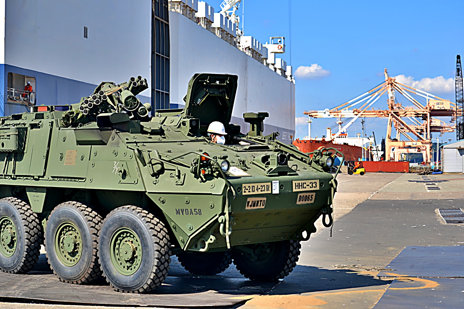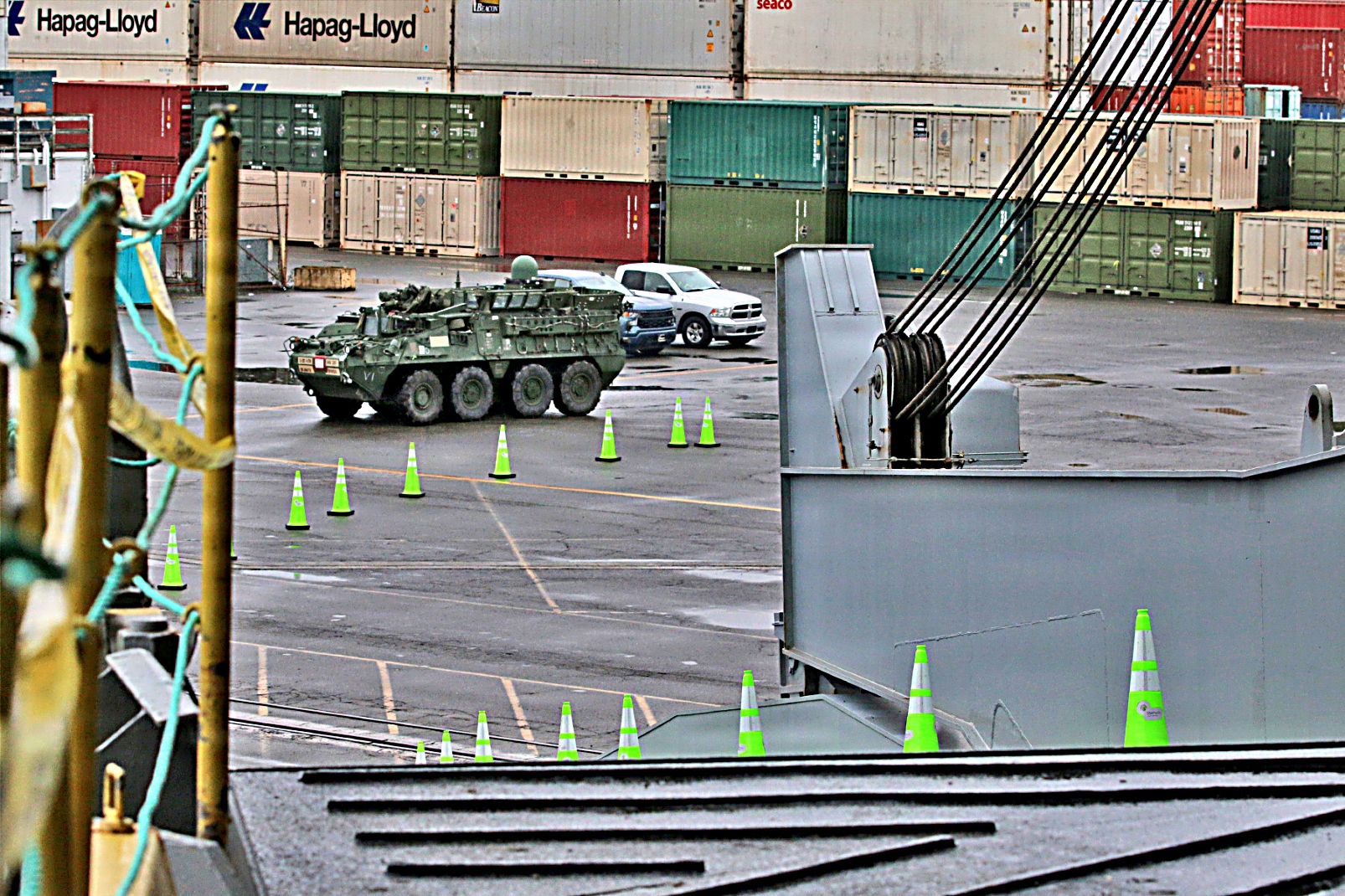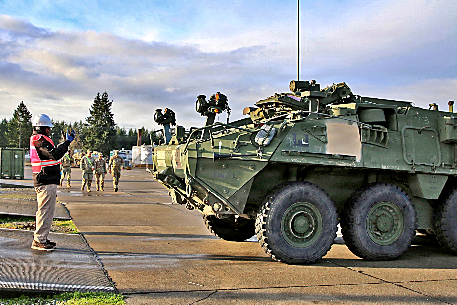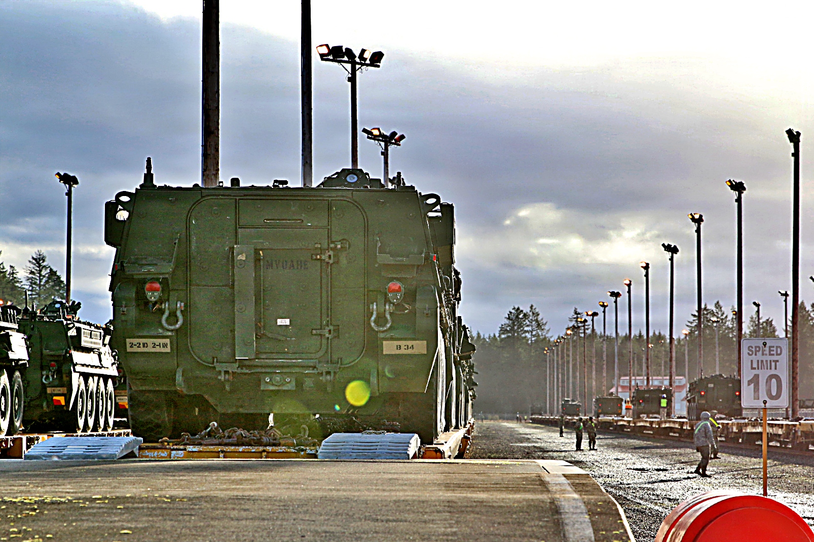 2026년 1월 7일 워싱턴주 Lewis-McChord 합동기지(JBLM)의 제593군수지원사령부 장병들이 제2스트라이커여단전투팀(2nd Stryker Brigade Combat Team)의 한국 순환 배치를 앞두고 기지 수송부대(IDT) 야드에서 워싱턴주 Tacoma 항으로 장갑차등의 장비를 수송하고 이후 하역 작업자들이 스트라이커 장갑차와 컨테이너를 선박에 선적했다.(미육군 사진)