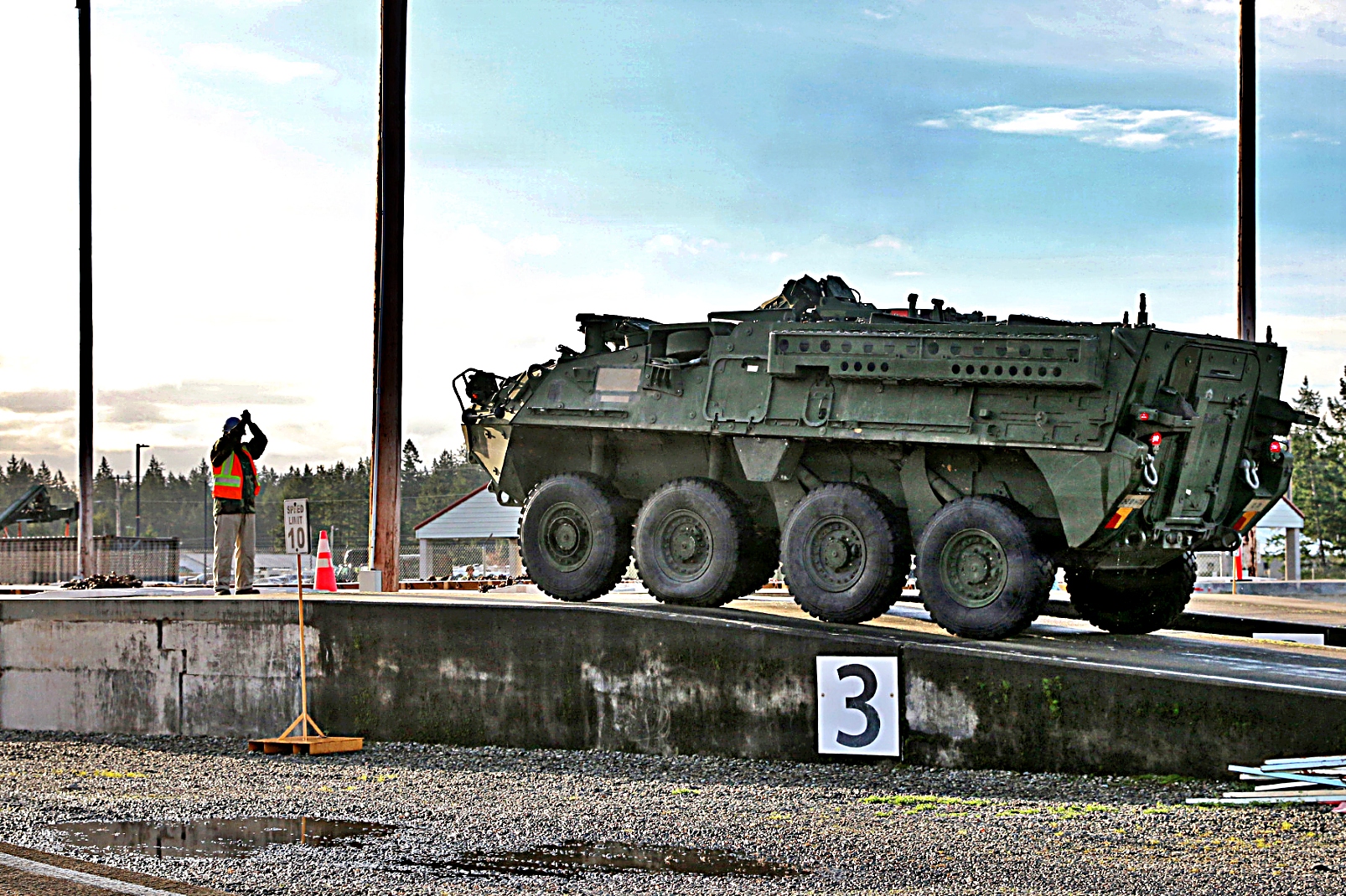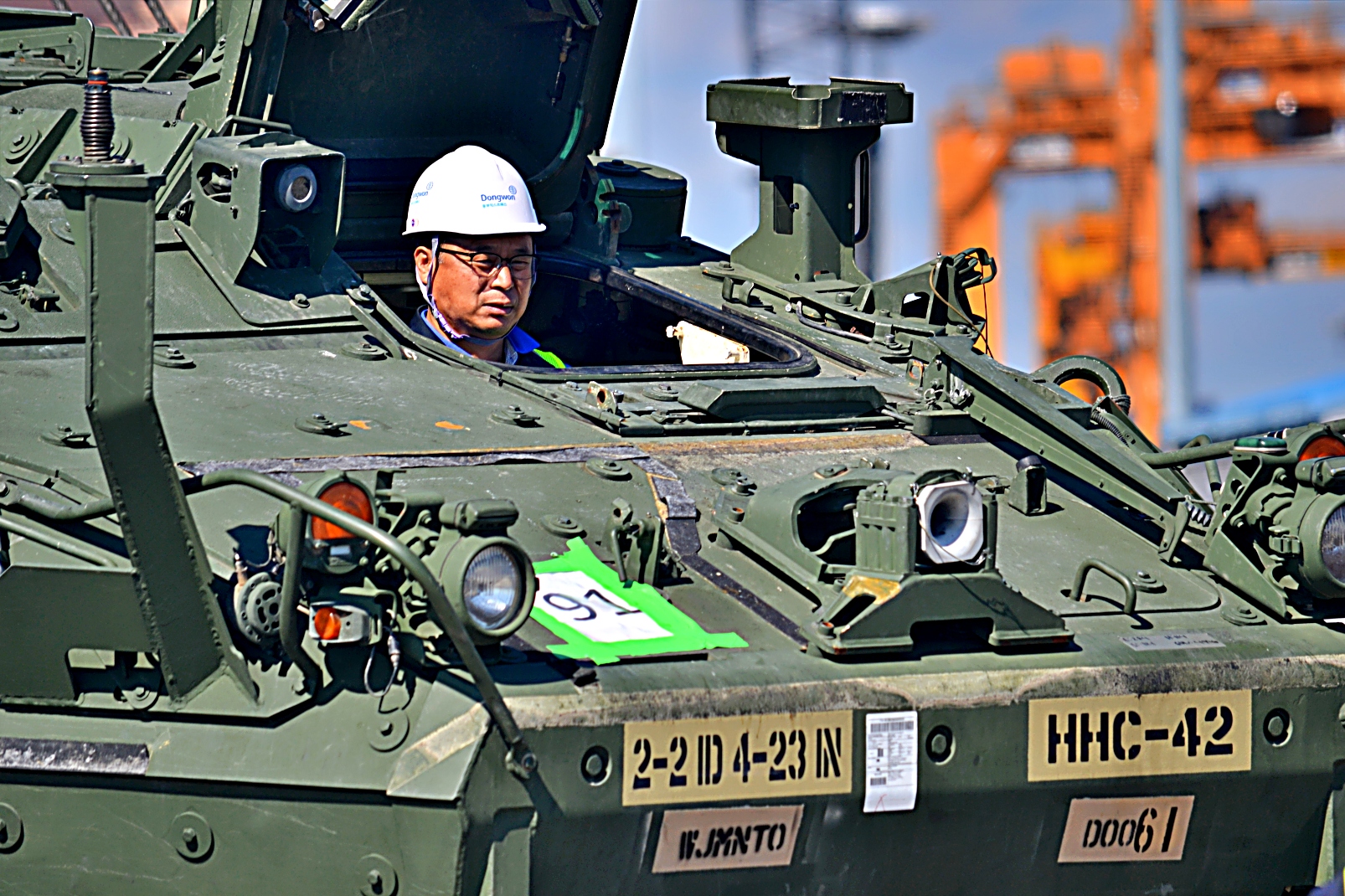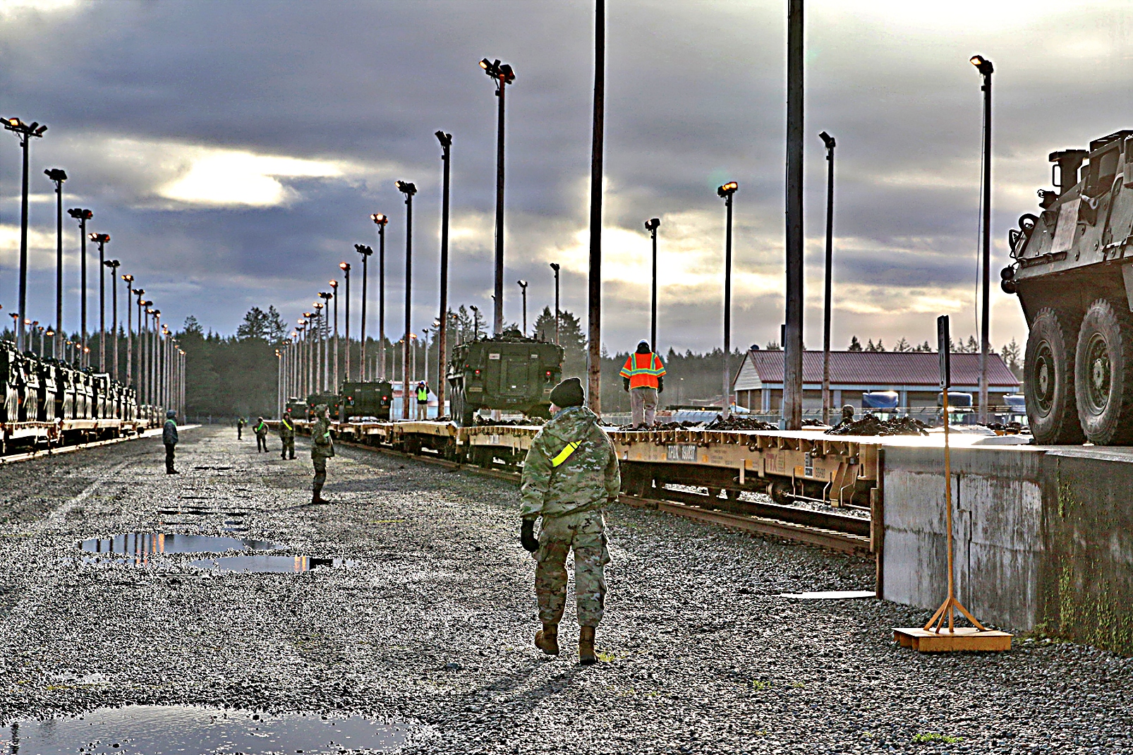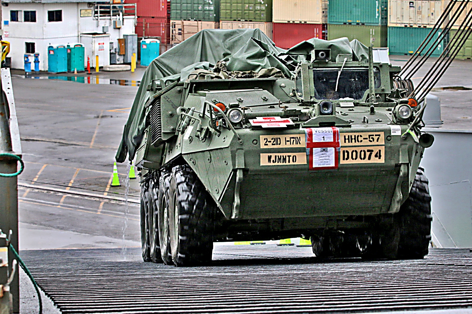 2026년 1월 7일 워싱턴주 Lewis-McChord 합동기지(JBLM)의 제593군수지원사령부 장병들이 제2스트라이커여단전투팀(2nd Stryker Brigade Combat Team)의 한국 순환 배치를 앞두고 기지 수송부대(IDT) 야드에서 워싱턴주 Tacoma 항으로 장갑차등의 장비를 수송하고 이후 하역 작업자들이 스트라이커 장갑차와 컨테이너를 선박에 선적했다.(미육군 사진)